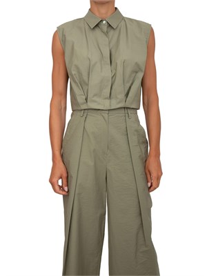 Camicia cropped iBlues realizzata in tessuto tech dal taglio elegante con arricciatura e pieghe sul fondo. Desing smanicato con colletto e chiusura con bottoni nascosti e contropiega sul retro. La modella è alta 1.72 e indossa la taglia 40.