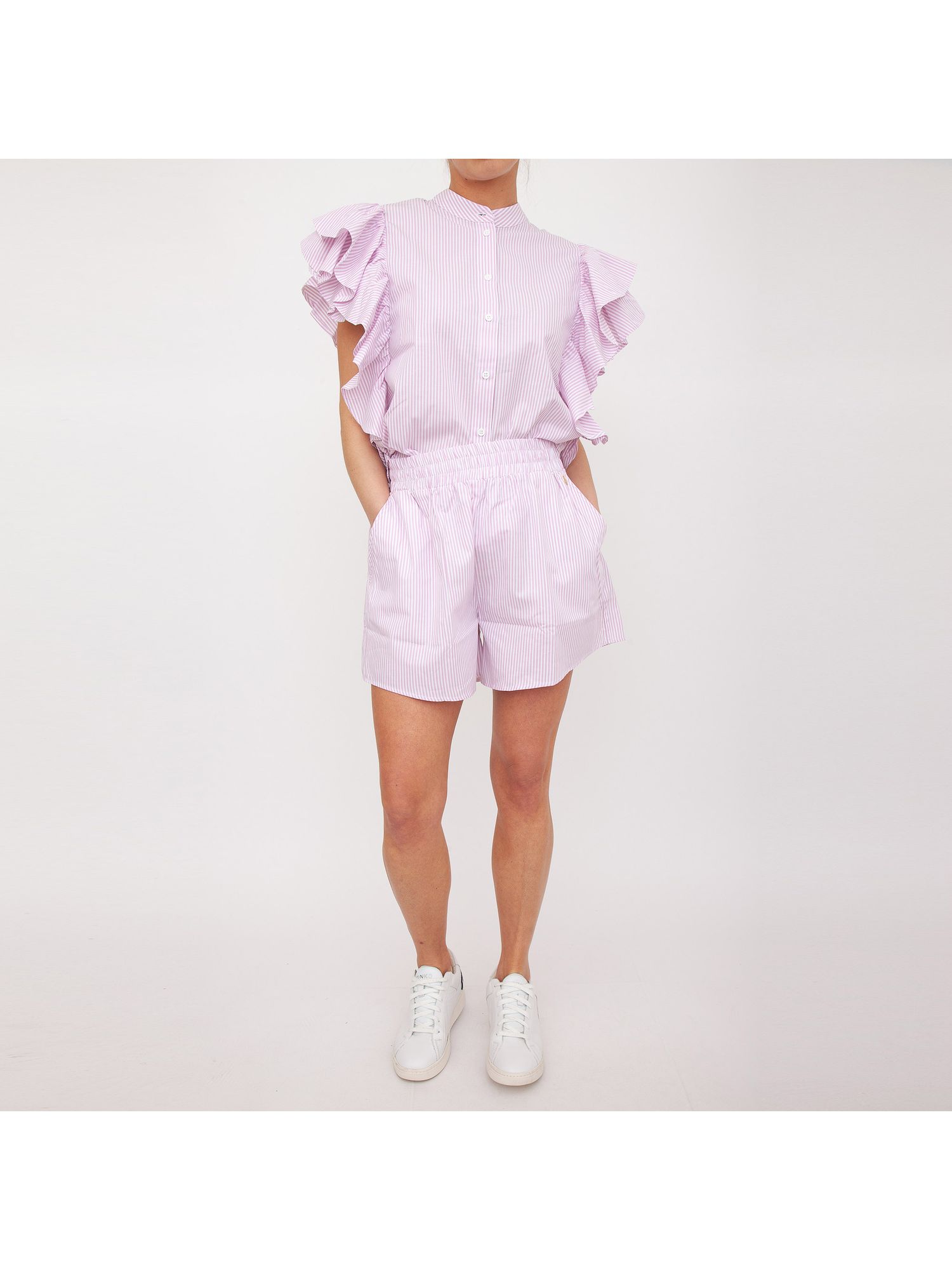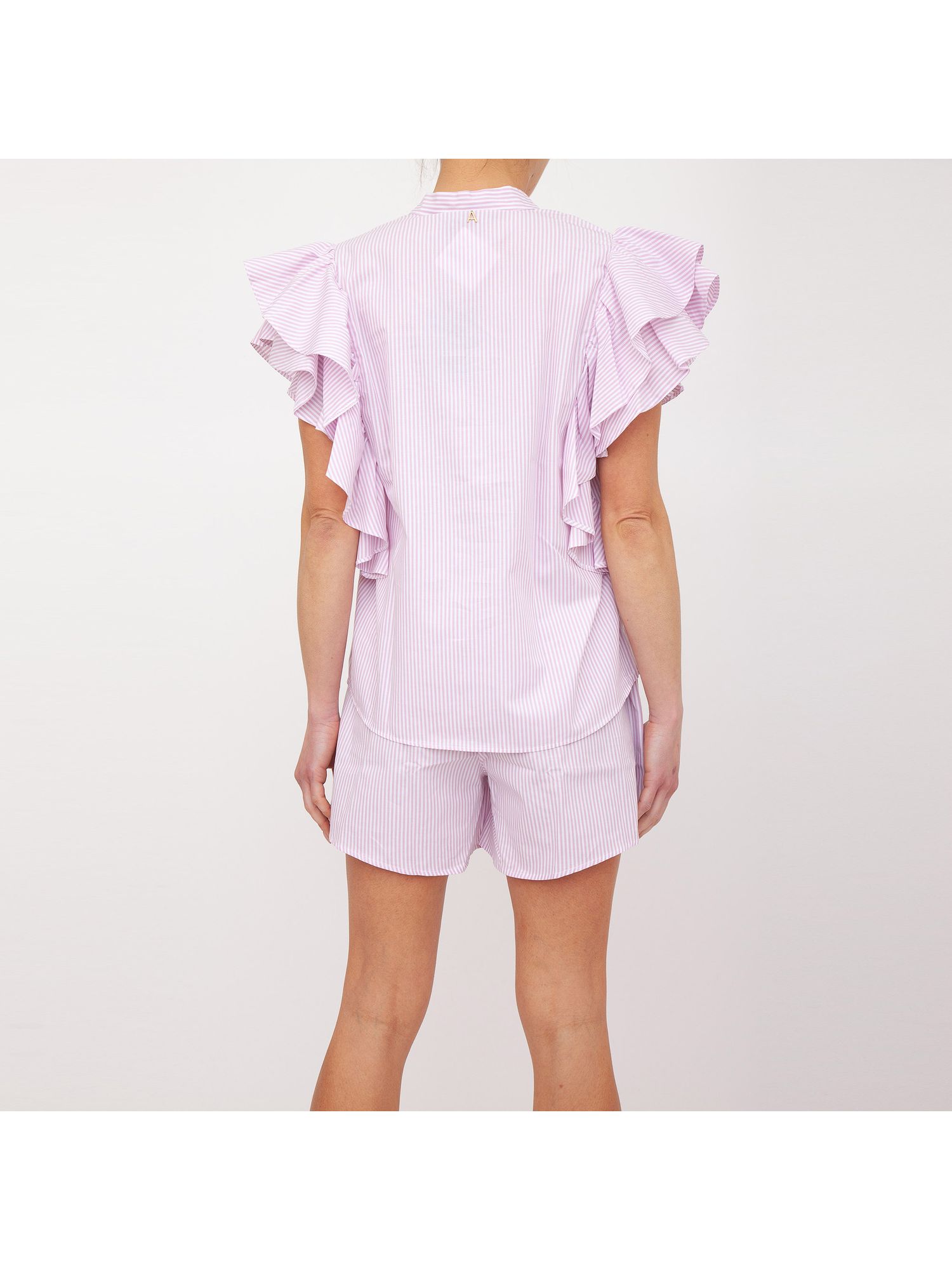 Camicia Twinset Actitude in cotone rigato con collo alla coreana e volants sul giromanica.