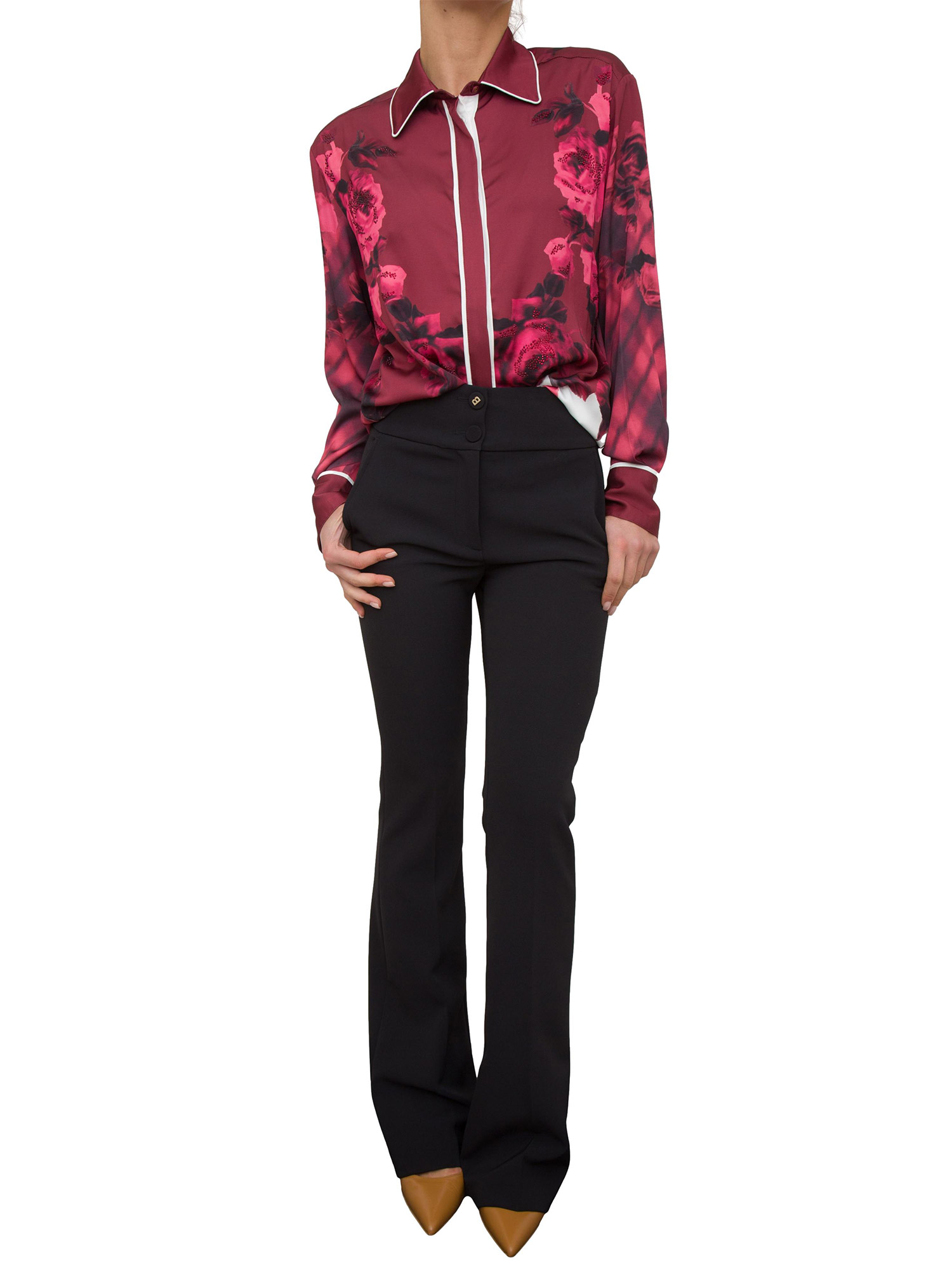 Camicia Blugirl realizzata in raso fluido con stampa piazzata a rose e strass. Dalla linea dritta, colletto classico, maniche lunghe, polsi con bottoni e chiusura con bottoni, è perfetta da abbinare a look formali ma anche il denim.