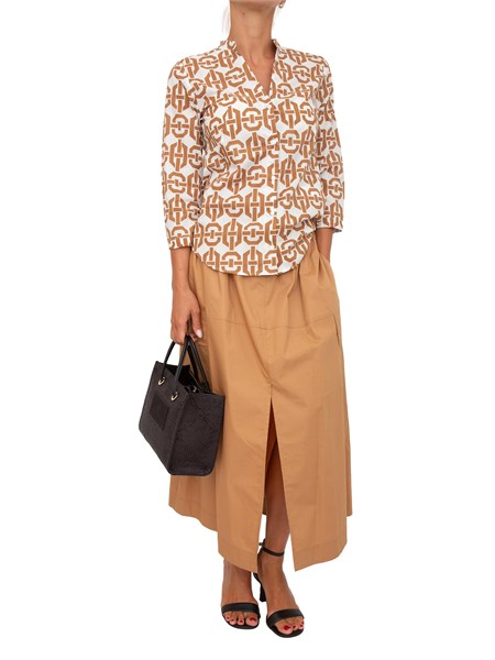 Camicia cropped Elisabetta Franchi realizzata in popeline di cotone con maniche lunghe e taglio boxy con elastico interno sulla vita. Si distingue per il taschino con logo ricamato. I bottoni in metallo dorato con logo decorano colletto e polsi. Vestibilità regular. La modella è alta 1.72 e indossa la taglia 40.