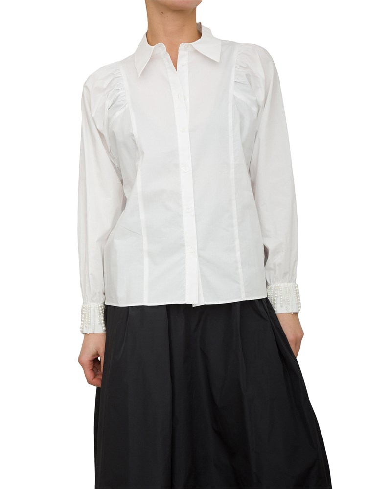 Elegante camicia KOCCA realizzata in cotone fresco e leggero, con spalle arricciate e polsini decorati da perle pendenti. Ideale per tutti i tuoi look, da quello casual a quello elegante o da cerimonia.