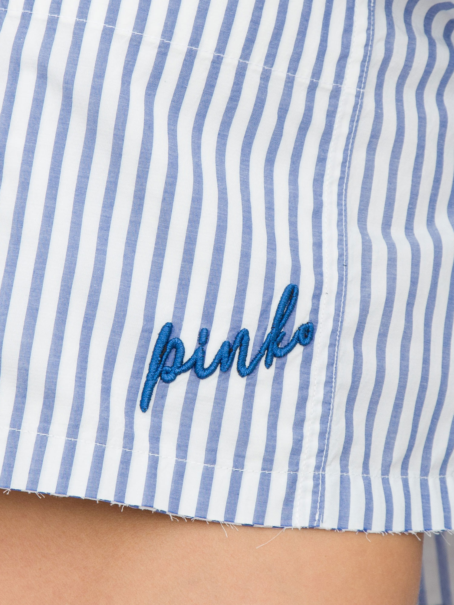 Camicia corta in cotone tinto in filo con disegno a righe verticali. Colletto classico, maniche lunghe e taschini applicati. Logo PINKO ricamato davanti. Chiusura con bottoni.La modella è alta 1.72 e indossa la taglia 40.