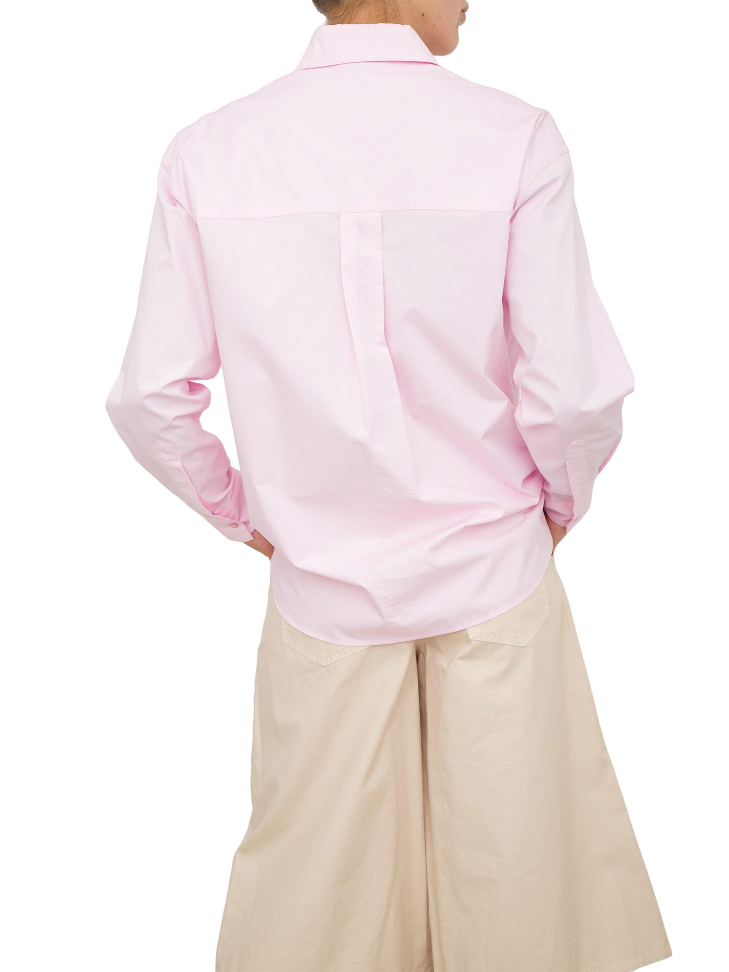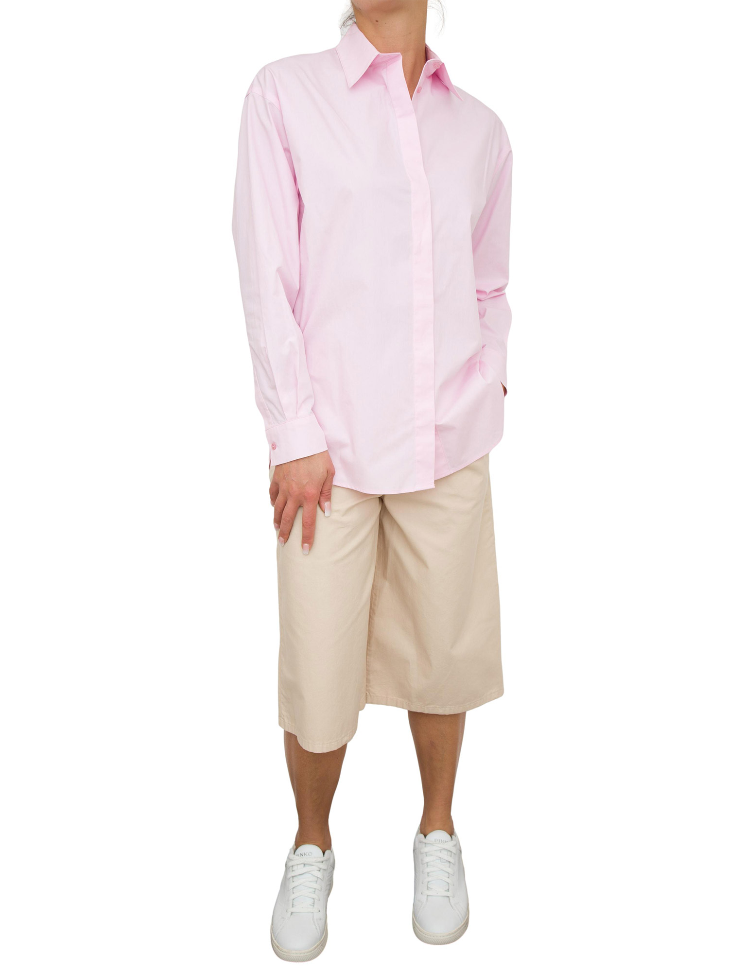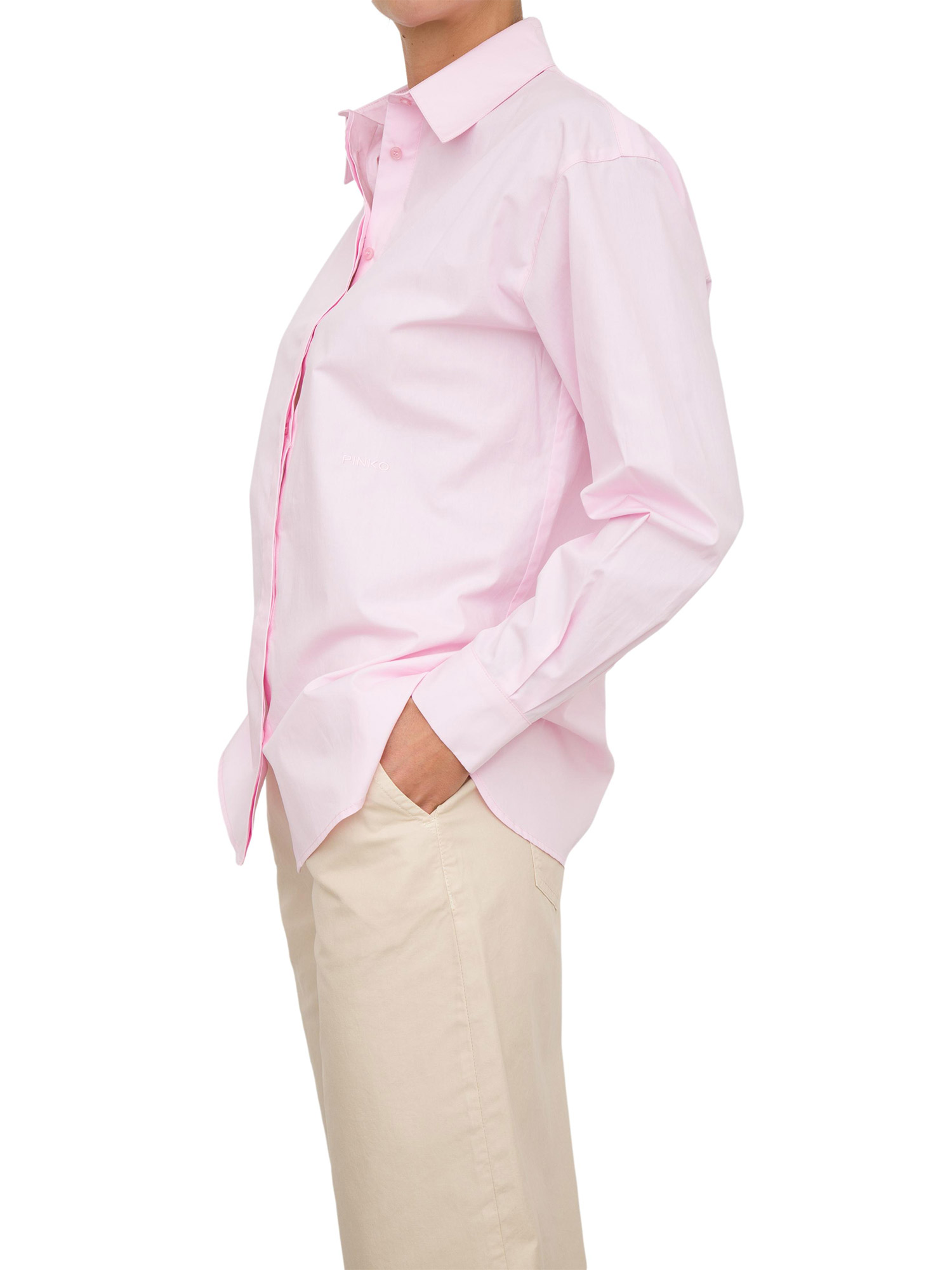 Camicia dal taglio classico, dal volume leggermente oversize, in popeline 100% cotone. Colletto classico e maniche lunghe con polsino al fondo. Mini logo PINKO ricamato davanti. Chiusura coperta con bottoni davanti, soltanto il primo è visibile.La modella è alta 1.72 e indossa la taglia 40.