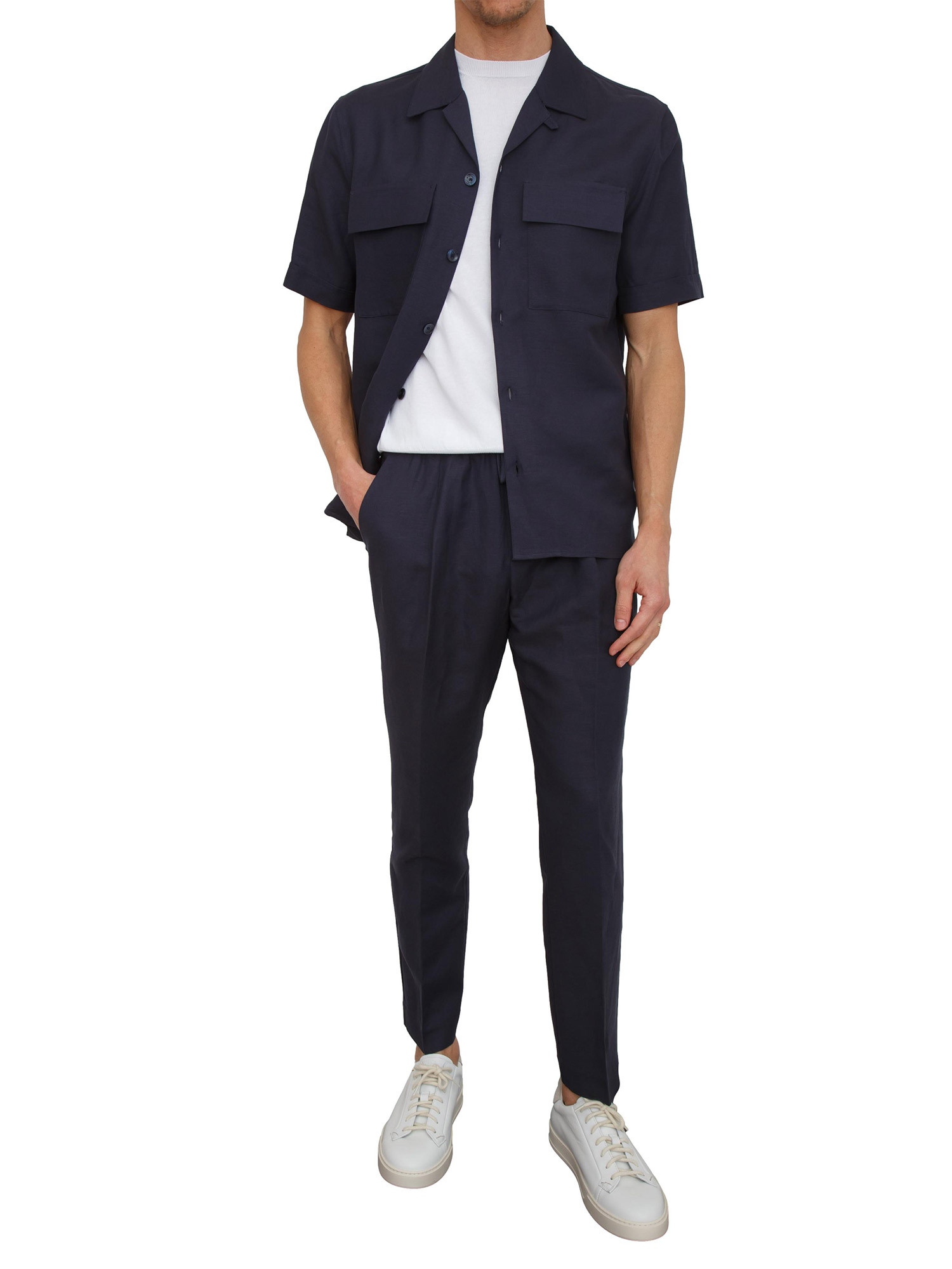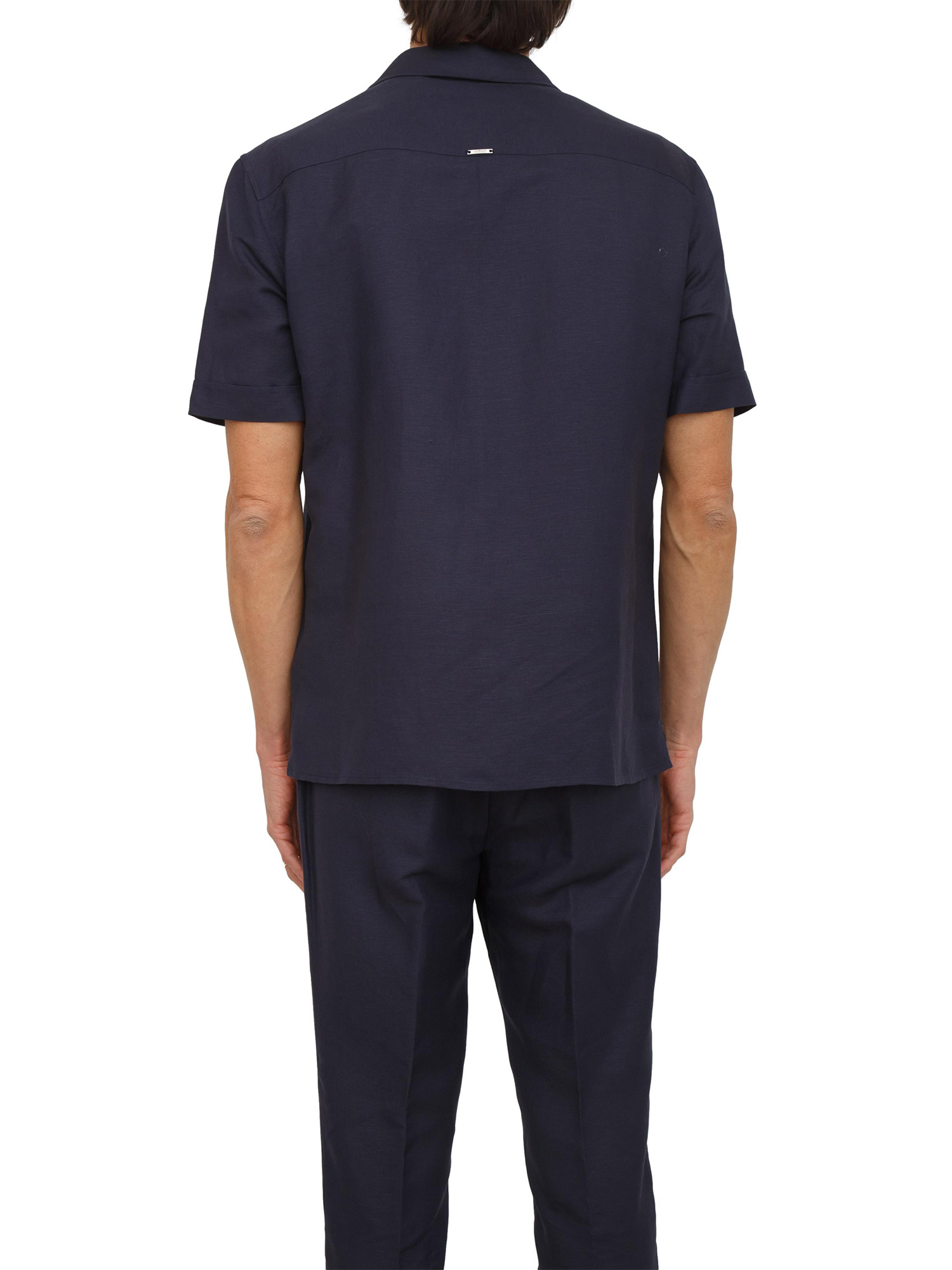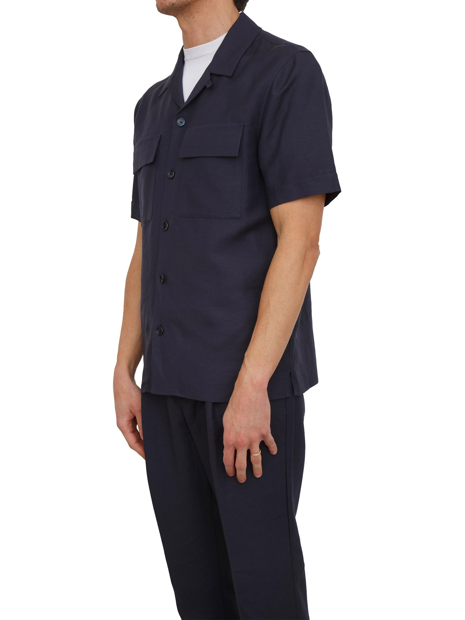 Camicia uomo Antony Morato realizzata in misto lino e viscosa dalla vestibilità regular. Design a maniche corte con chiusura bottoni ton sur ton, tasche con patta applicate sul petto e placchetta logo sul retro. Il modello è alto 1.90m e indossa la taglia 48.