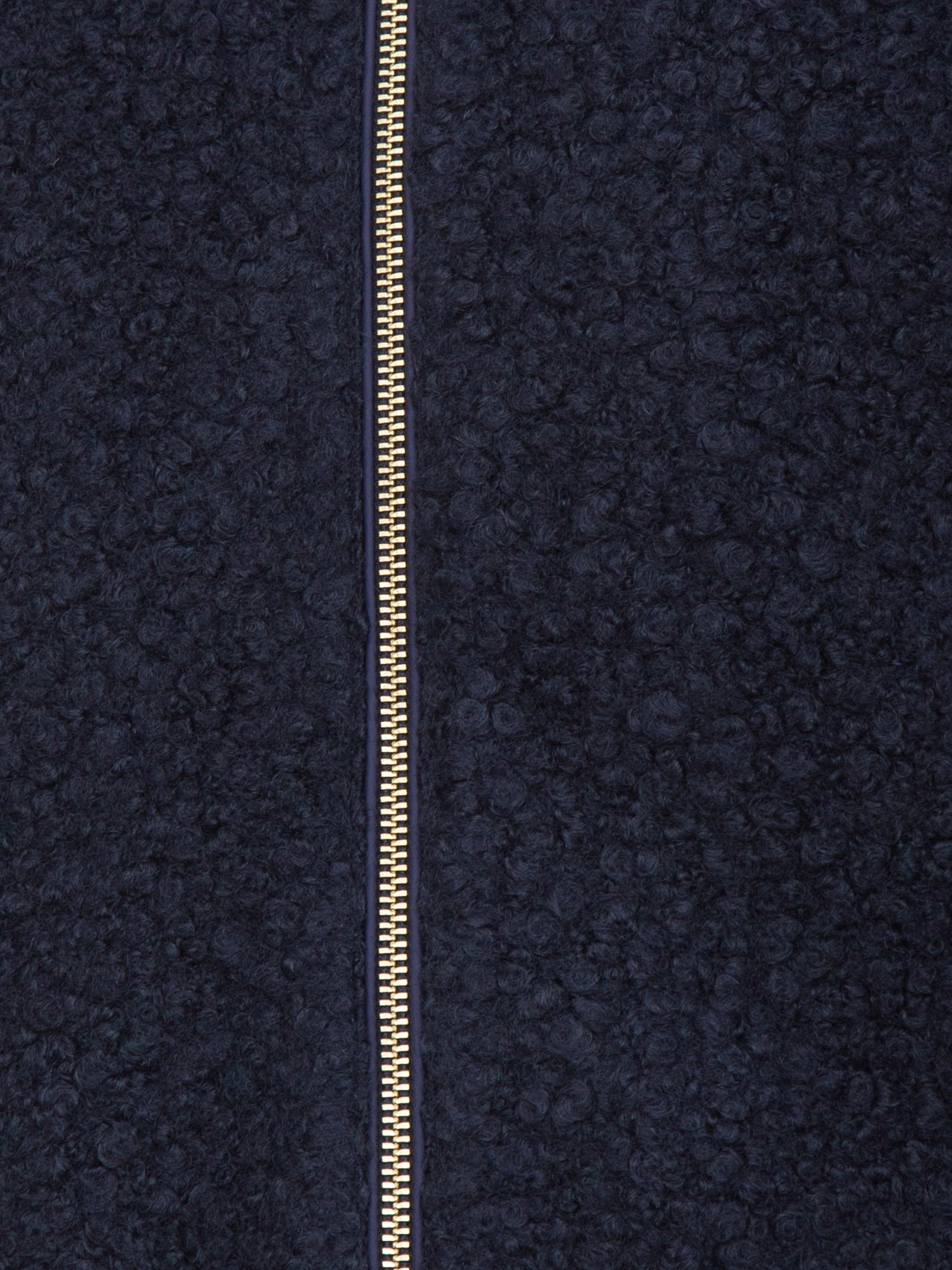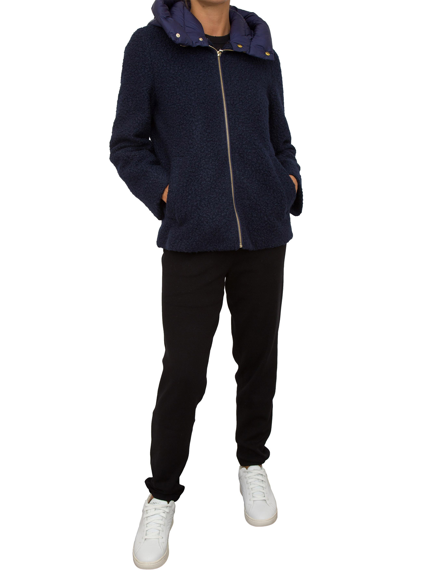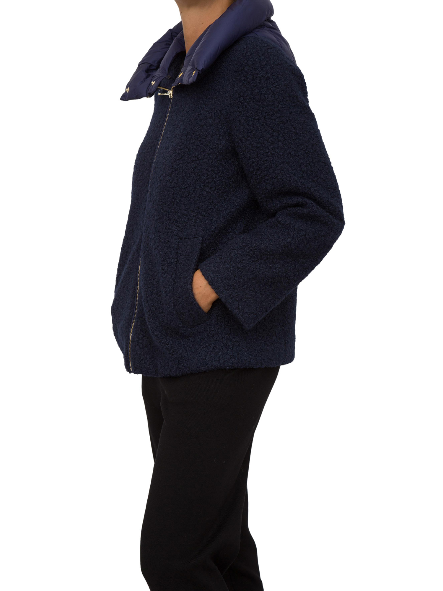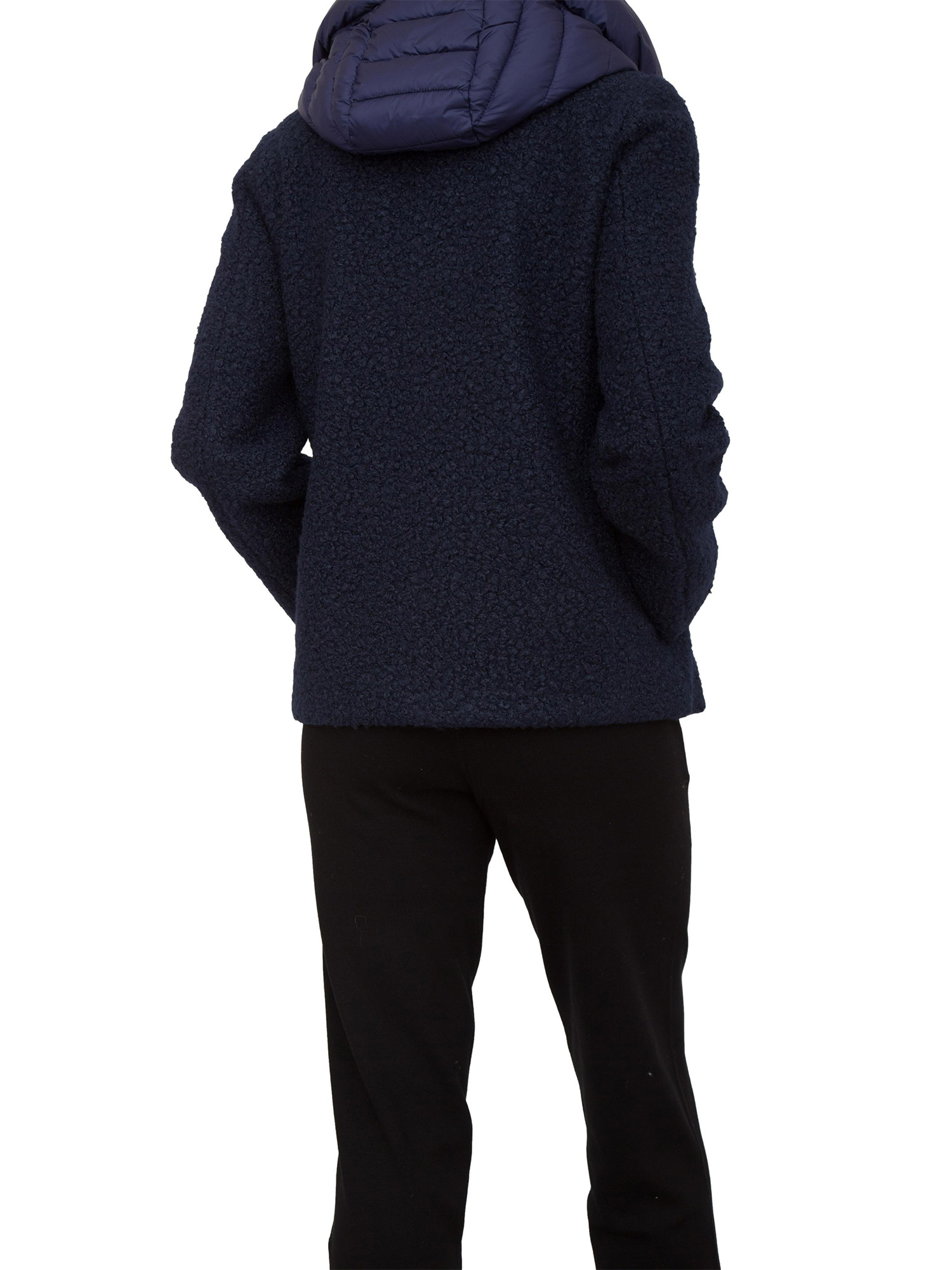 Caban in jersey bouclé Emme Marella, dettagli in nylon, linea dritta, lunghezza sotto i fianchi, collo con cappuccio imbottito rimovibile con bottoni, maniche lunghe, chiusura con zip dorata, tasche a filetto e fodera in tessuto tecnico.