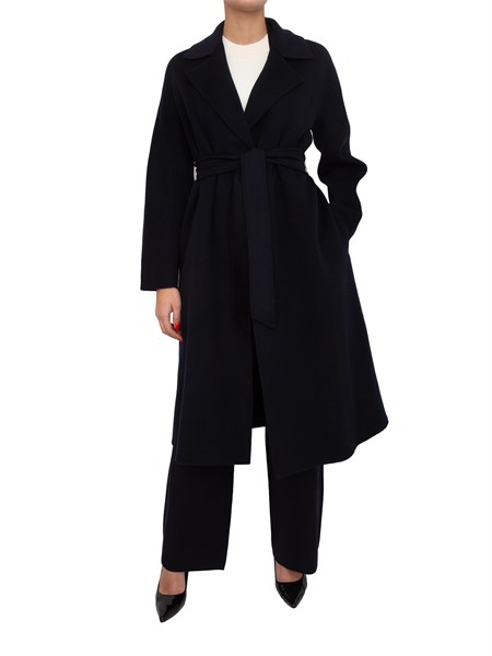 Cappotto Marella in double misto lana, linea dritta. Collo a rever, maniche lunghe. Chiusura a doppiopetto, tasche inserite sul fianco. Spacco centrale sul retro. Sfoderato. Cintura coordinata.