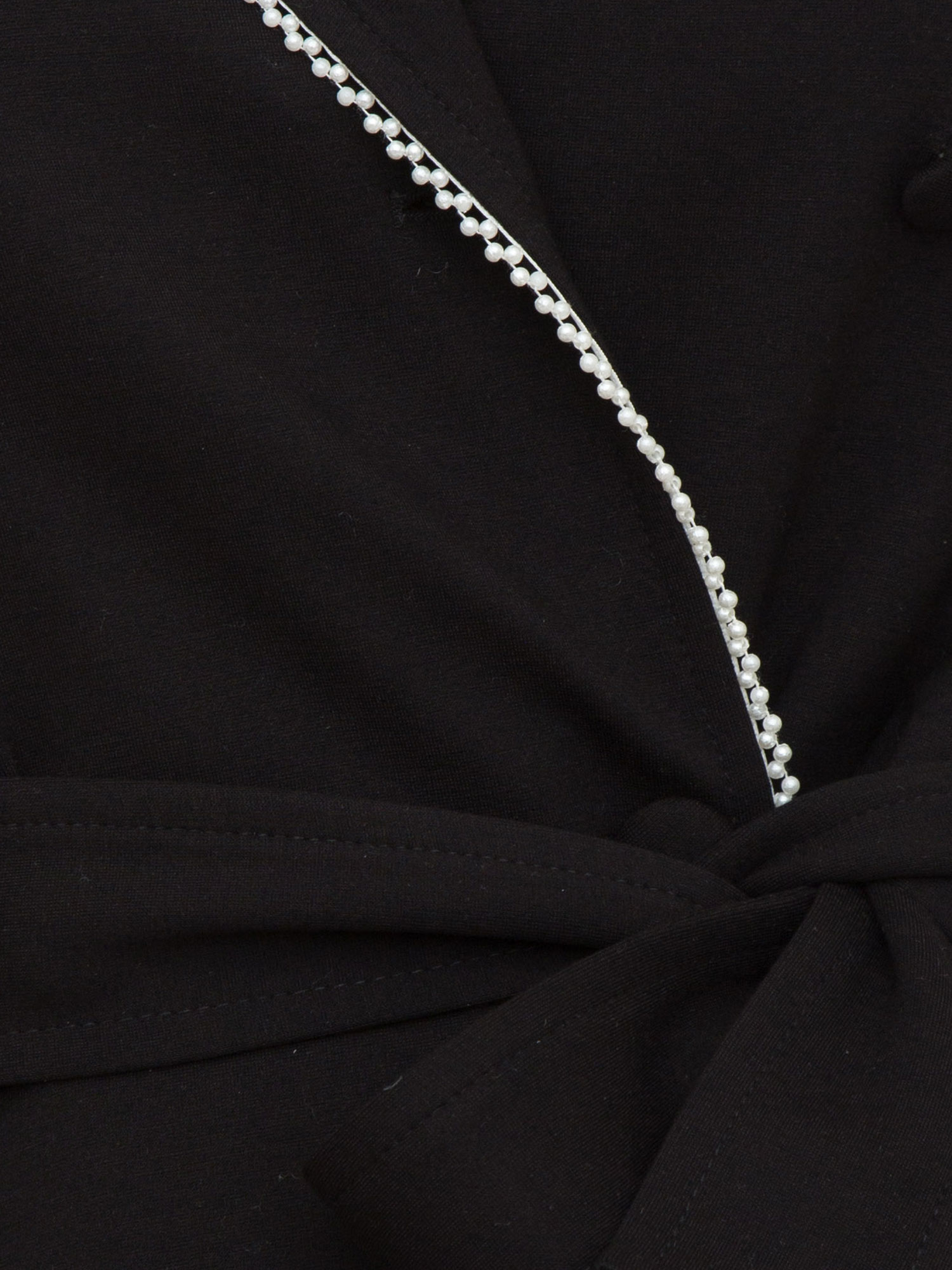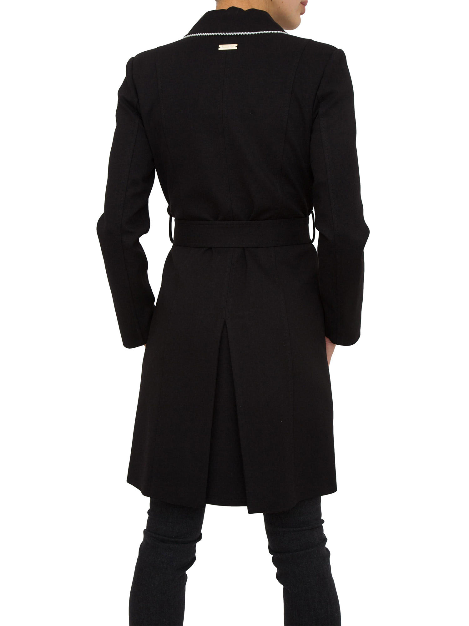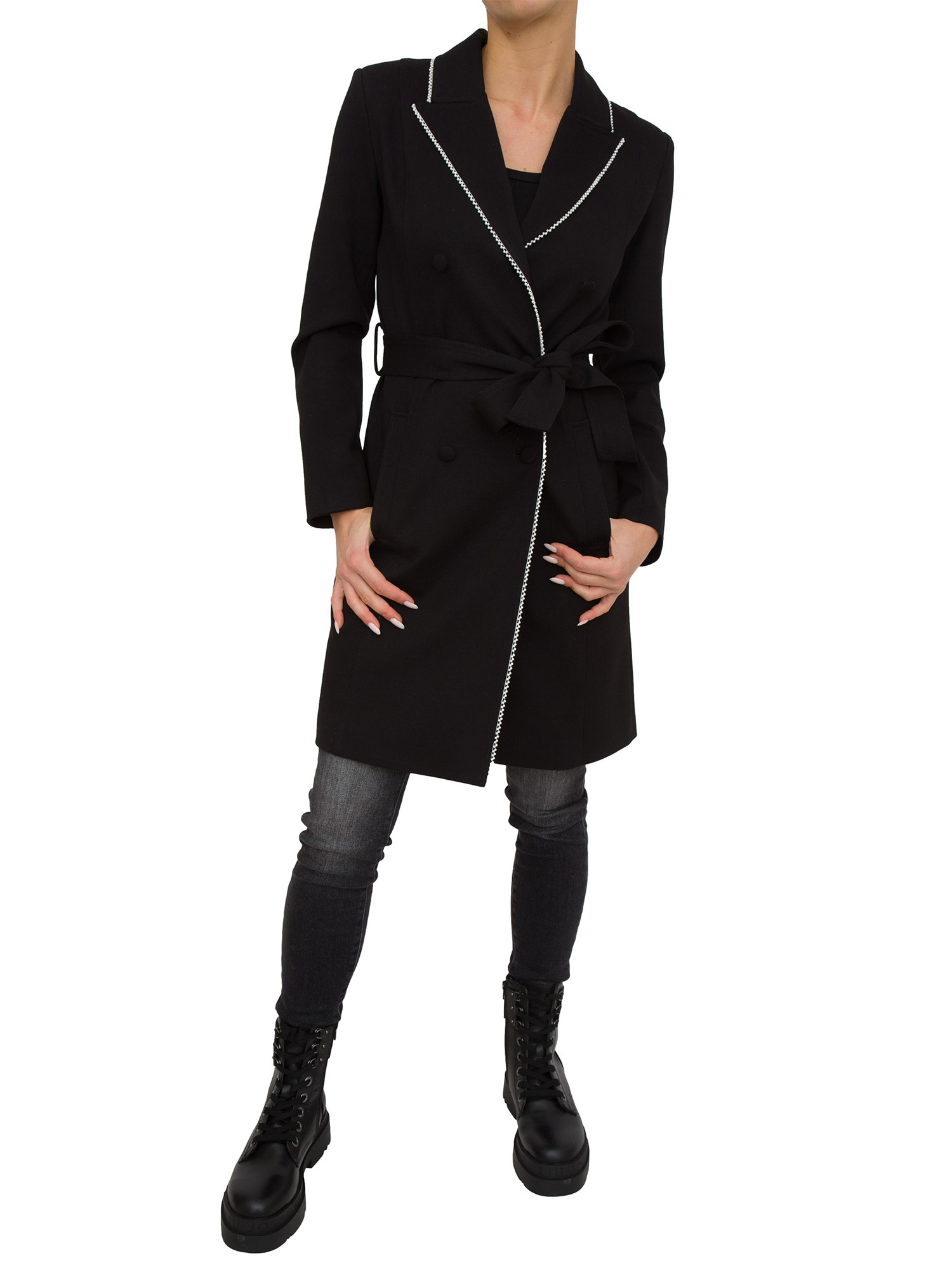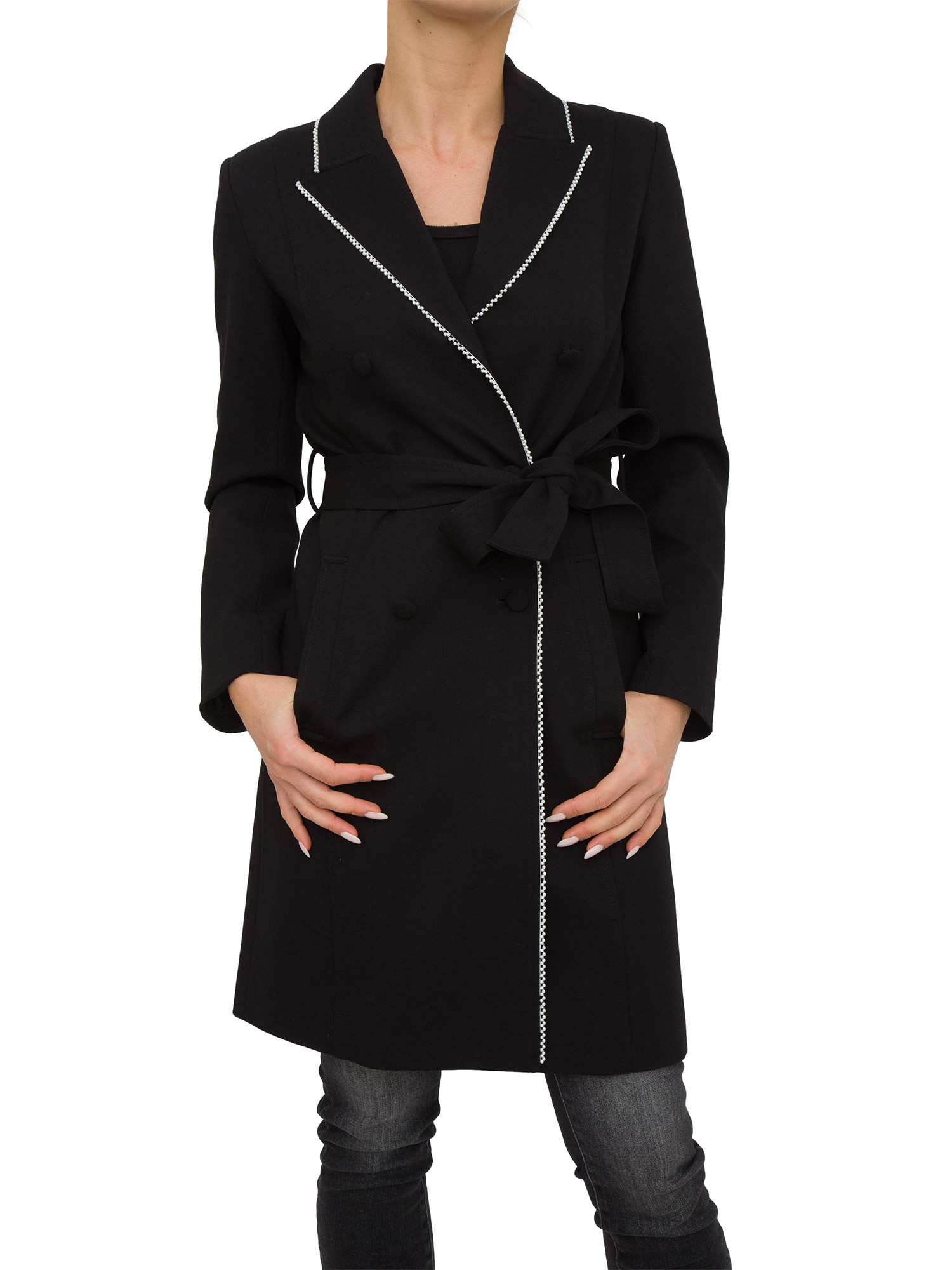 Trench doppiopetto da donna Twinset in punto Milano con passamaneria di perline, collo con revers, tasche a filetto, chiusura con bottoni, spacco sul retro.