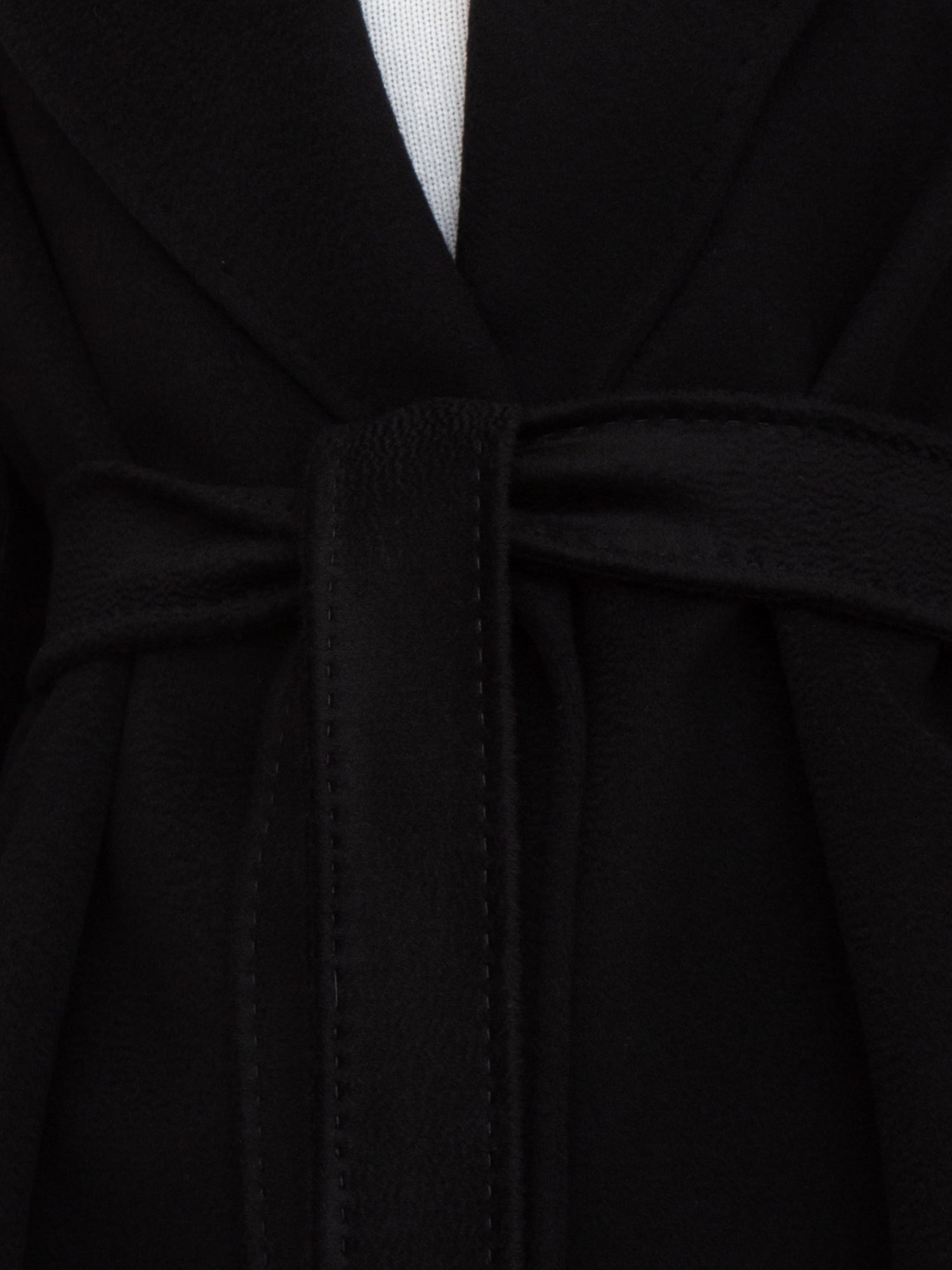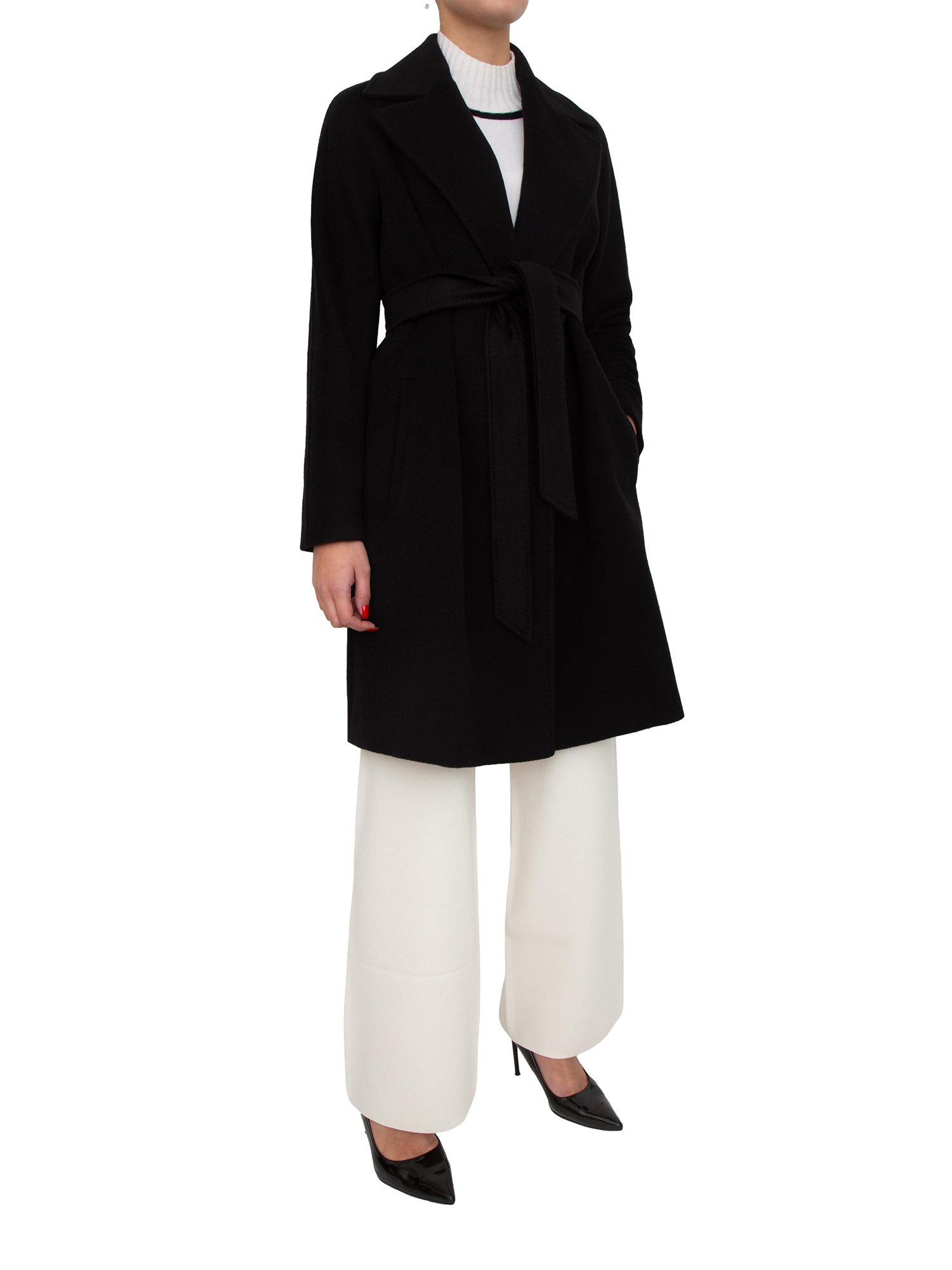 Cappotto Dravenna di Max Mara modello midi a vestaglia interamente rifinito con puntino sartoriale. Realizzato in drap di pura lana con linea svasata e collo a rever. Dotato di tasche a filetto sui fianchi, fodera interna e cintura abbinata. La modella è alta 1.77 e indossa la taglia 40.