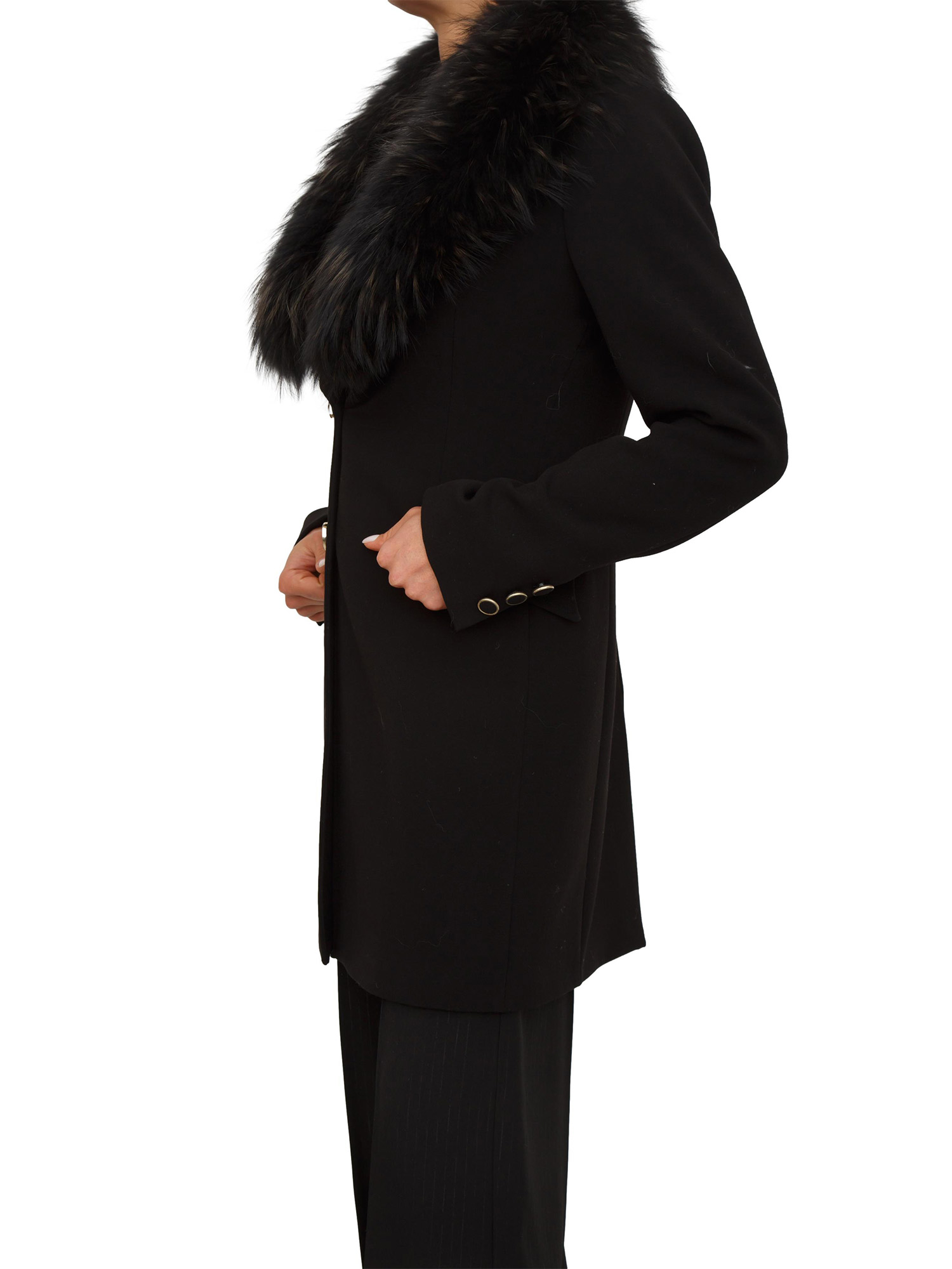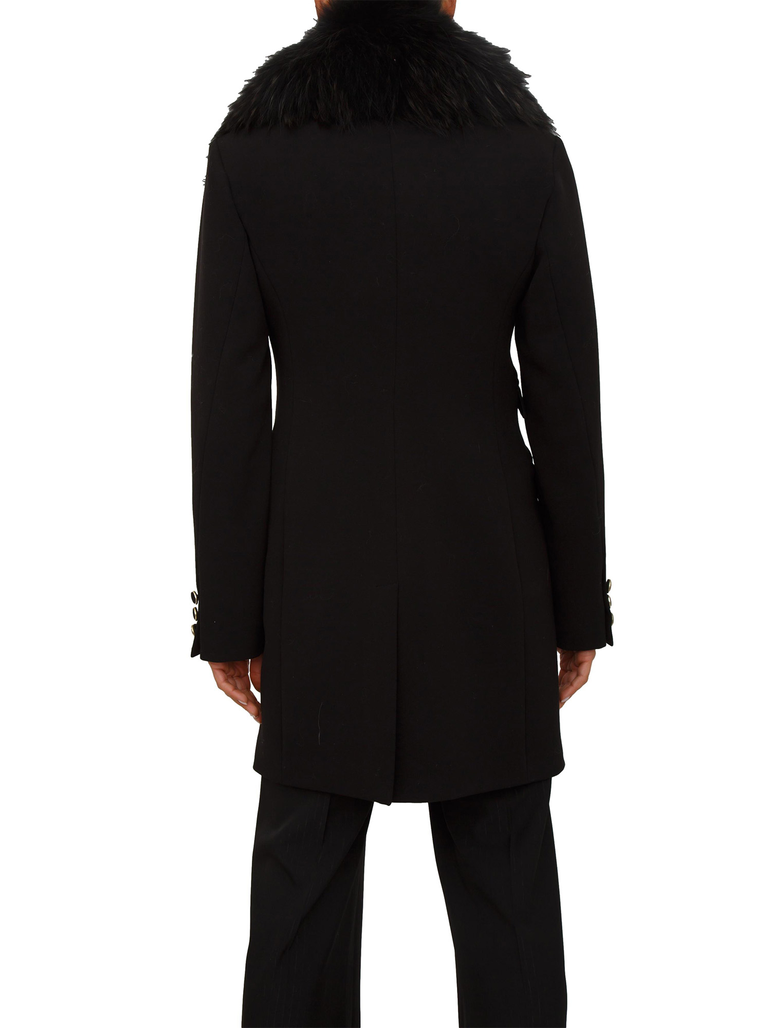 Taglio sartoriale per questo cappotto Jolukafur di Kocca impreziosito dal collo in pelliccia e dalle tasche con pattina che regalano stile e movimento al capo. Il modello presenta una vestibilità regolare e chiusura con bottoni rivestiti. La modella è alta 1.72 e indossa la taglia S.
