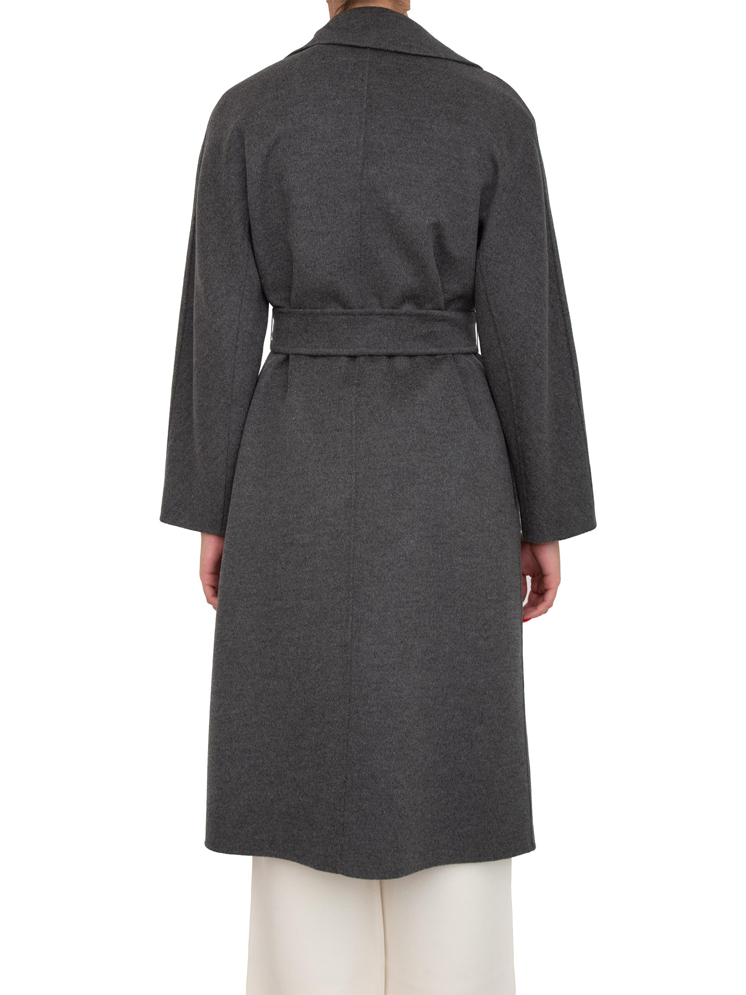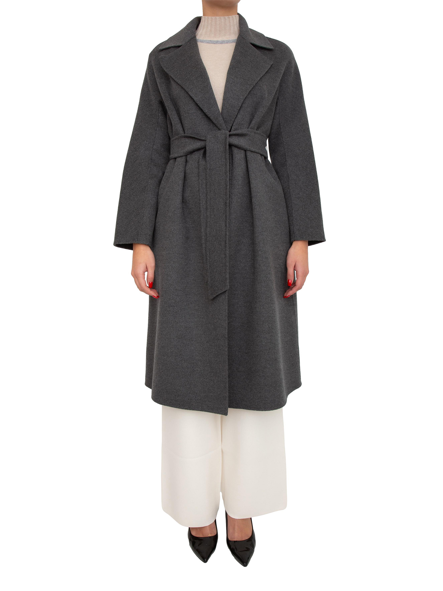 Cappotto midi Cles Max Mara modello a vestaglia sfoderato con cintura abbinata per evidenziare la silhouette. Realizzato in doppio drap di lana, cachemire e seta con volume avvolgente e collo a rever. Maniche lunghe a kimono e tasche laterali. La modella è alta 1.77 e indossa la taglia 40.