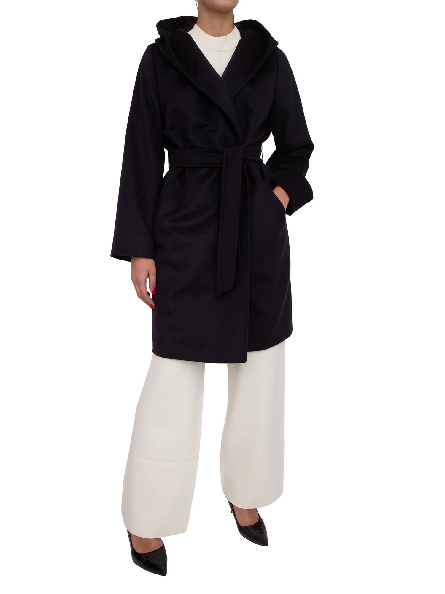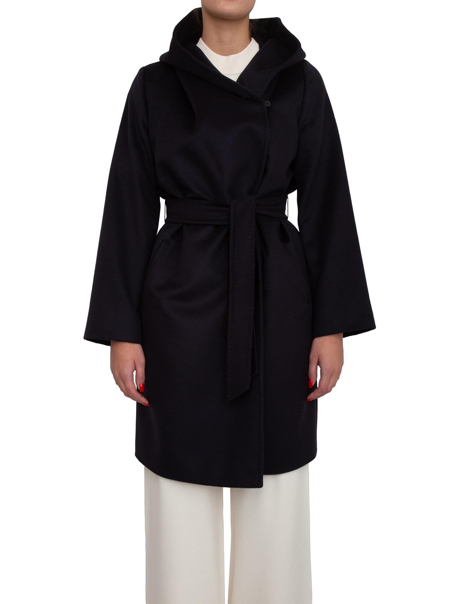 Cappotto midi Newmang Max Mara modello a vestaglia, caratterizzato da cappuccio ampio e linea avvolgente. Realizzato in doppio drap di pura lana, maniche lunghe a giro, chiusura con cintura abbinata e tasche a filettone sui fianchi. La modella è alta 1.77 e indossa la taglia 44.