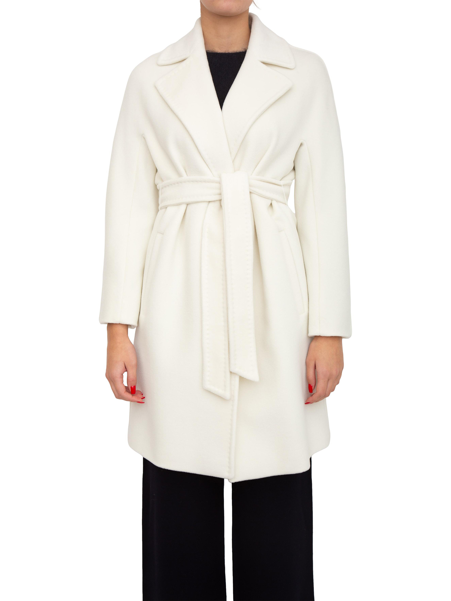 Cappotto midi Scire Max Mara modello a vestaglia realizzato in prezioso beaver di pura lana vergine, con dettagli classici e una costruzione sartoriale che accompagna le linee femminili. Collo a rever, linea dritta con cintura in vita, tasche a filetto e maniche a kimono. La modella è alta 1.77 e indossa la taglia 40.