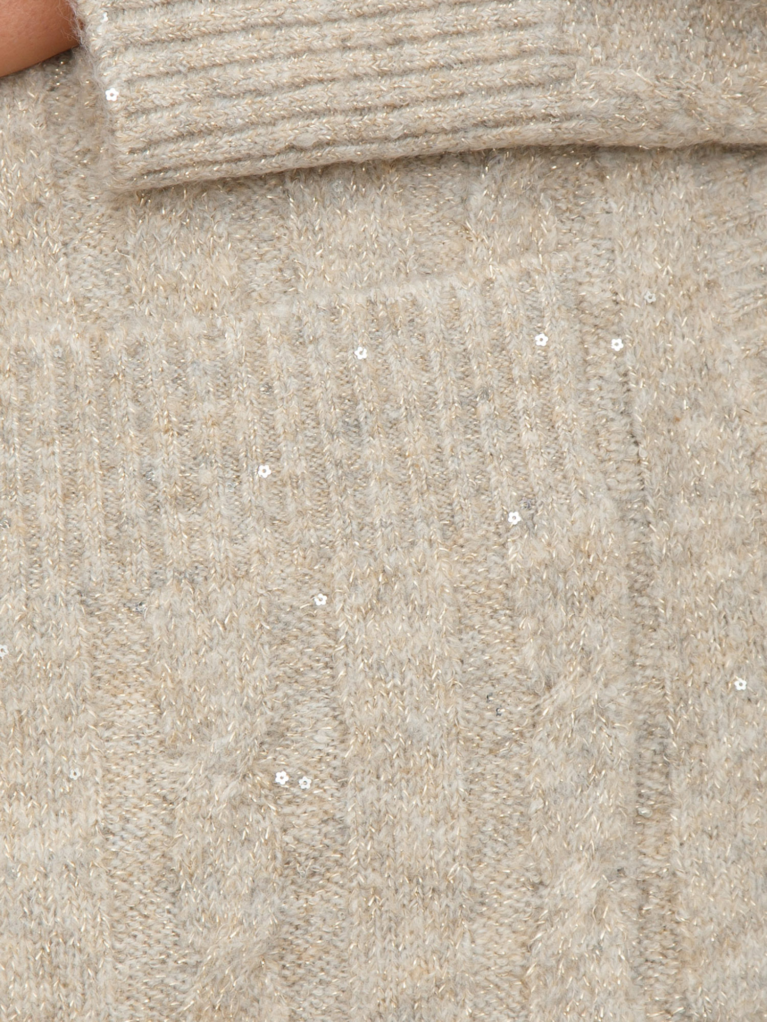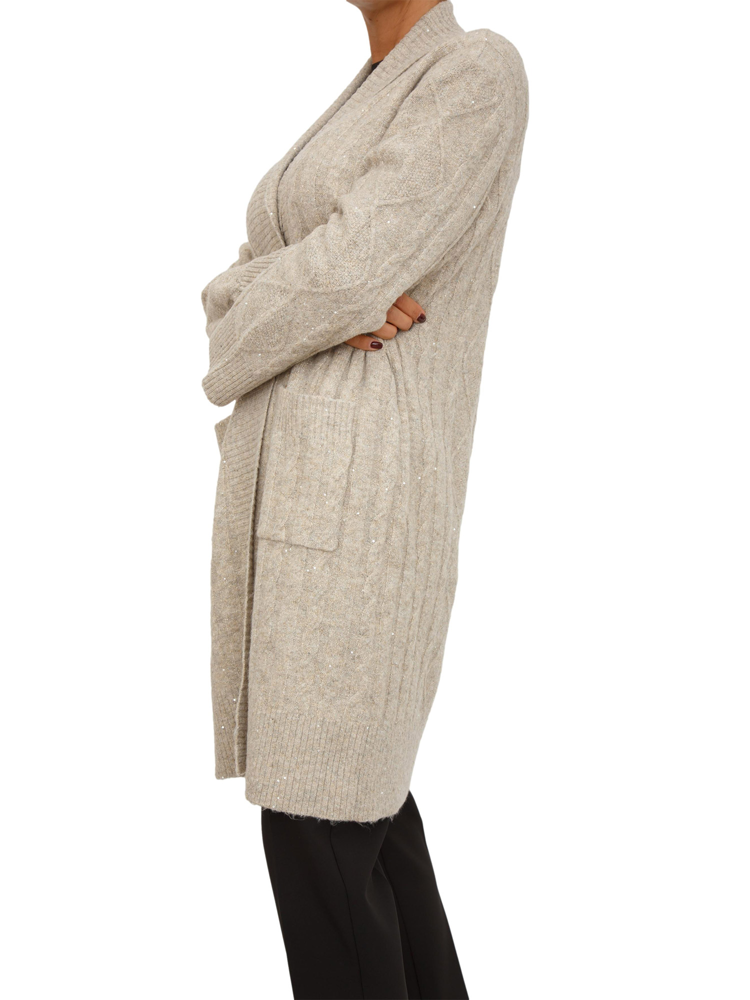 Cardigan donna Fracomina realizzato in caldo tessuto con lavorazione a trecce piatte e micro paillettes all over tono su tono. Design dotato di taschge laterali e lavorazione a costine sui bordi. Uno stile unico e raffinato. La modella è alta 1.72 e indossa la taglia XS.