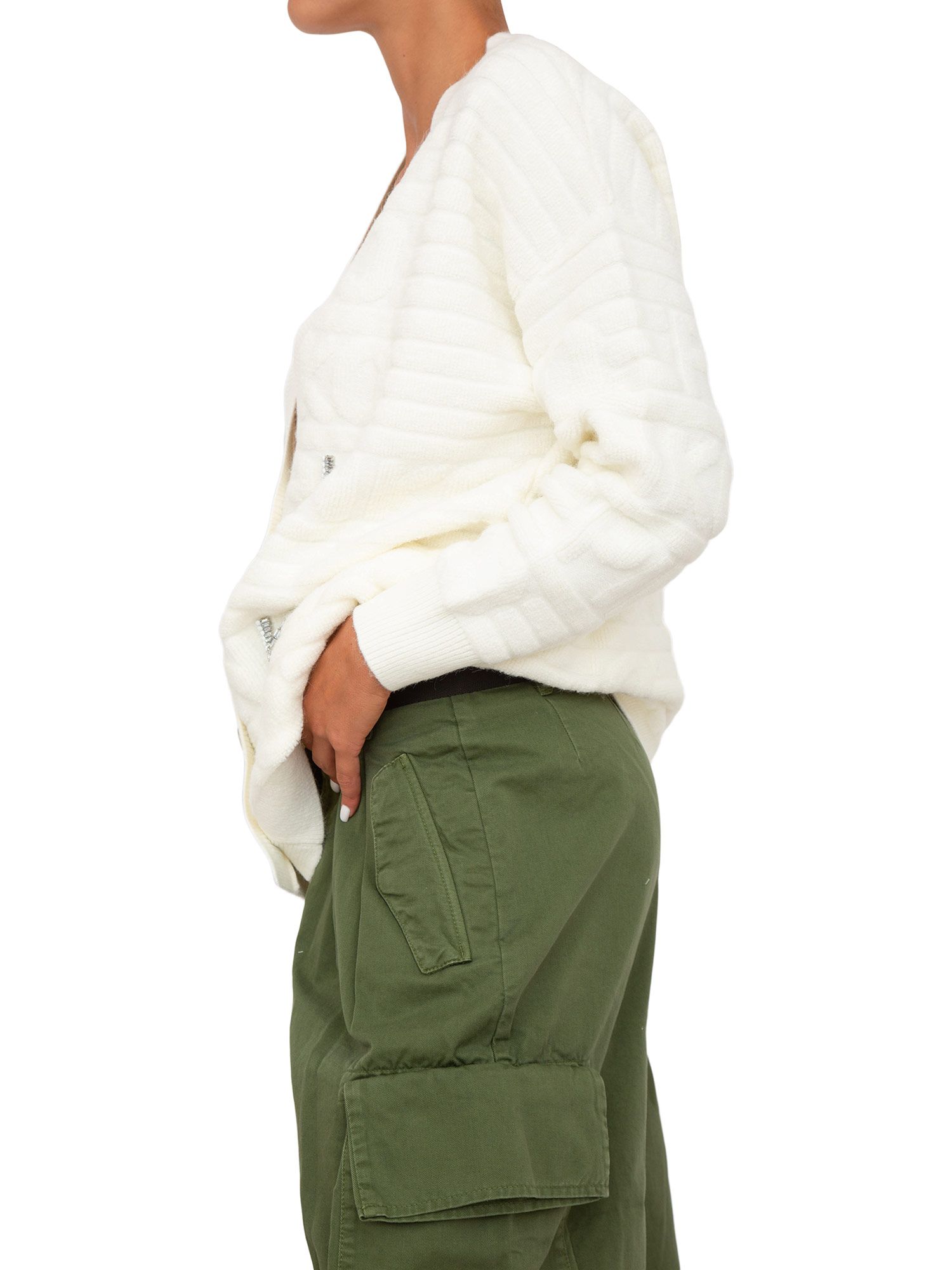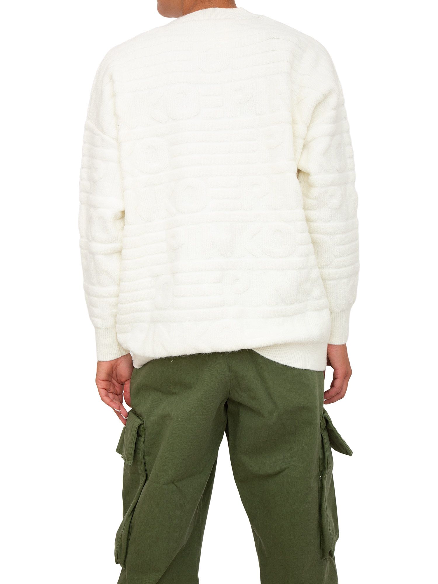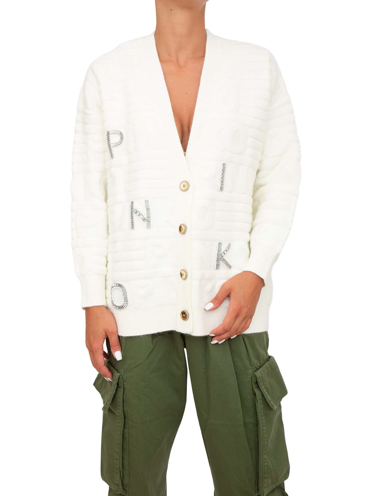Cardigan Pinko dal volume leggermente oversize in morbida maglia, lavorata a punto spugna che crea un pattern dall'effetto tridimensionale che alterna righe orizzontali al logo PINKO. Personalizzazione con logo scomposto, ricamato con strass davanti. Scollo a V e maniche lunghe a giro basso. Apertura, polsini e fondo capo lavorati a costine. Chiusura con bottoni davanti.