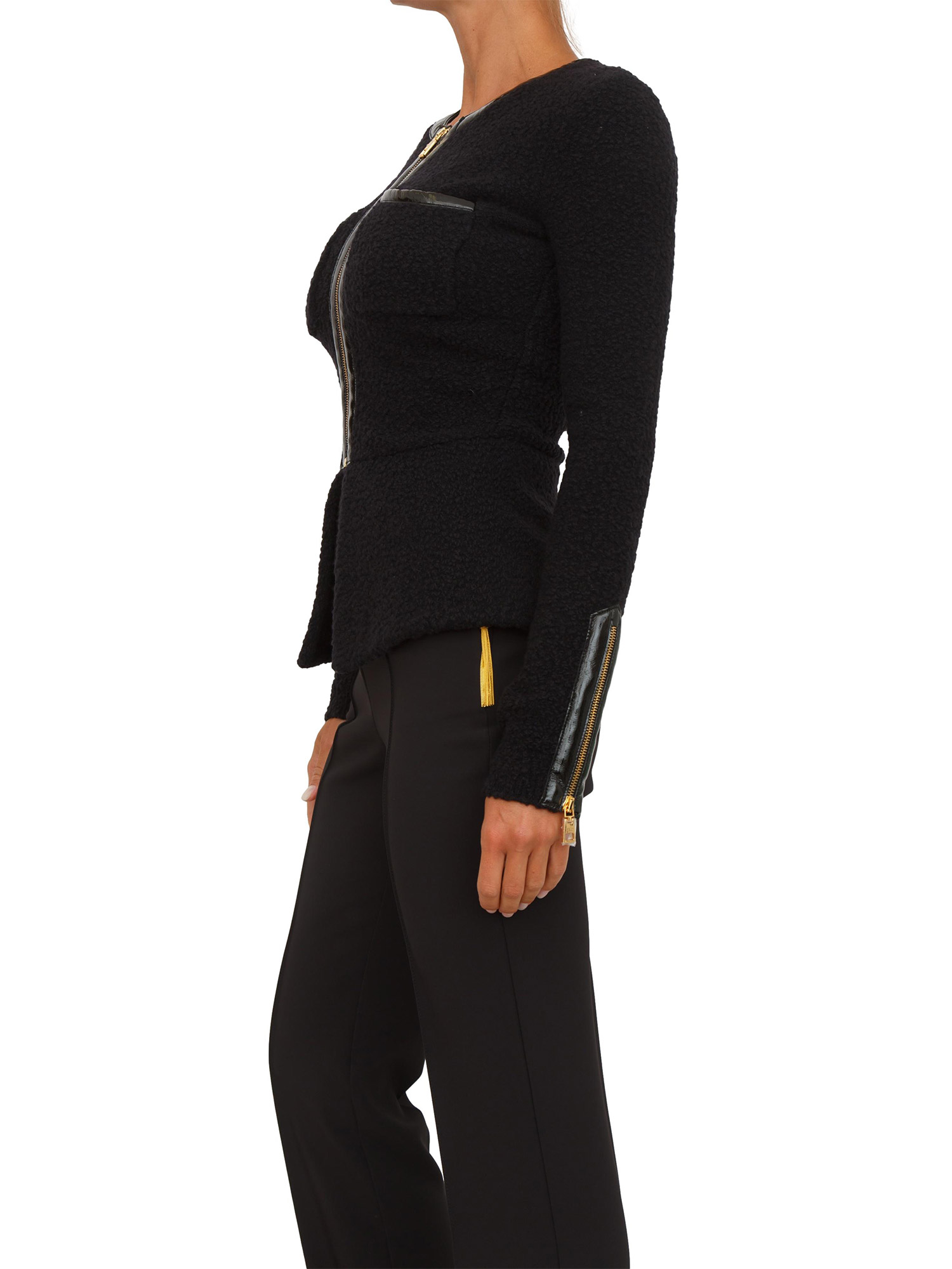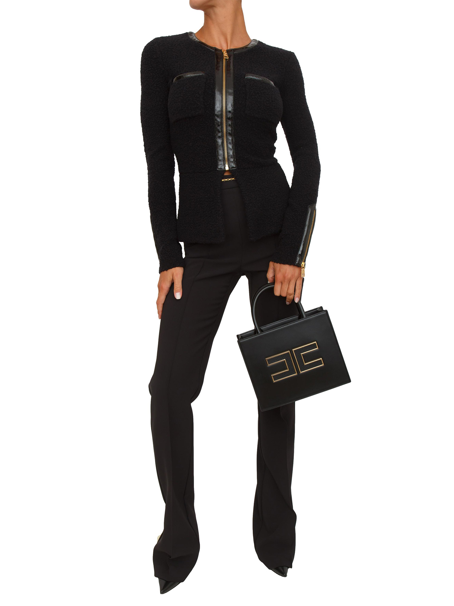 Cardigan Elisabetta Franchi in bouclÉ nero con inserti in vinile e zip