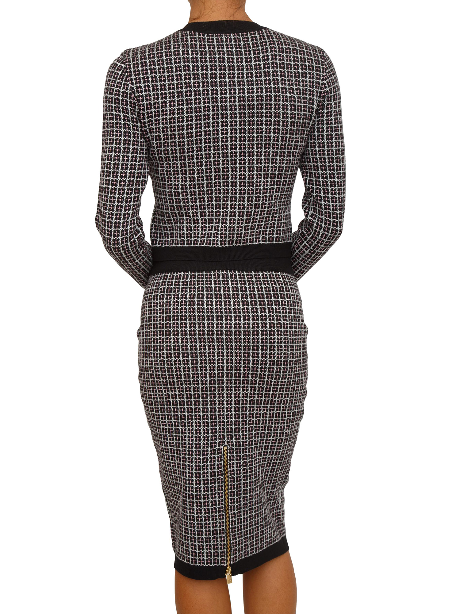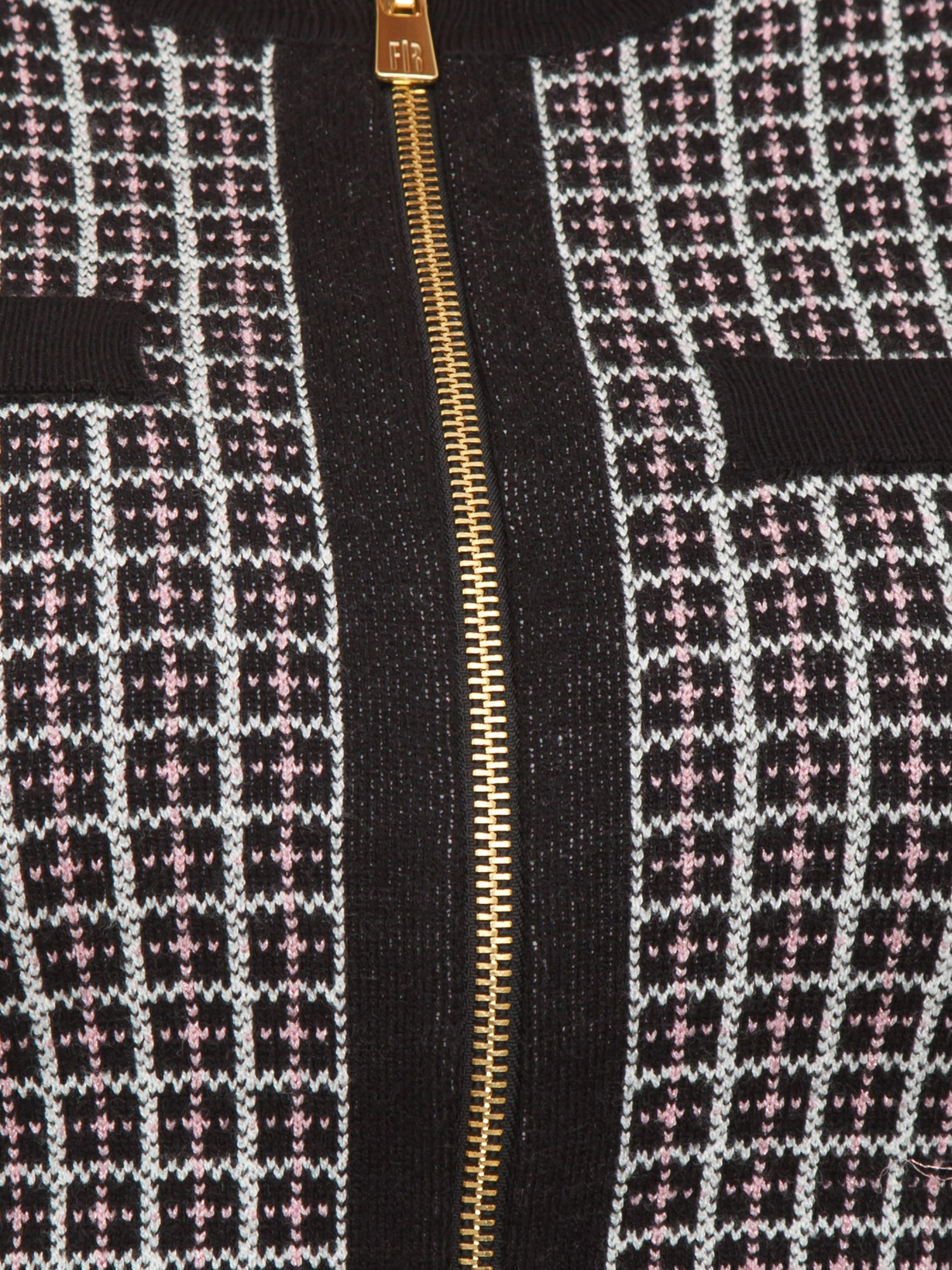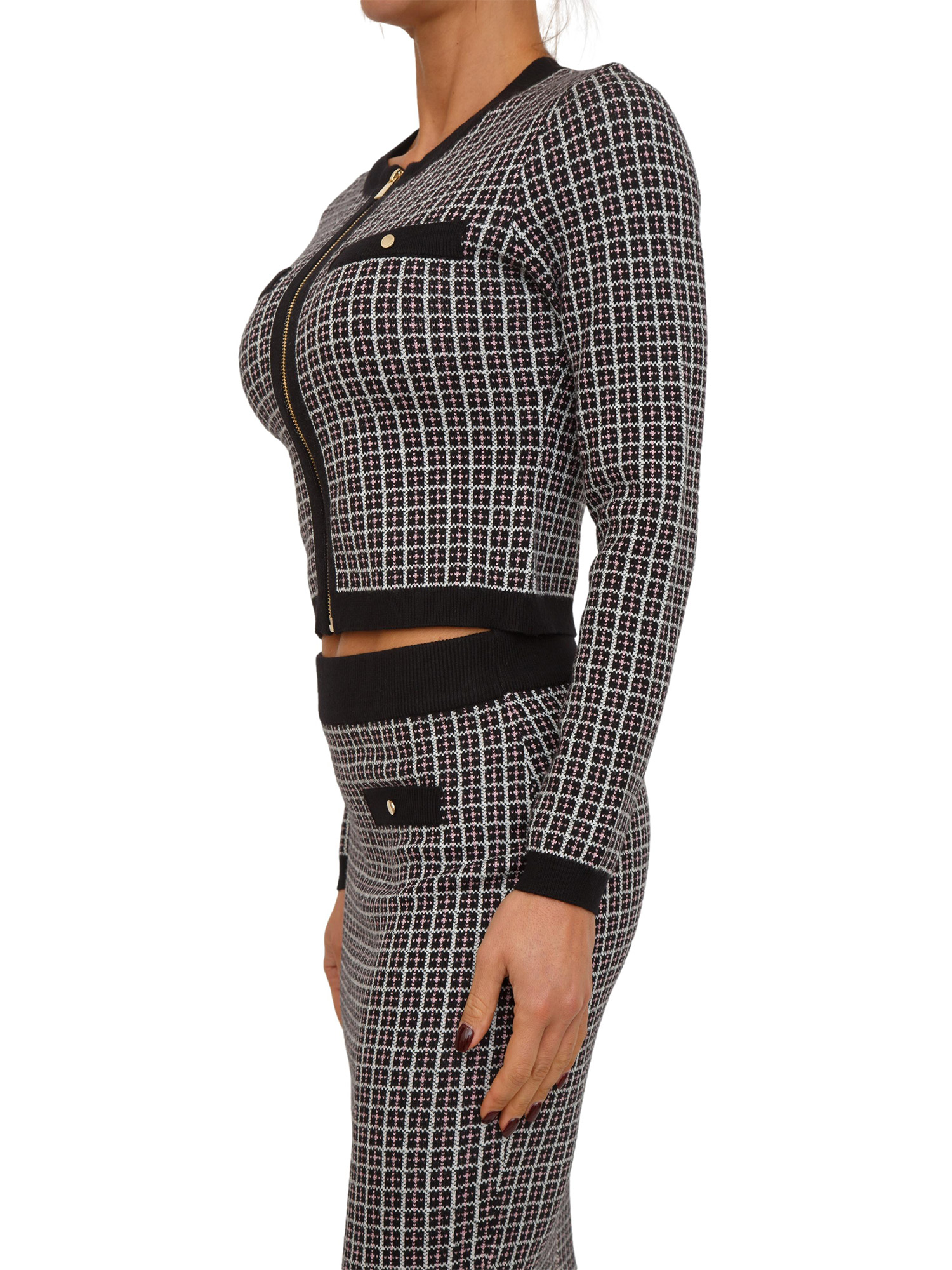 Cardigan Fracomina modello cropped aderente realizzato in maglia di viscosa con motivo jacquard geometrico. Design con girocollo, zip centrale dorata e patte finte tasche sul petto. Bellissimo. La modella è alta 1.72 e indossa la taglia S.
