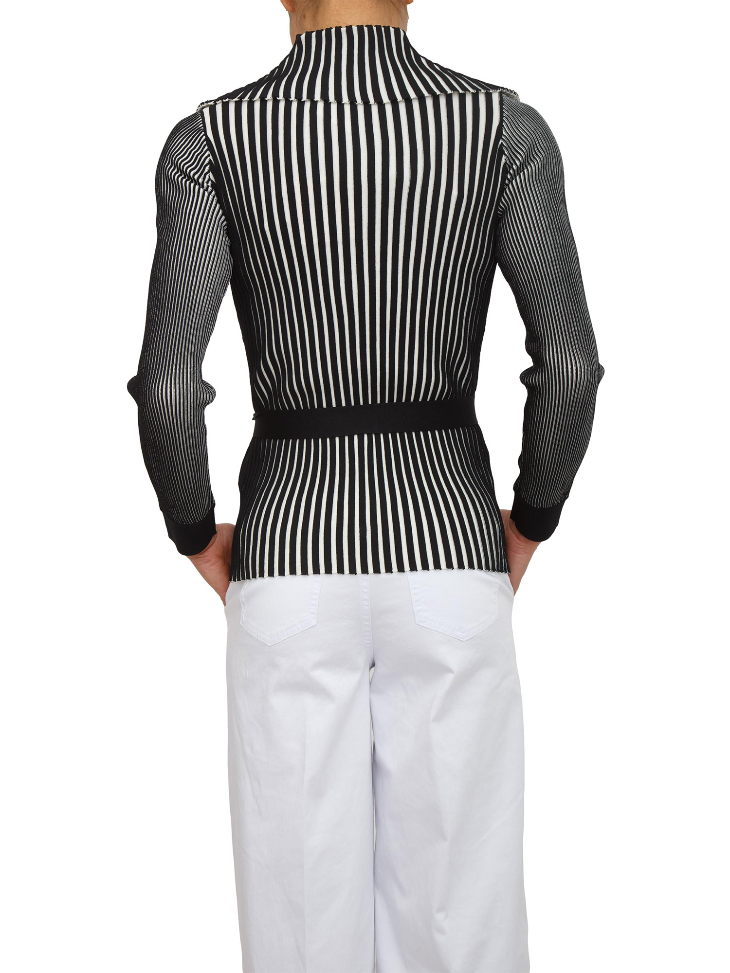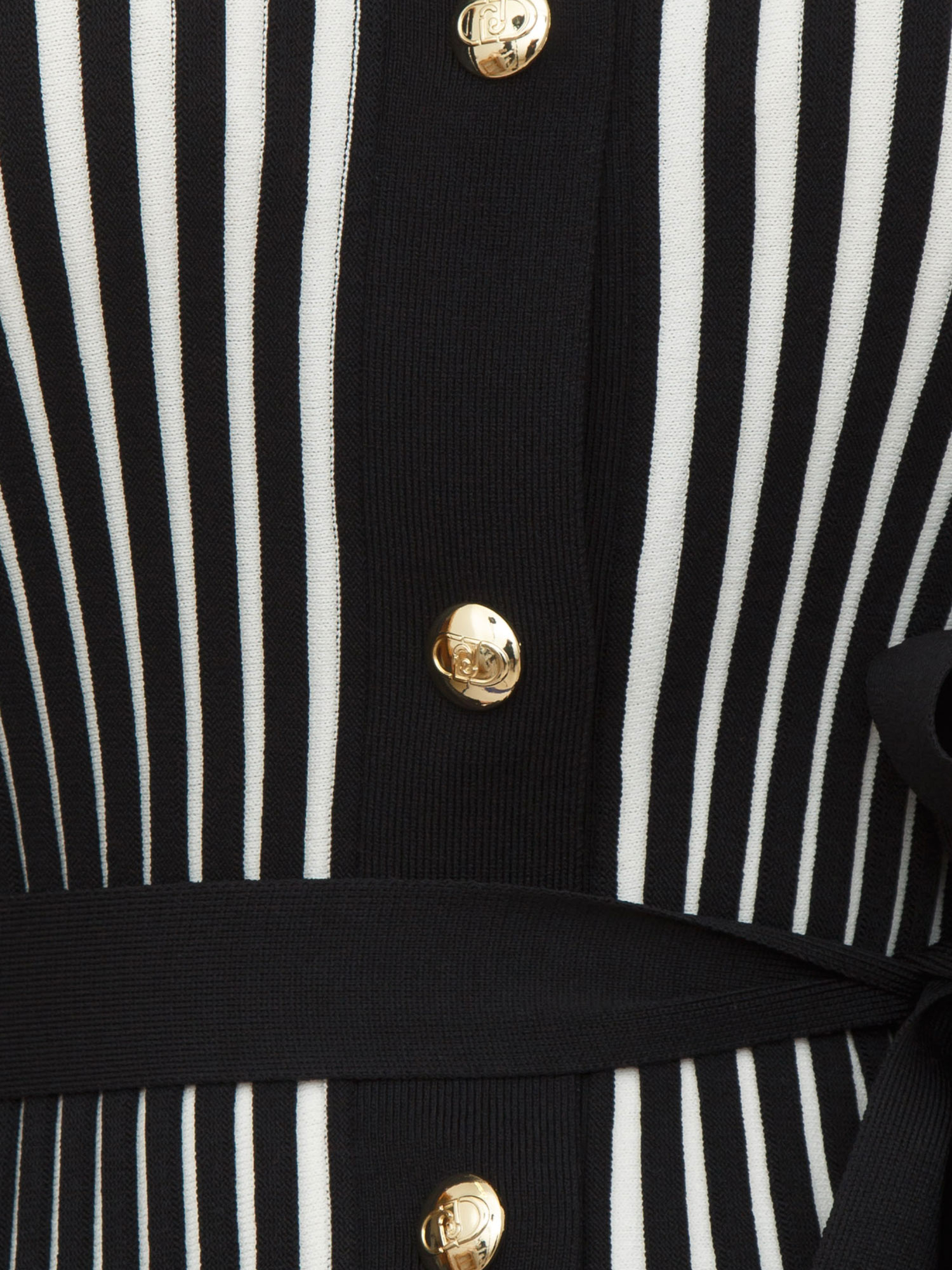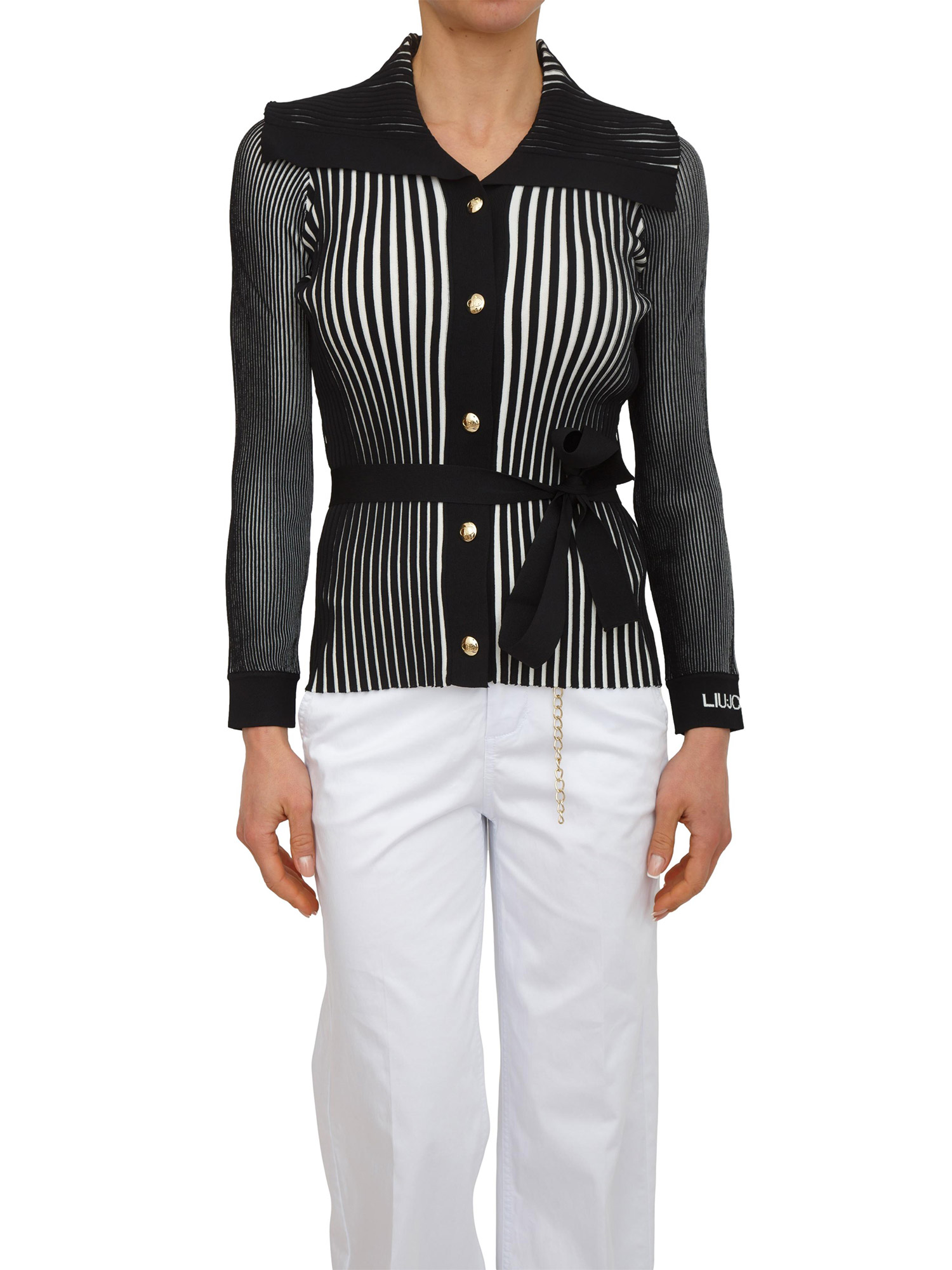 Cardigan Liu Jo donna realizzato in misto viscosa e seta con lavorazione a coste bicolore. Maxi colletto, cintura in tono colore, logo jacquard sul polsino e chiusura con bottoni dorati. La modella è alta 1.72 e indossa la taglia XS.