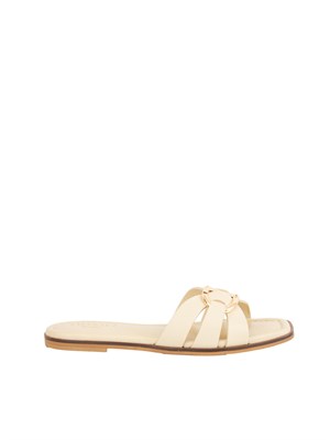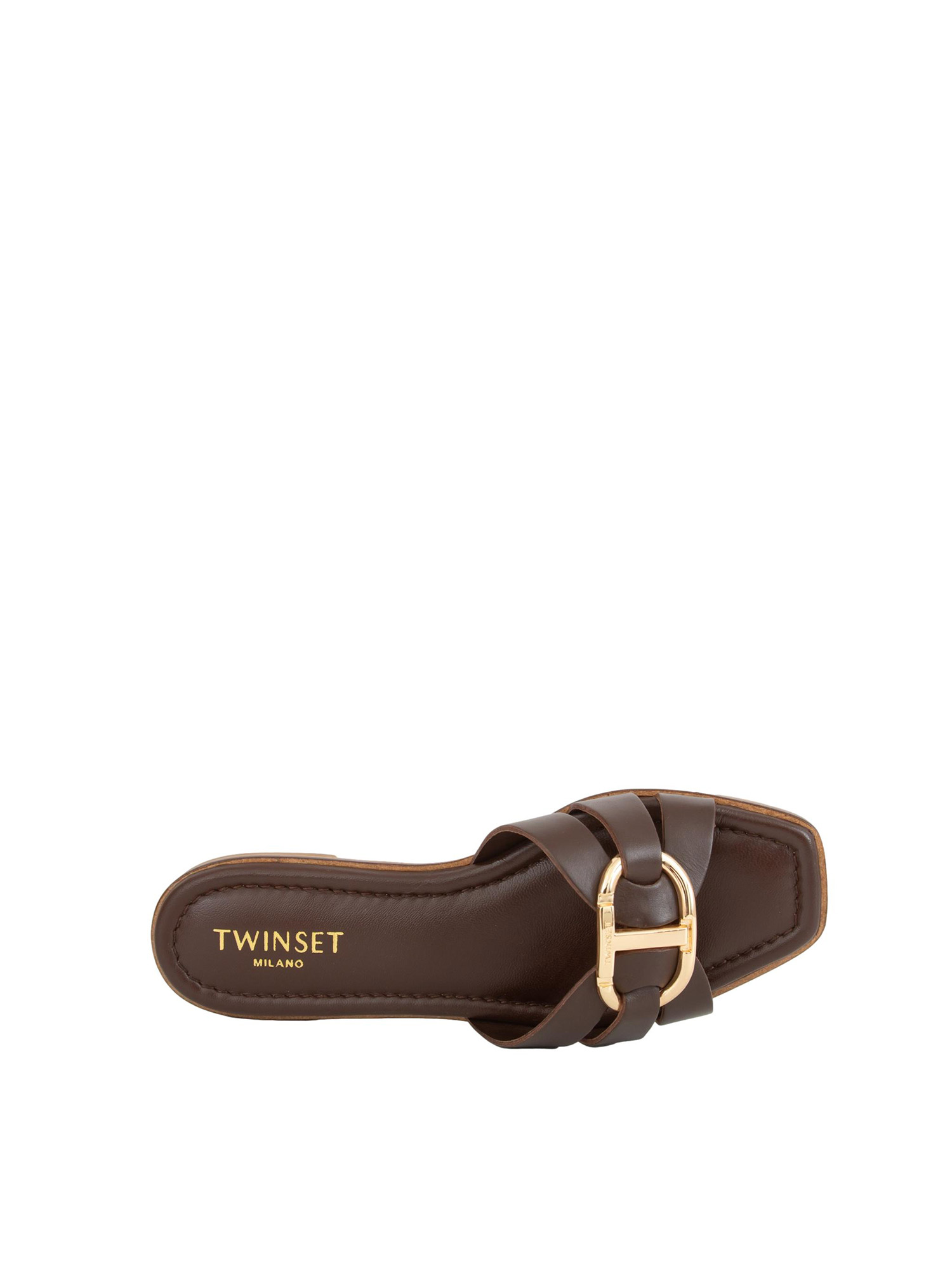 Ciabattine sandalo Twinset modello slide realizzate in pelle con listini intrecciati e logo Oval T in metallo color oro. Bellissime da indossare con qualsiasi outfit da quello più casual a quello più raffinato. Altezza fondo 1 cm.