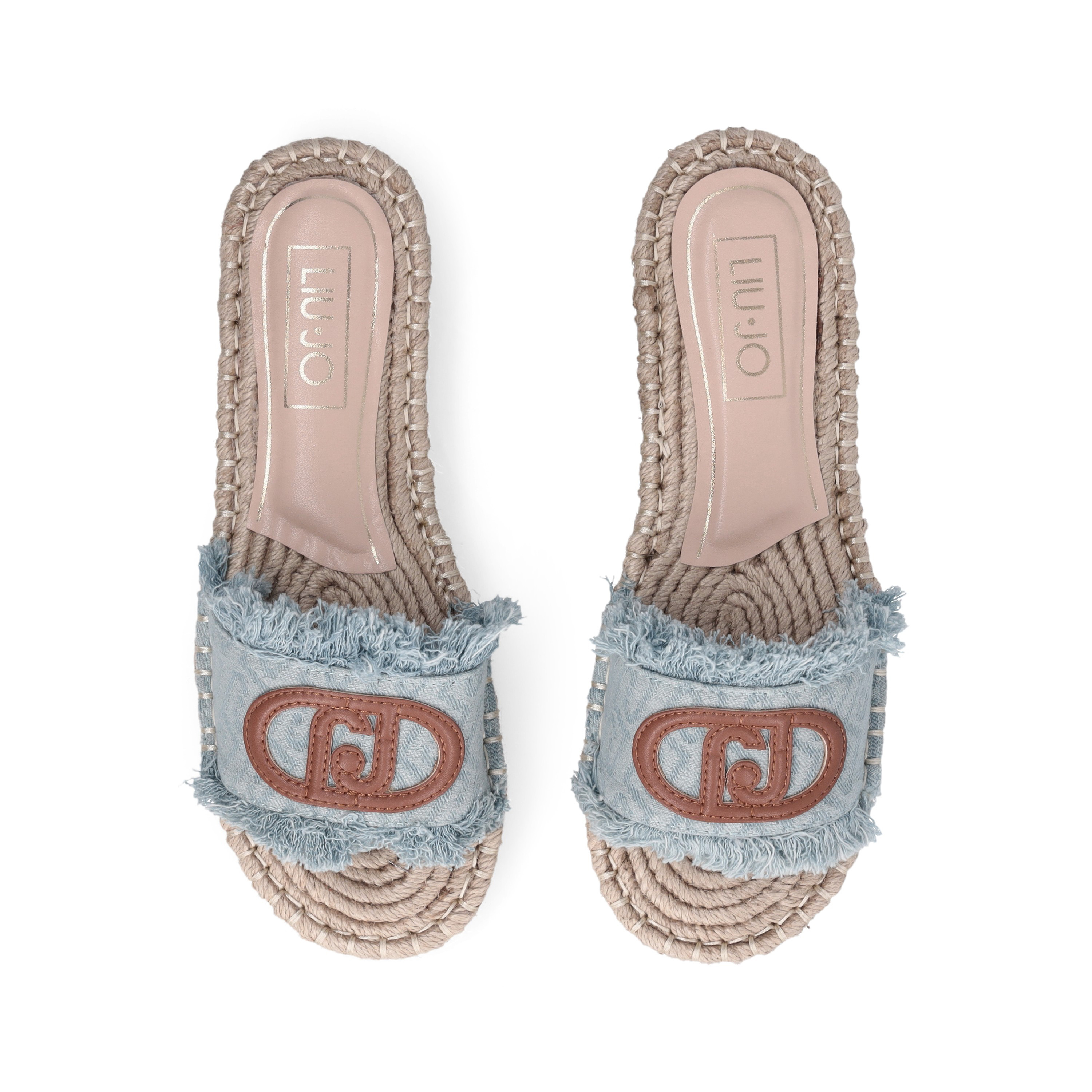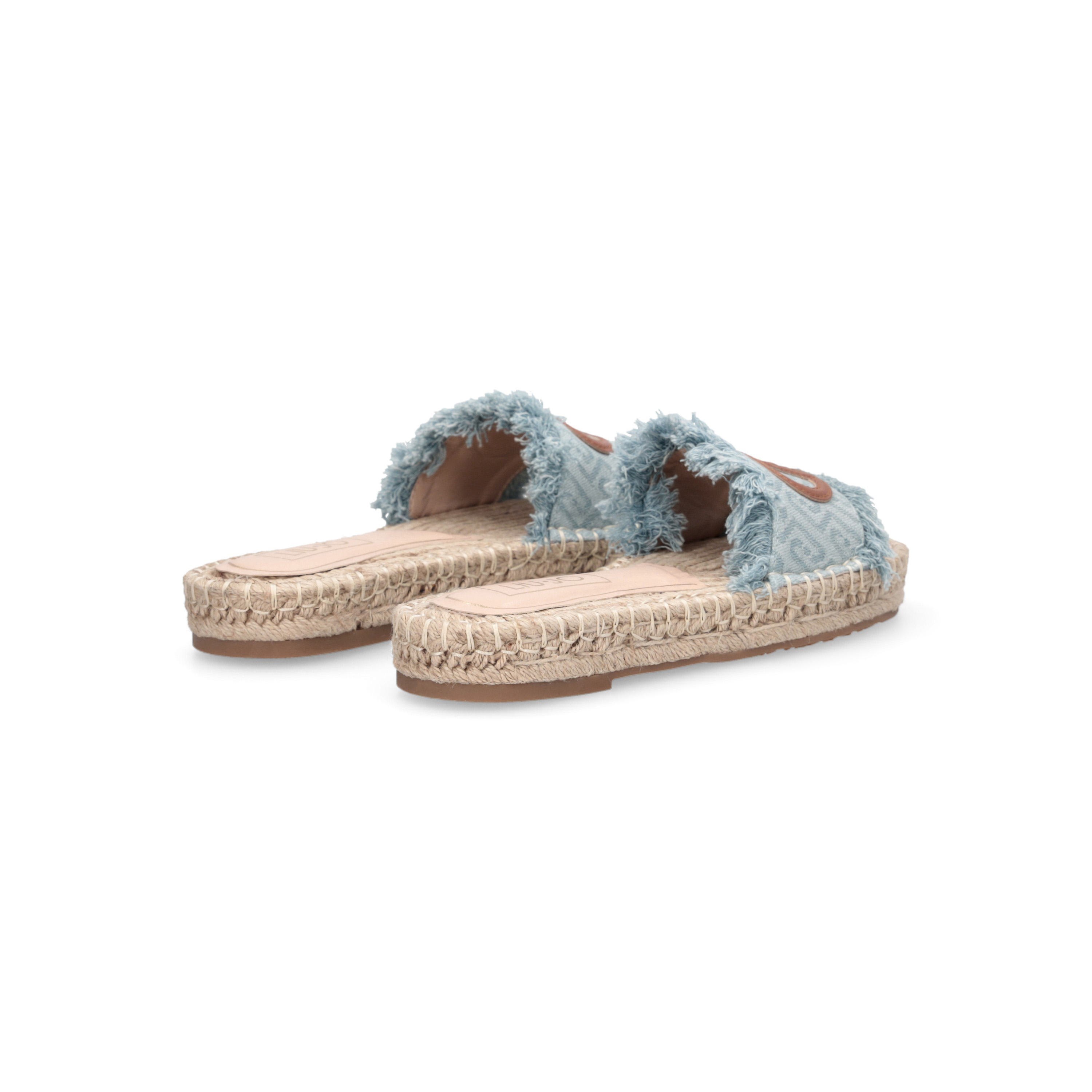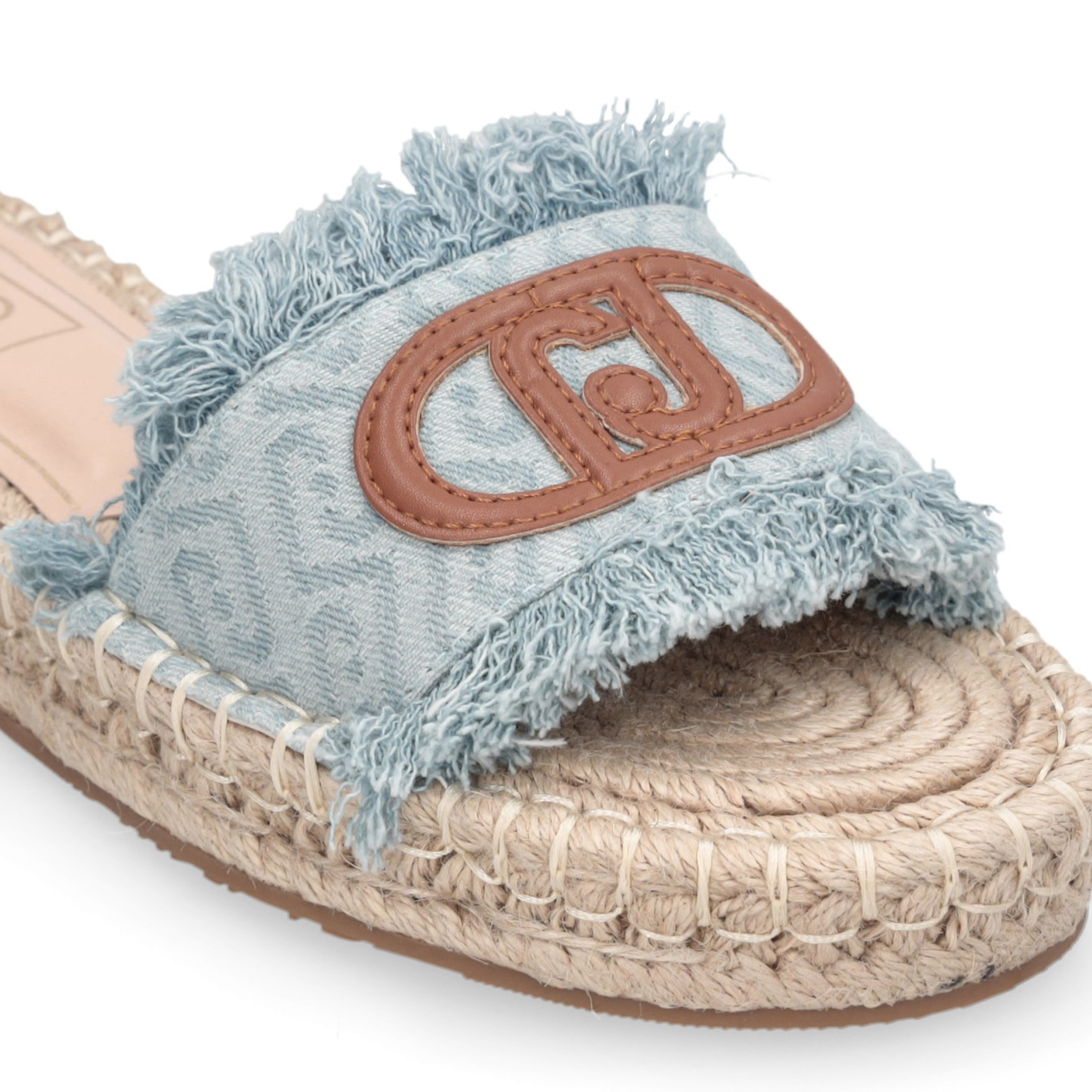 Ciabatte Liu Jo donna modello espadrillas con tomaia in denim jacquard logato ed orli sfrangiati. Patch logo monogram in pelle e suola in corda intrecciata. Altezza suola: 3 cm.