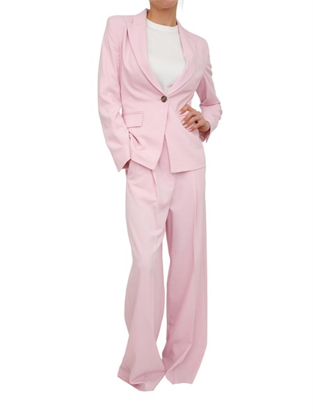 Tailleur in cr[and]ecirc;pe fluido composto da giacca con spalle strutturate e collo a lancia e pantalone svasato al fondo grazie all'inserto in voile sulle gambe.