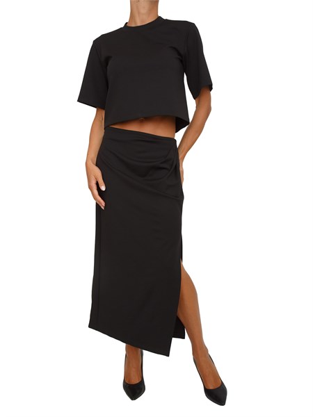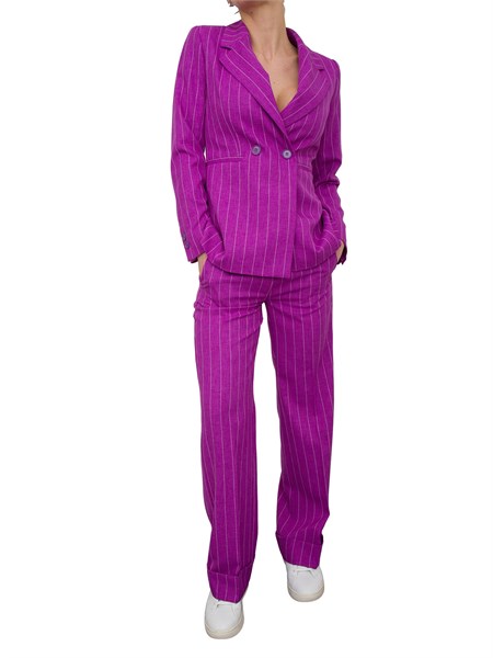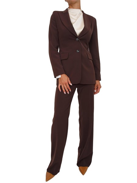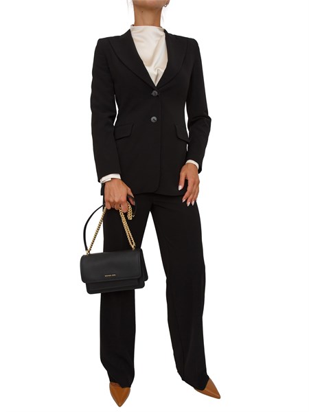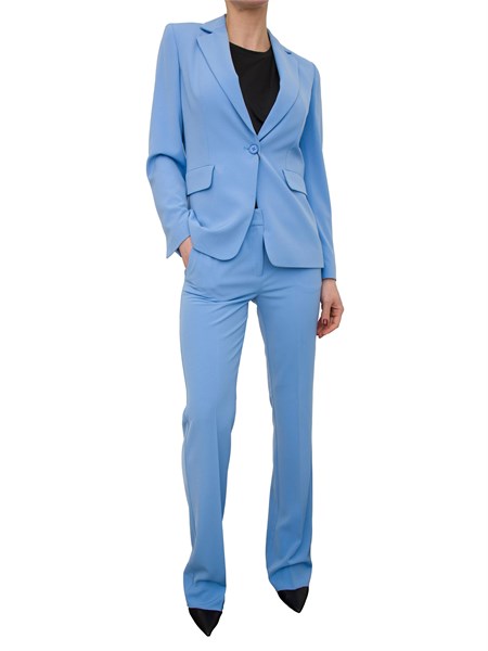 Tailleur in crêpe fluido composto da giacca con spalle strutturate e collo a lancia e pantalone svasato al fondo grazie all'inserto in voile sulle gambe.