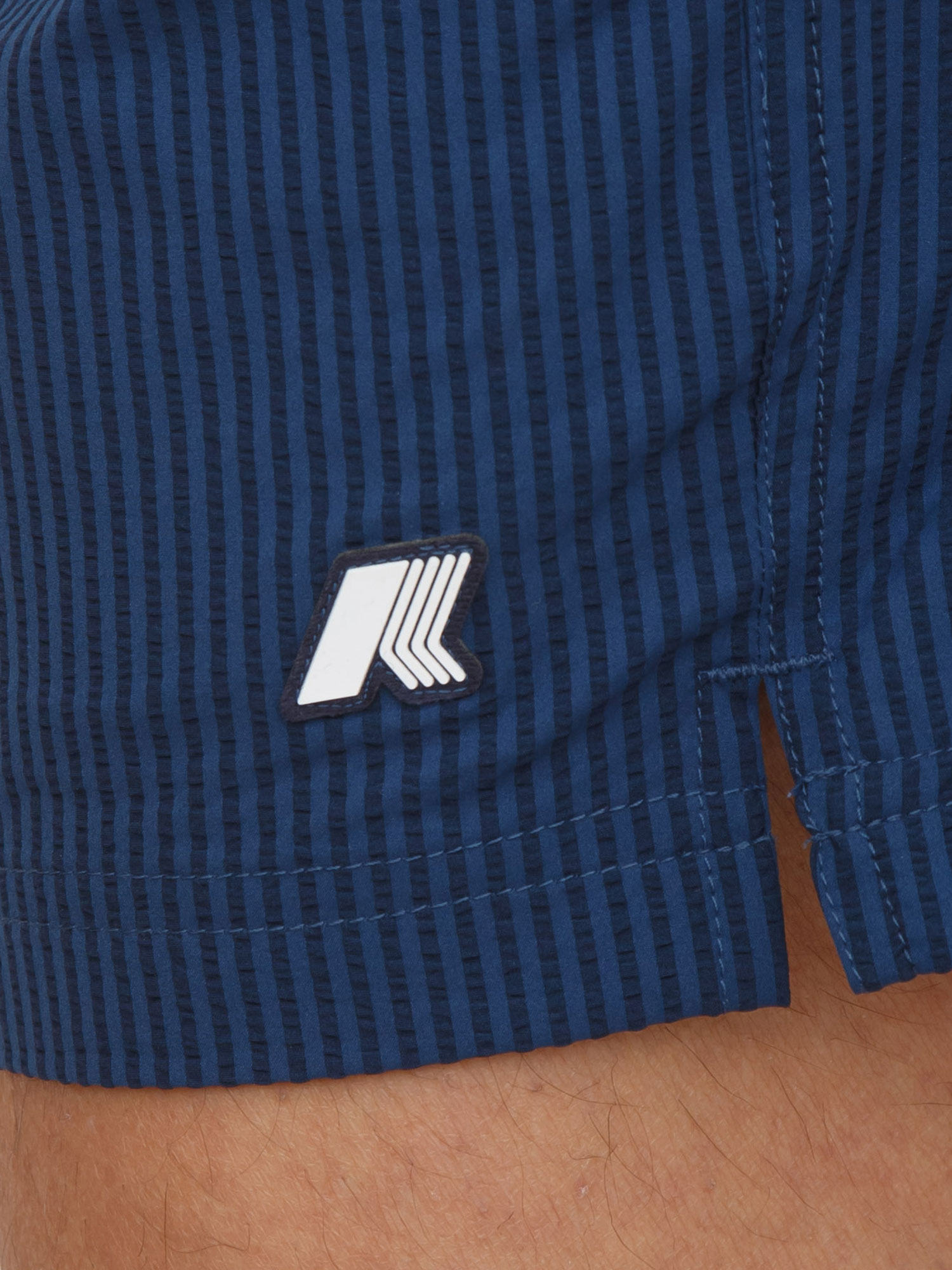 Costume da bagno boxer Hazel K-WAY dal design essenziale e versatile. Tasche laterali e una sul retro con dettaglio grafico. Realizzato in tessuto seersucker con motivo a righe ad asciugatura rapida, elastico in vita, slip interno in rete e spacchetti laterali che offrono libertà di movimento. Il modello è alto 1.90m e indossa la taglia M.