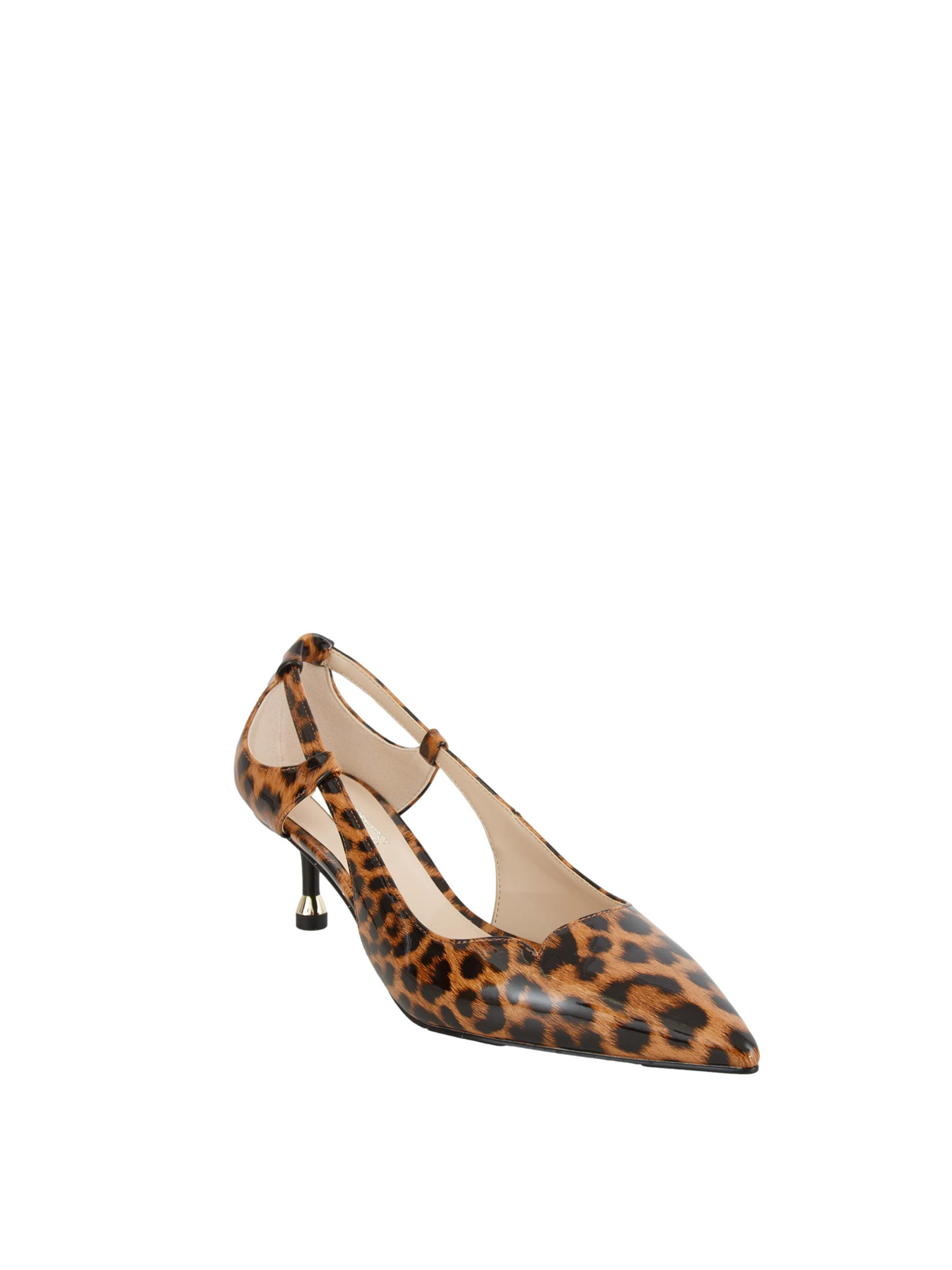 Décolleté con stampa animalier, cut-out, punta affusolata, dettaglio scollo a cuore sul davanti, tacco basso a spillo. Accessorio logato sul dietro. Altezza tacco: 5,5 cm