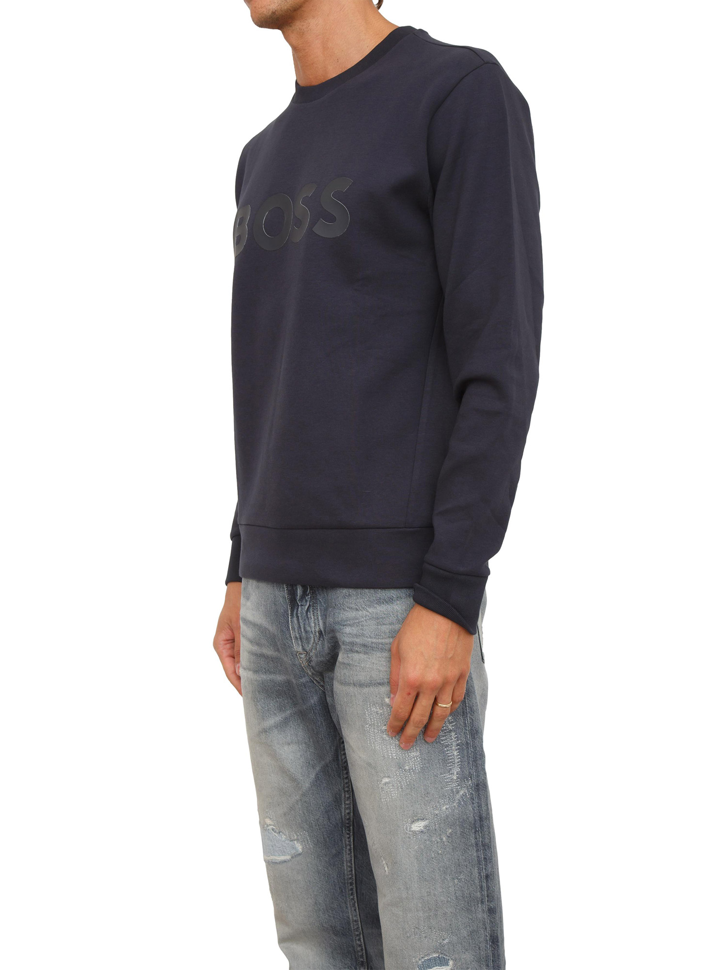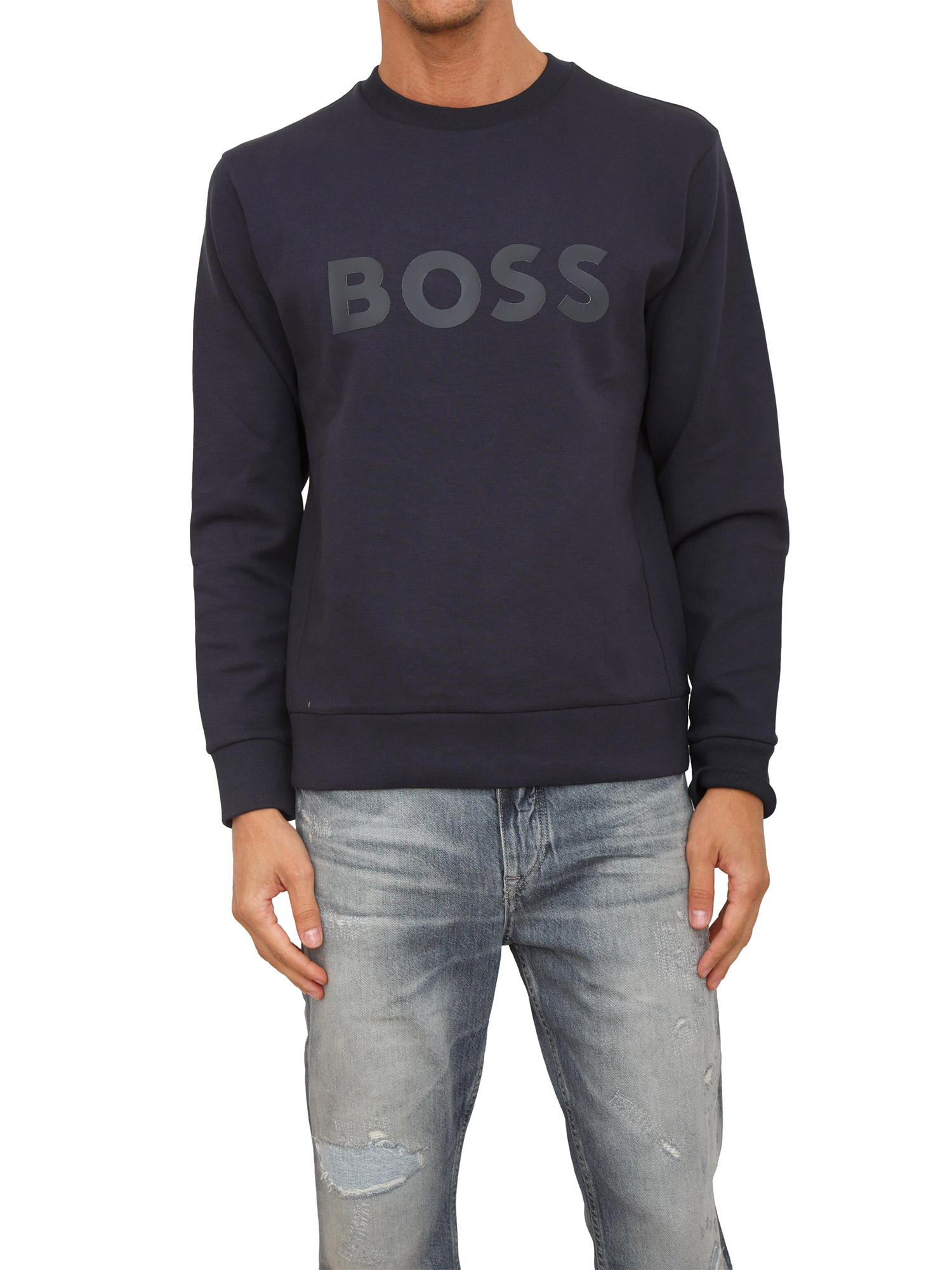 Felpa BOSS uomo versatile in cotone elasticizzato con vestibilità regular e girocollo. Questo capo presenta logo lettering applicato tono su tono davanti con polsini a costine. Il modello è alto 1.90m e indossa la taglia M.