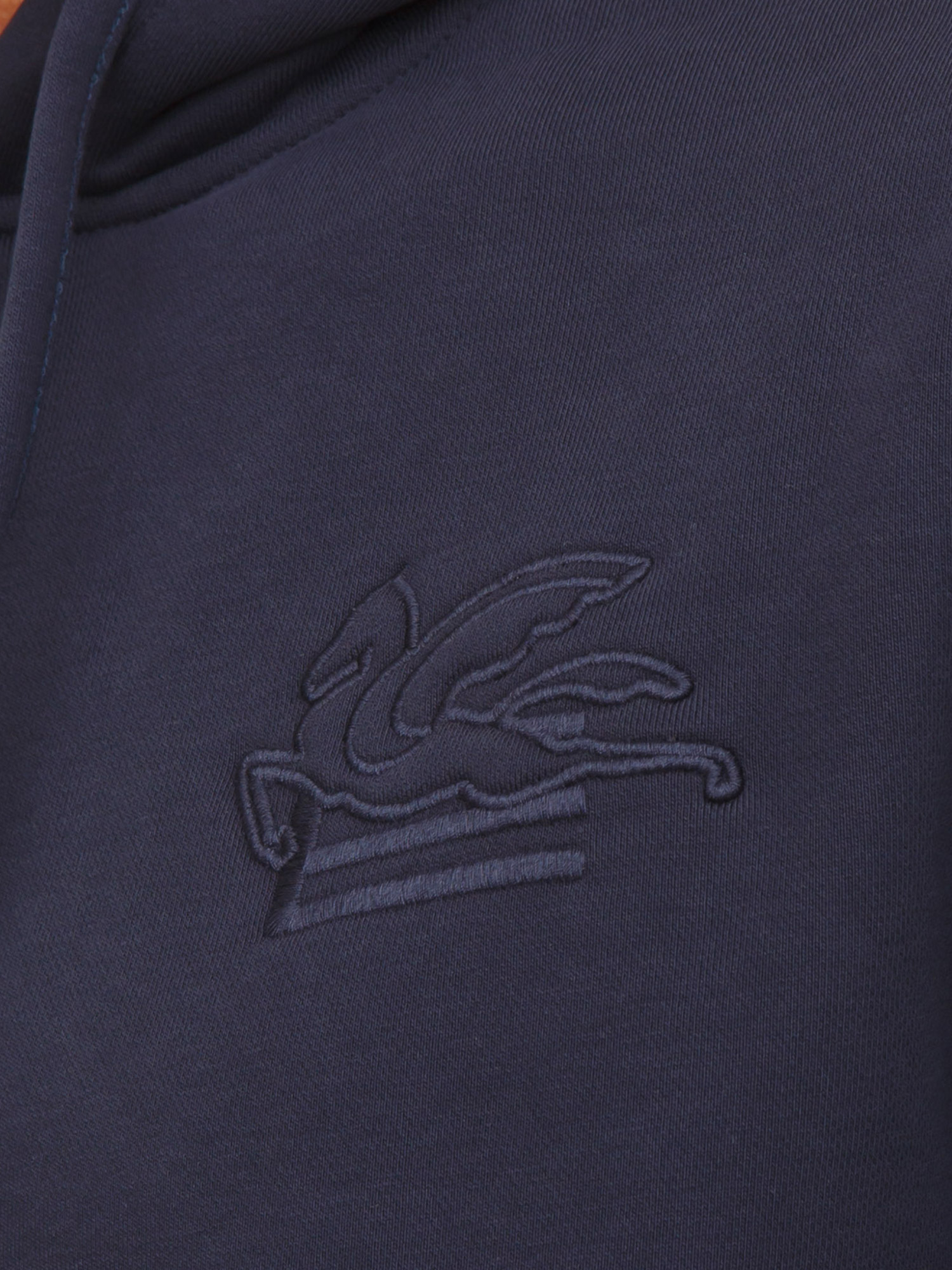 Felpa con cappuccio Etro uomo realizzata in misto cotone con logo Pegaso ricamato ton sur ton sul petto. Vestibilità regular, cappuccio con coulisse e polsini e fondo lavorati a costine. Il modello è alto 1.90m e indossa la taglia M.