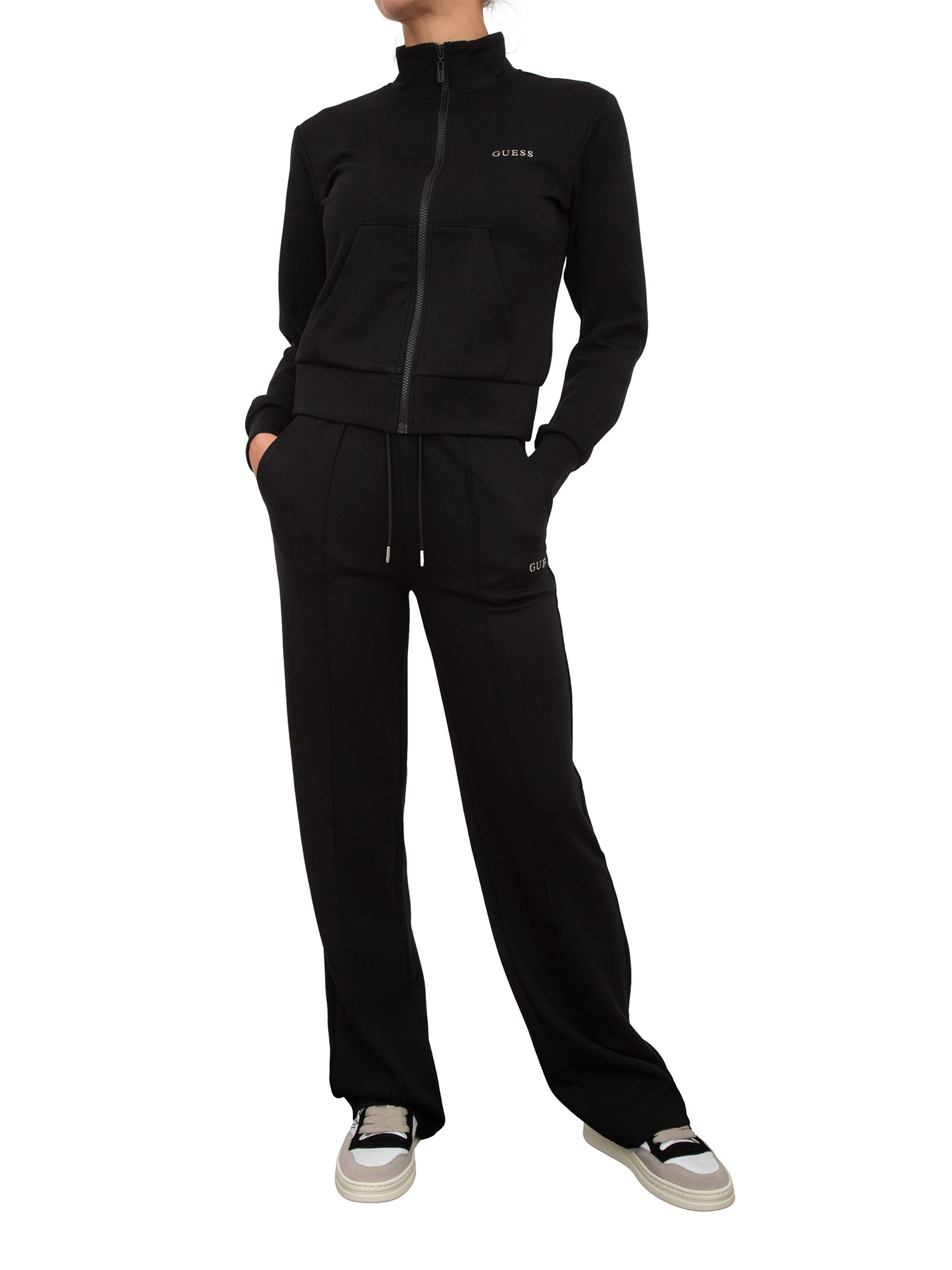 Felpa donna Guess Jeans realizzata in misto viscosa con vestibilità regular, collo alto e maniche lunghe. Modello con chiusura zip, tasche laterali e logo lettering davanti. La modella è alta 1.72 e indossa la taglia XS.