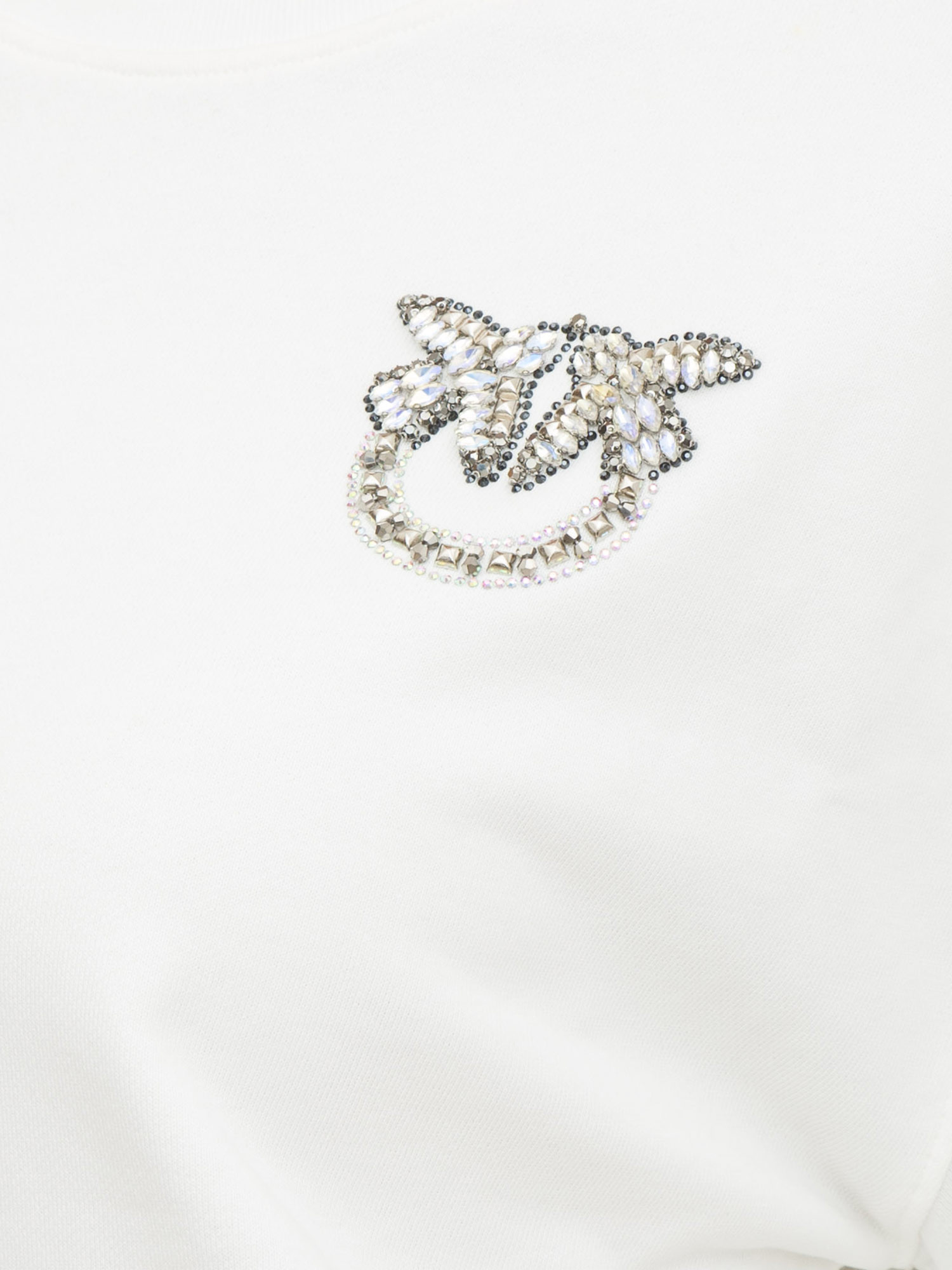 Felpa dal volume boxy in morbido cotone con mini ricamo gioiello Love Birds completato da borchie davanti, lato cuore. Scollo tondo, polsini e fondo capo con elastico. Le maniche lunghe a giro basso sono caratterizzate da volume ampio con arriccio sul retro.