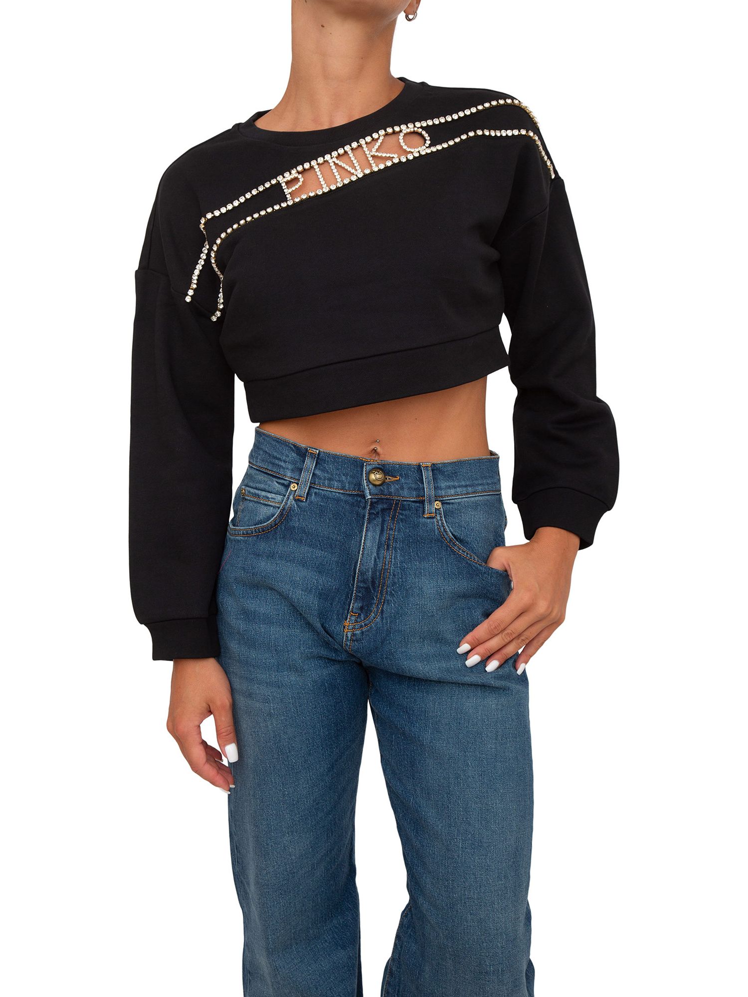 Felpa corta Pinko in morbido cotone con dettaglio logato con strass applicati davanti. Scollo tondo e maniche lunghe a giro leggermente basso dal volume ampio.