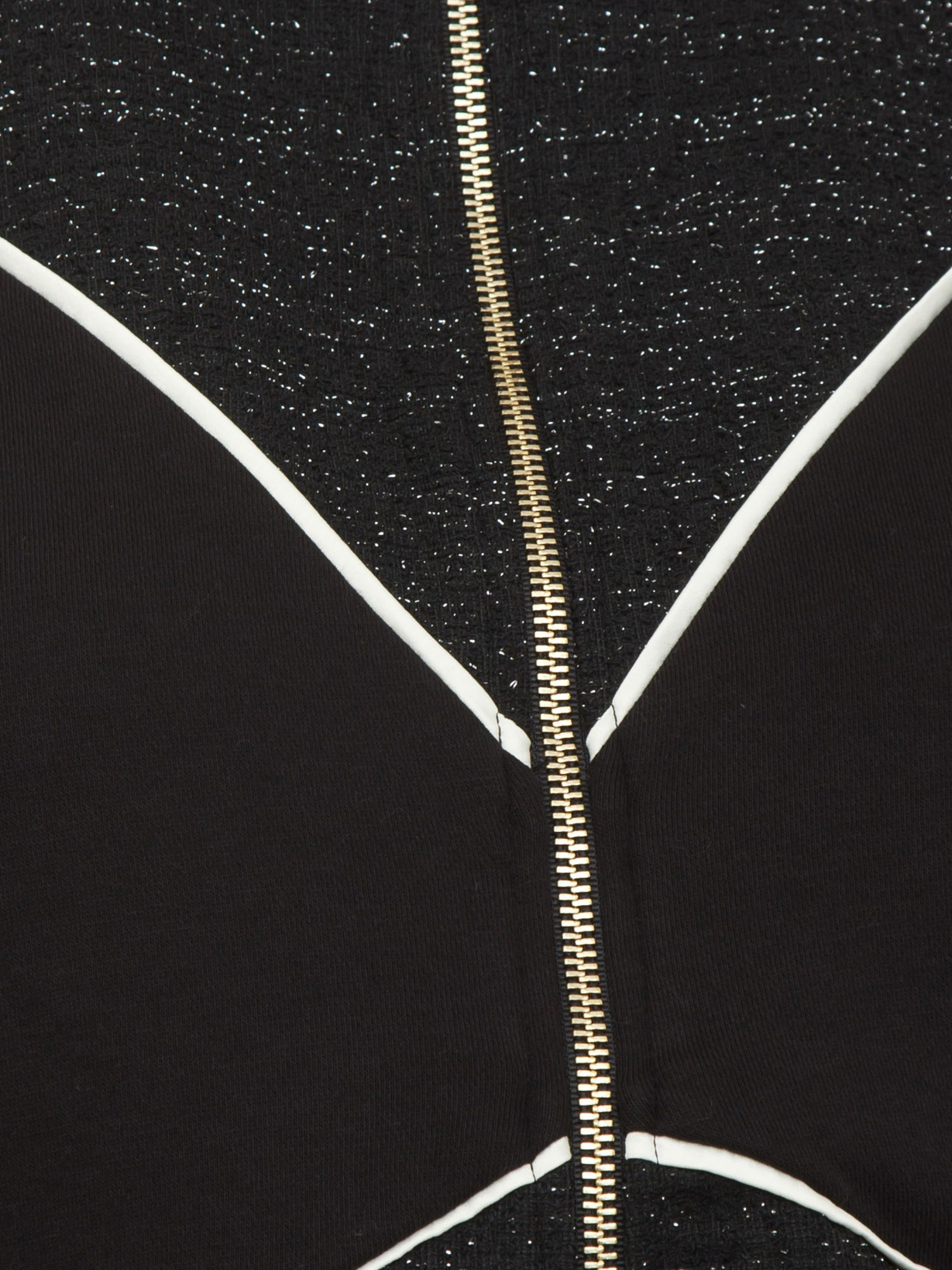 Felpa full zip Liu Jo donna realizzata in misto cotone con inserti in lurex e cuciture geometriche a contrasto sul davanti. Dotata di collo alto, tasche con chiusura patta e vestibilità morbida. La modella è alta 1.72 e indossa la taglia XS.