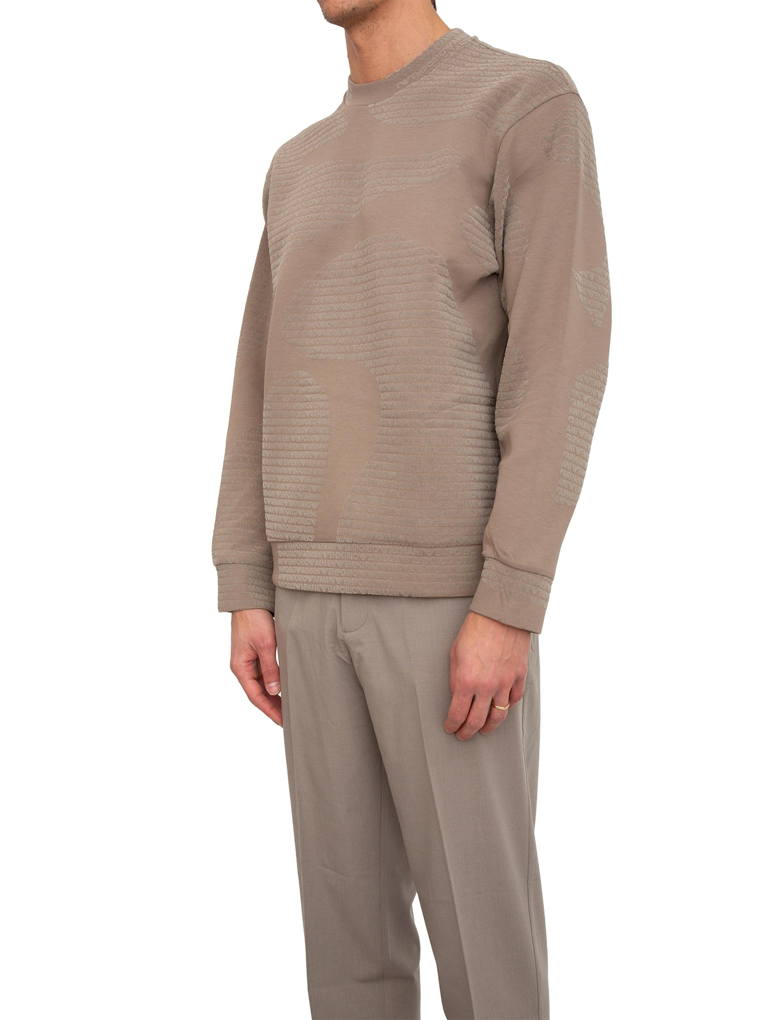 Felpa girocollo uomo Emporio Armani in misto cotone beige e logo jacquard