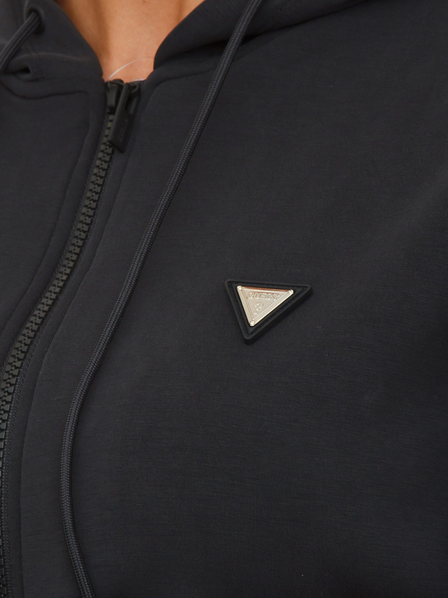 Felpa Guess elegante Jeans donna in misto modal con cappuccio. Regular fit, maniche lunghe e girocollo. La chiusura con zip e coulisse conferisce un tocco moderno. Ideale per le giornate casual. Realizzata in tessuto scuba con il raffinato patch logo. La modella è alta 1.72 e indossa la taglia S.