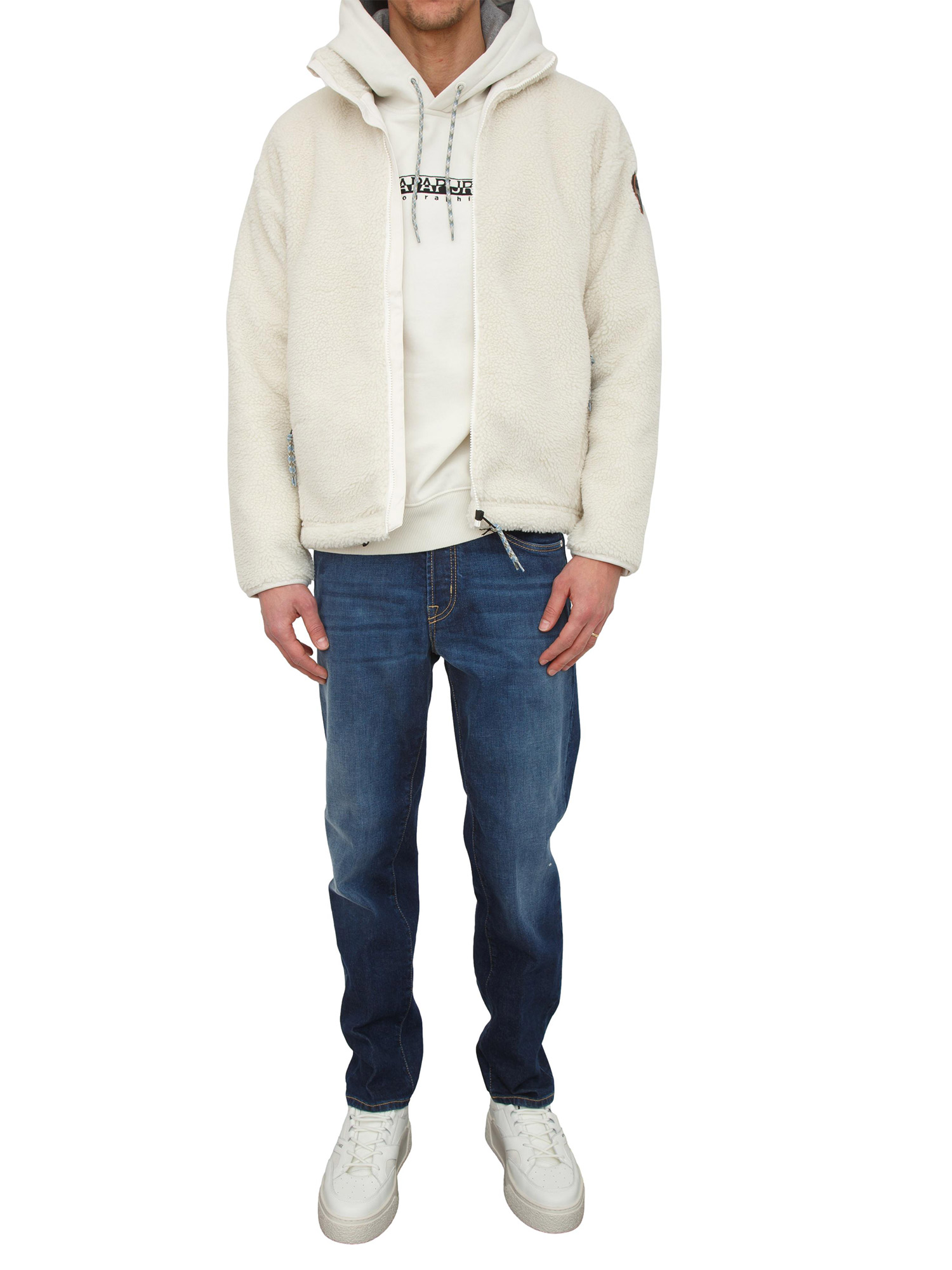 La felpa in pile Fiemme Napapijri realizzata con zip a tutta lunghezza è un comodo e caldo strato intermedio dal design vintage. È dotata di sottogola, orlo regolabile e l’inconfondibile stemma Napapijri Geographic. Il modello è alto 1.90m e indossa la taglia M.
