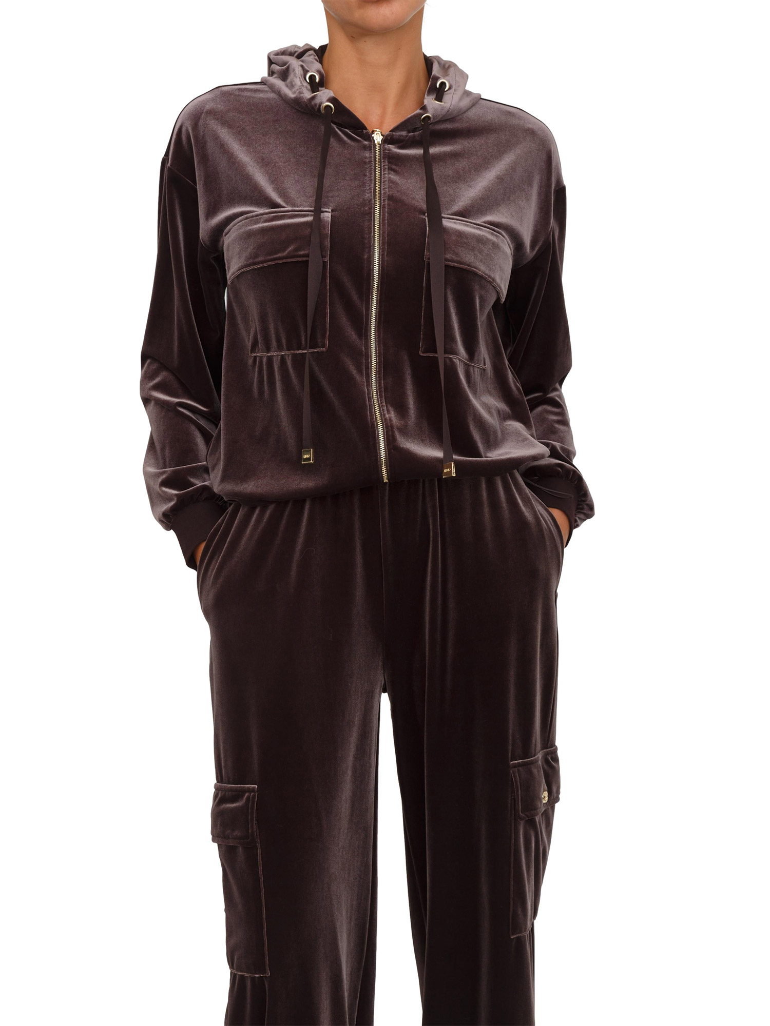 Felpa Liu Jo donna realizzata in ciniglia stretch con cappuccio con coulisse e tasche con patta davanti. Modello con vestibilità morbida e fluida, con chiusura zip oro e polsi a costine. La modella è alta 1.72 e indossa la taglia XS.
