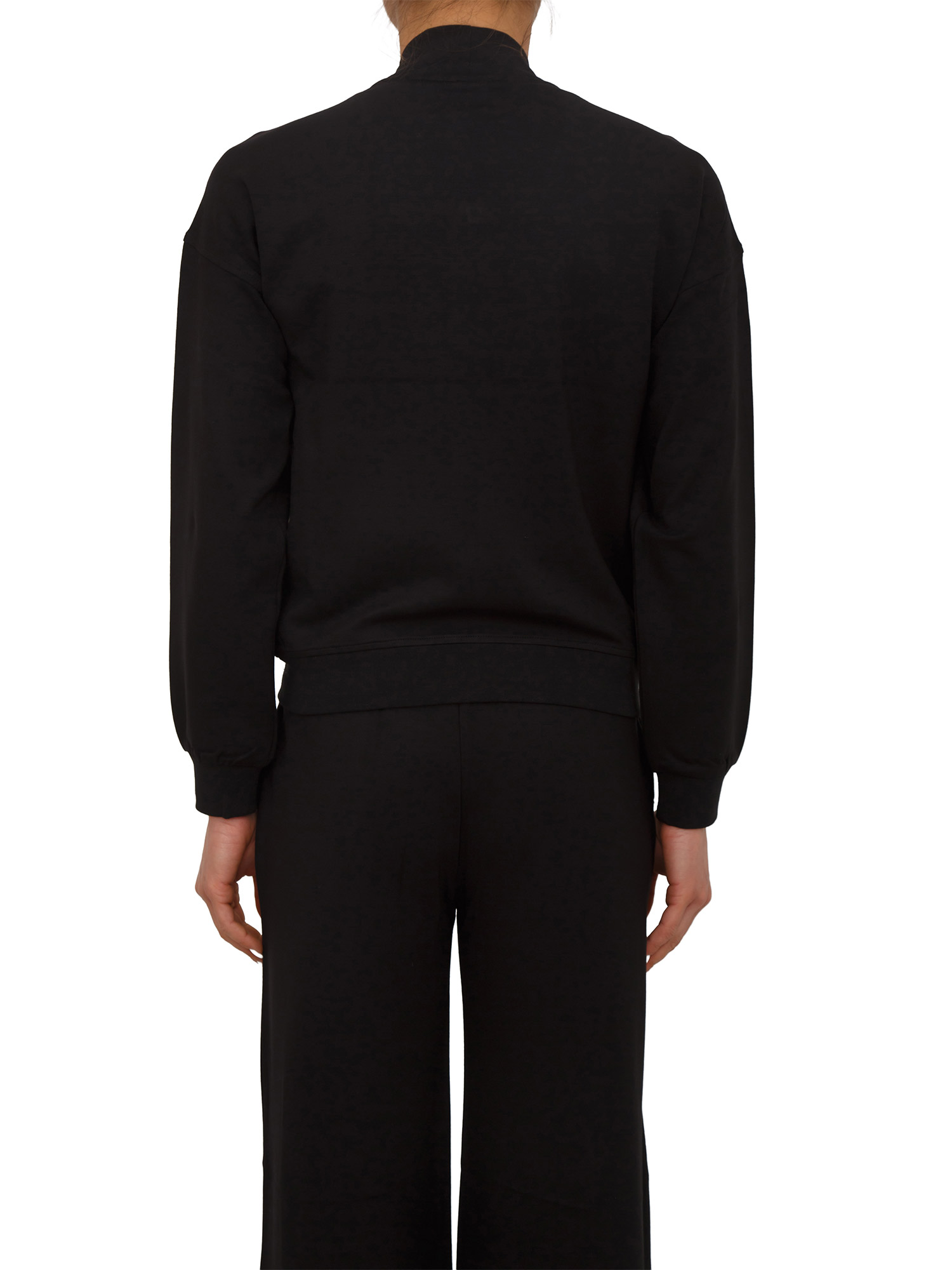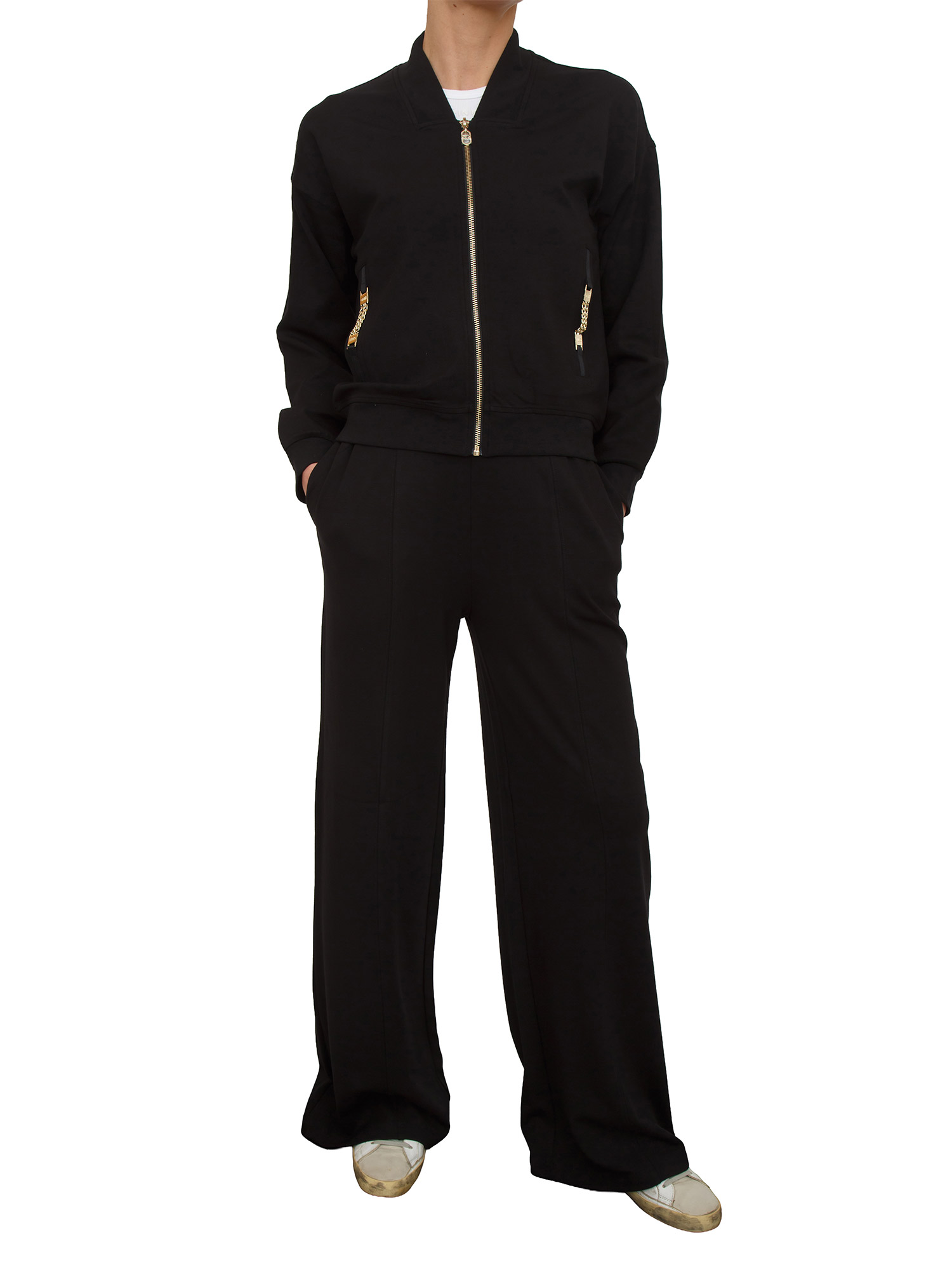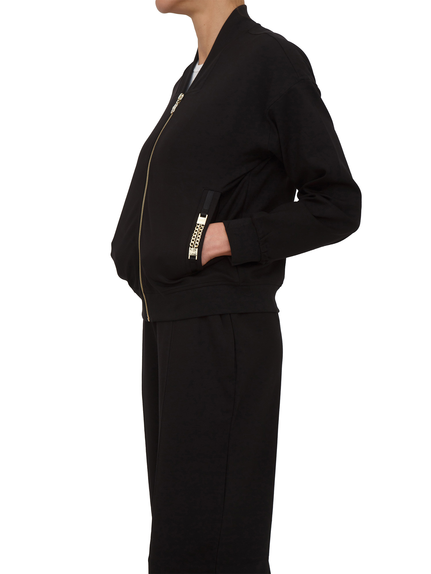 Felpa Liu Jo donna realizzata in jersey punto milano con comode tasche, dettagli chain e chiusura con zip. Modello con collo alla coreana e fit regular per un look raffinato. La modella è alta 1.72 e indossa la taglia XS.