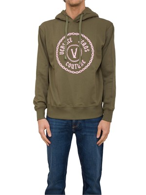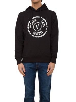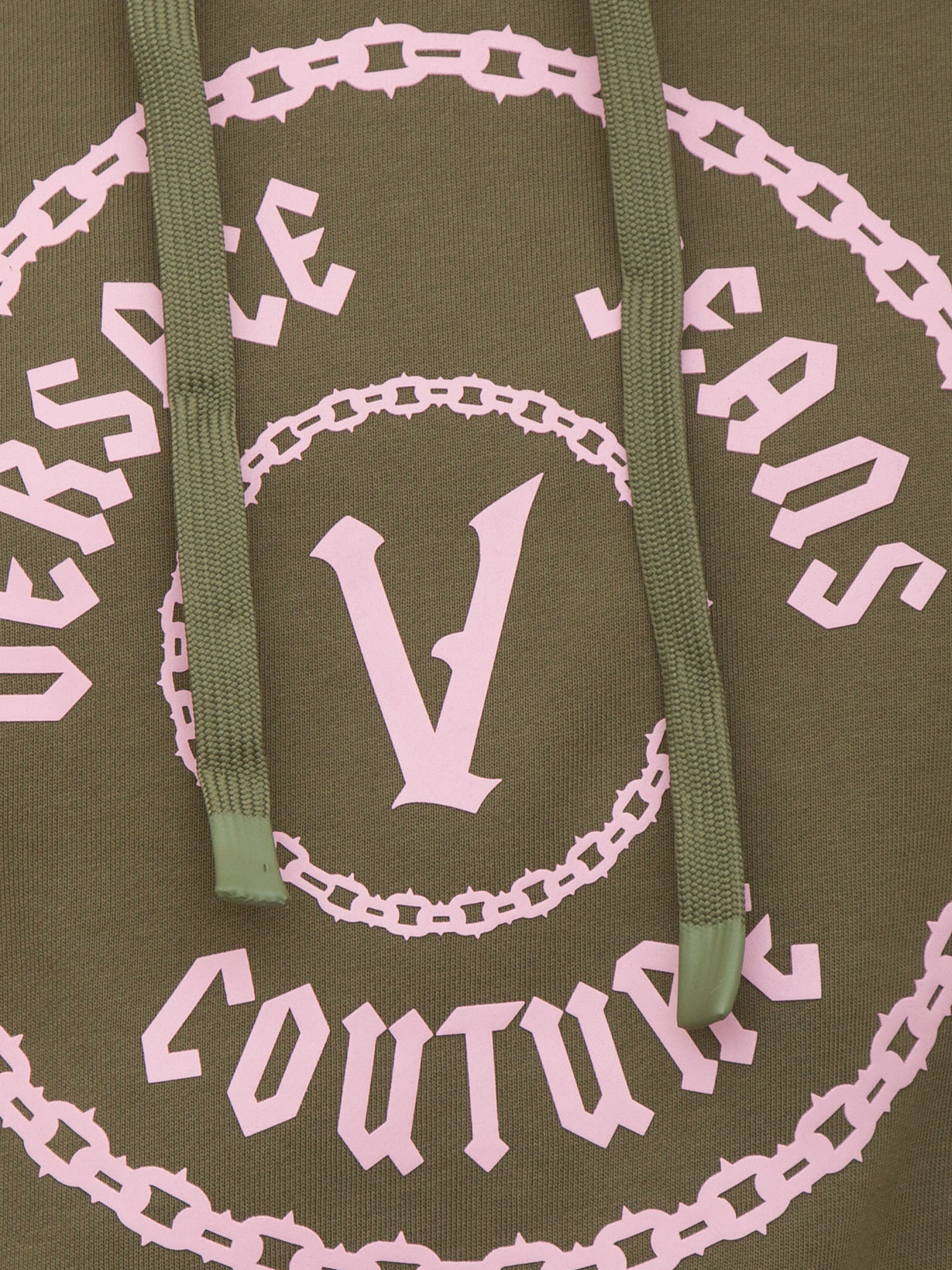 Felpa con cappuccio Versace Jeans Couture realizzata in tessuto di cotone estremamente confortevole, si distingue per la stampa in maglia che esalta il connubio perfetto tra design iconico e massimo comfort. Il taglio regular offre una vestibilità rilassata, ideale per ogni occasione. I polsini e l'orlo rifiniti con cordino elastico assicurano una tenuta ottimale, mentre il cappuccio con coulisse regolabile aggiunge funzionalità e protezione dal freddo. Un capo versatile e alla moda per completare il tuo guardaroba casual con classe.