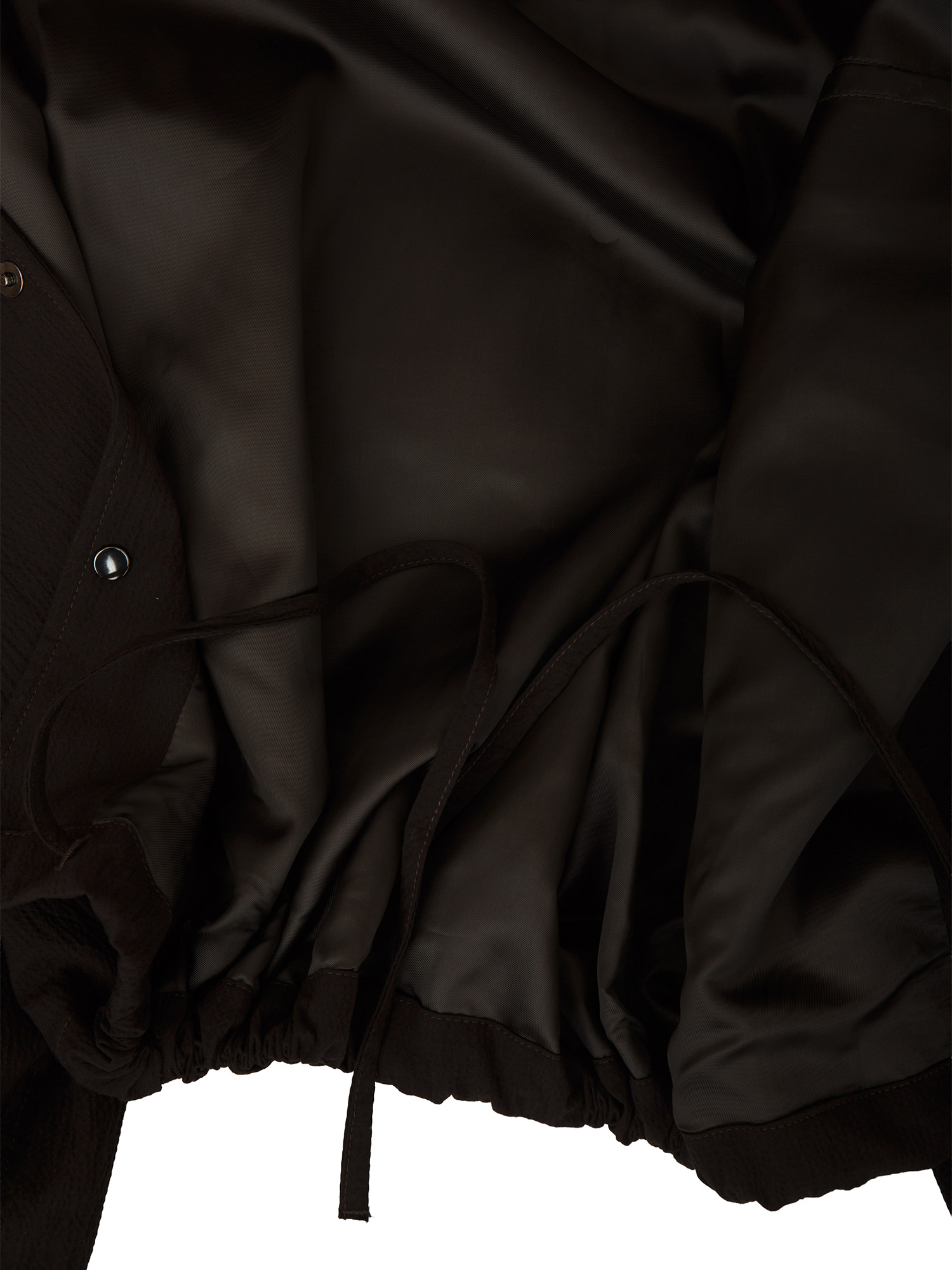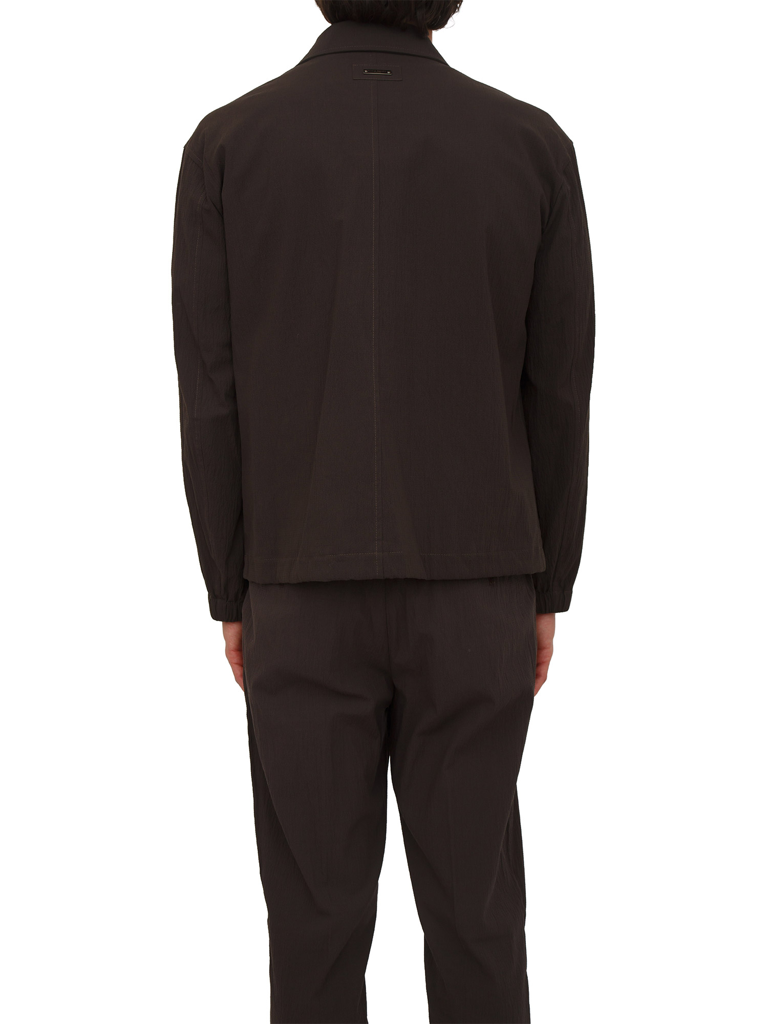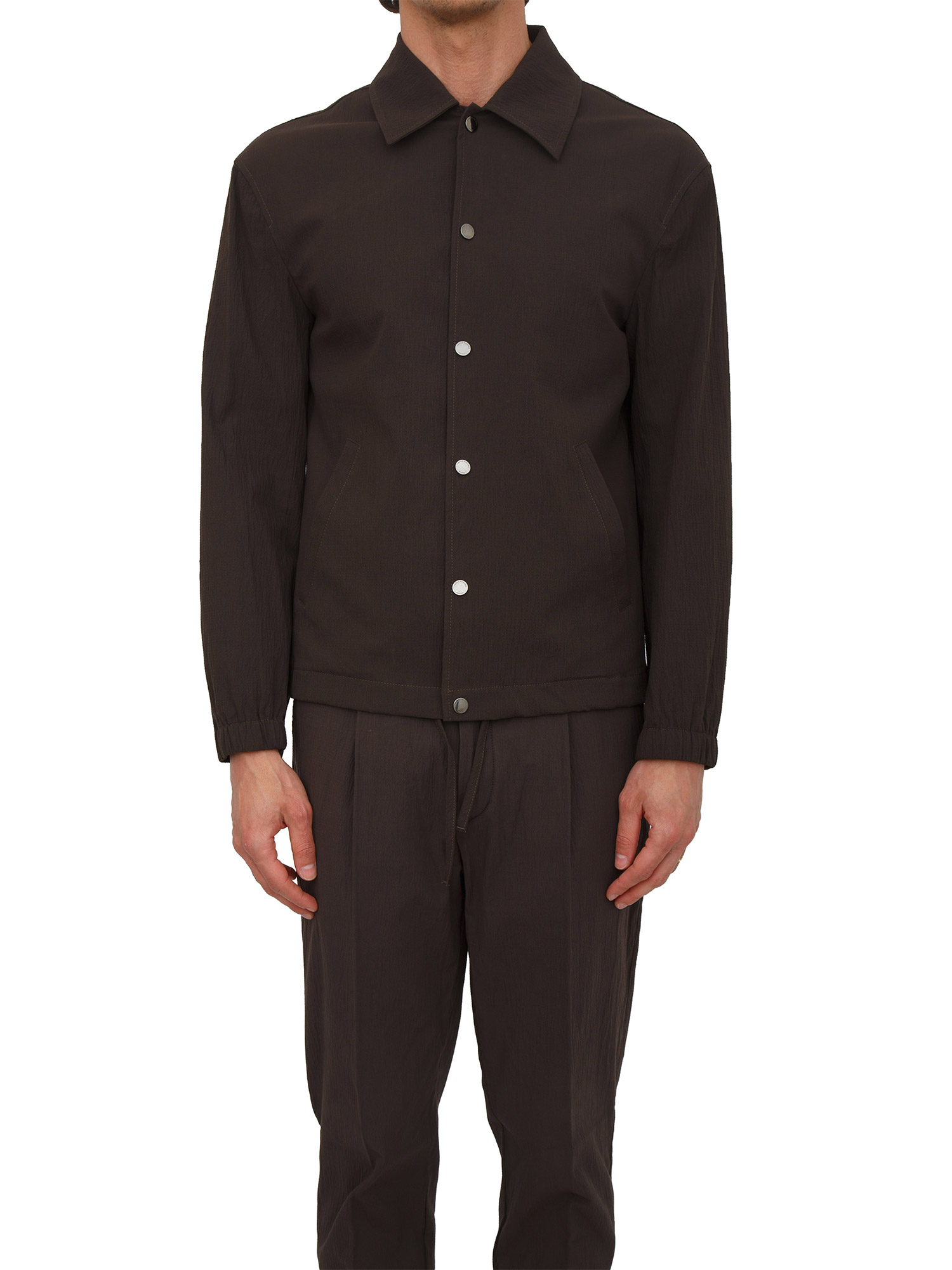 Giacca camicia Paolo Pecora in cotone elasticizzato con collo a camicia e chiusura bottoni metallici logati con chiusura automatica. Vestibilità regular con coulisse in fondo per un effetto bomber, fodera interna, tasche laterali e maniche con elastico in fondo. Il modello è alto 1.90m e indossa la taglia 48.
