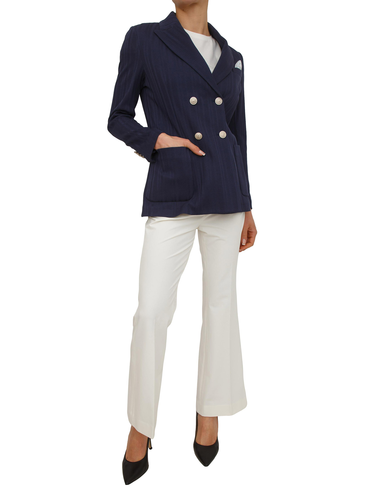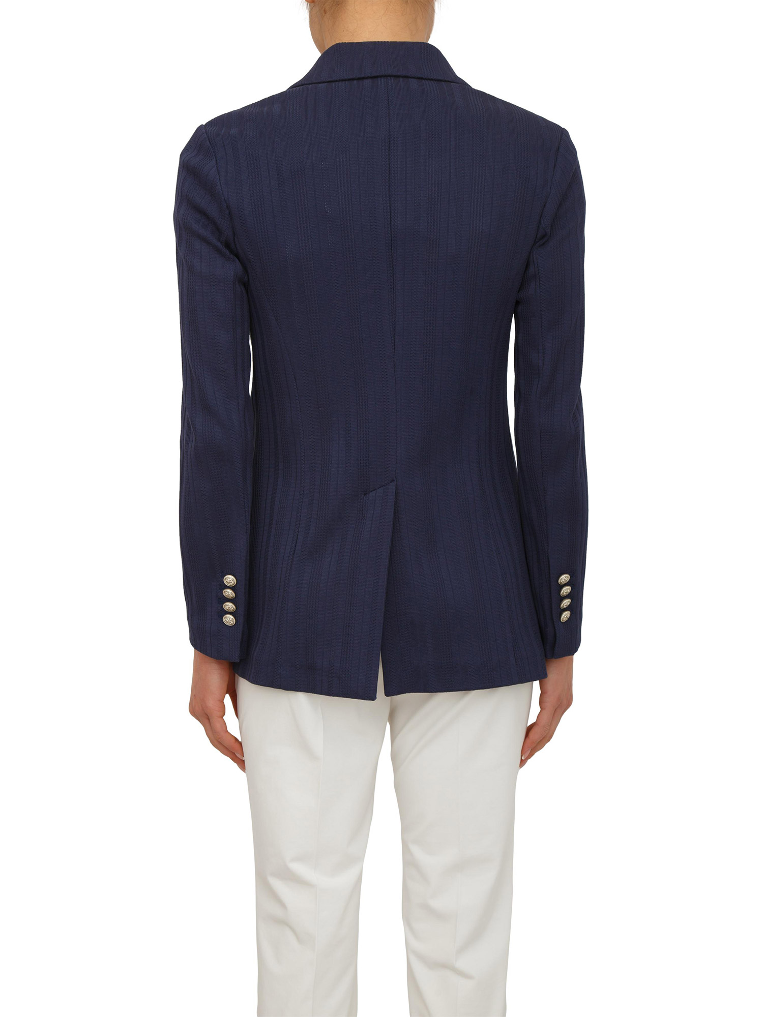 Giacca doppiopetto donna Circolo 1901 realizzata in cotone con lavorazione rigata in verticale tono su tono. Design con bottoni dorati su petto e polsi e spacco posteriore. Sfiancata e molto femminile da mixare con pantaloni bianchi o jeans. La modella è alta 1.72 e indossa la taglia 40.