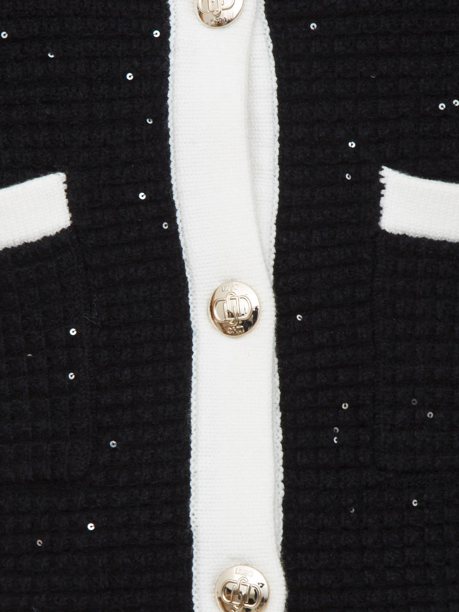 Giacca maglia Liu Jo realizzata in misto viscosa con strass e lavorazione punto waffle e chiusura con bottoni logo dorati. Taglio girocollo con taschini e tasche con bottone logo dorato. La modella è alta 1.72 e indossa la taglia S.