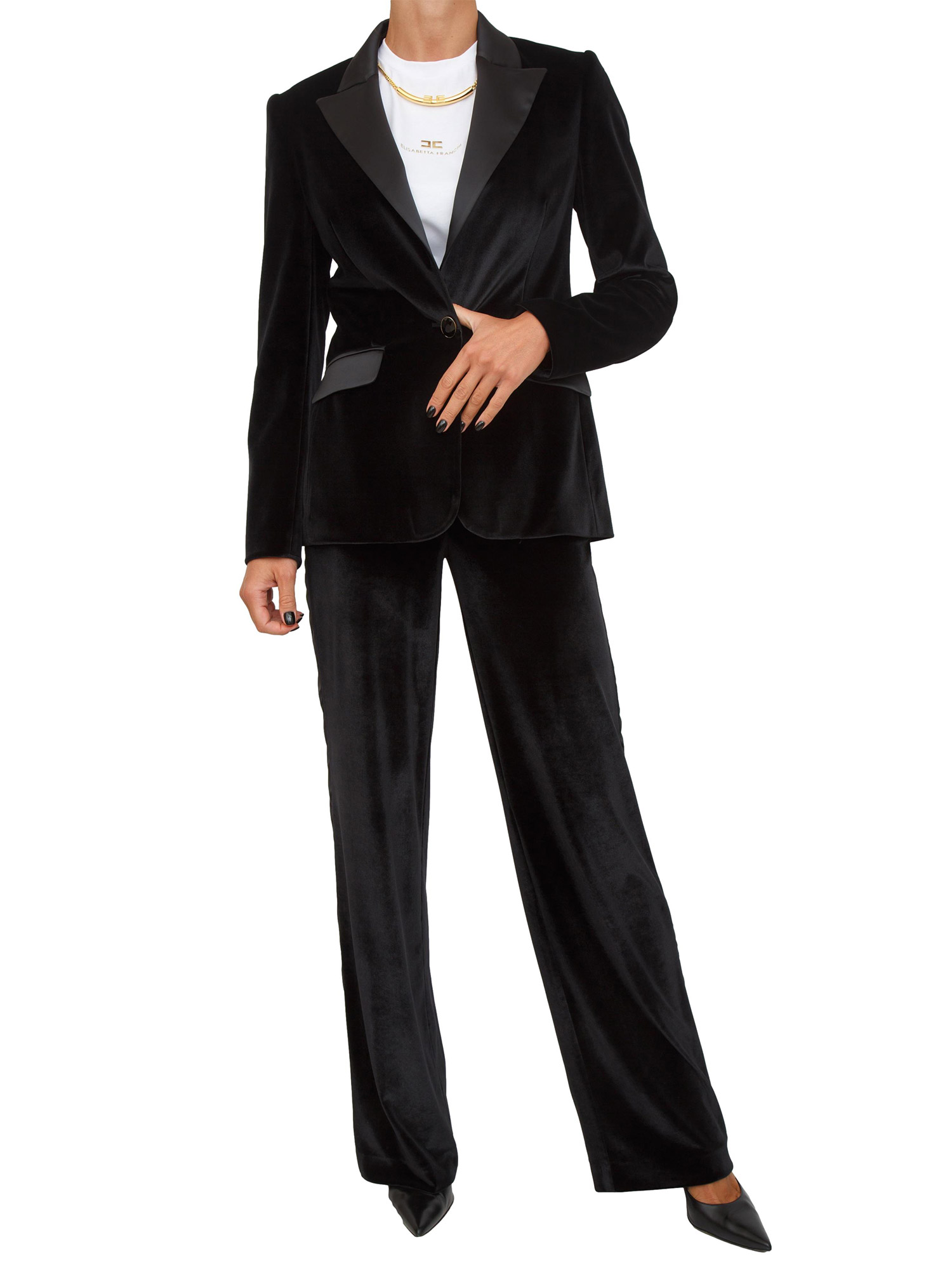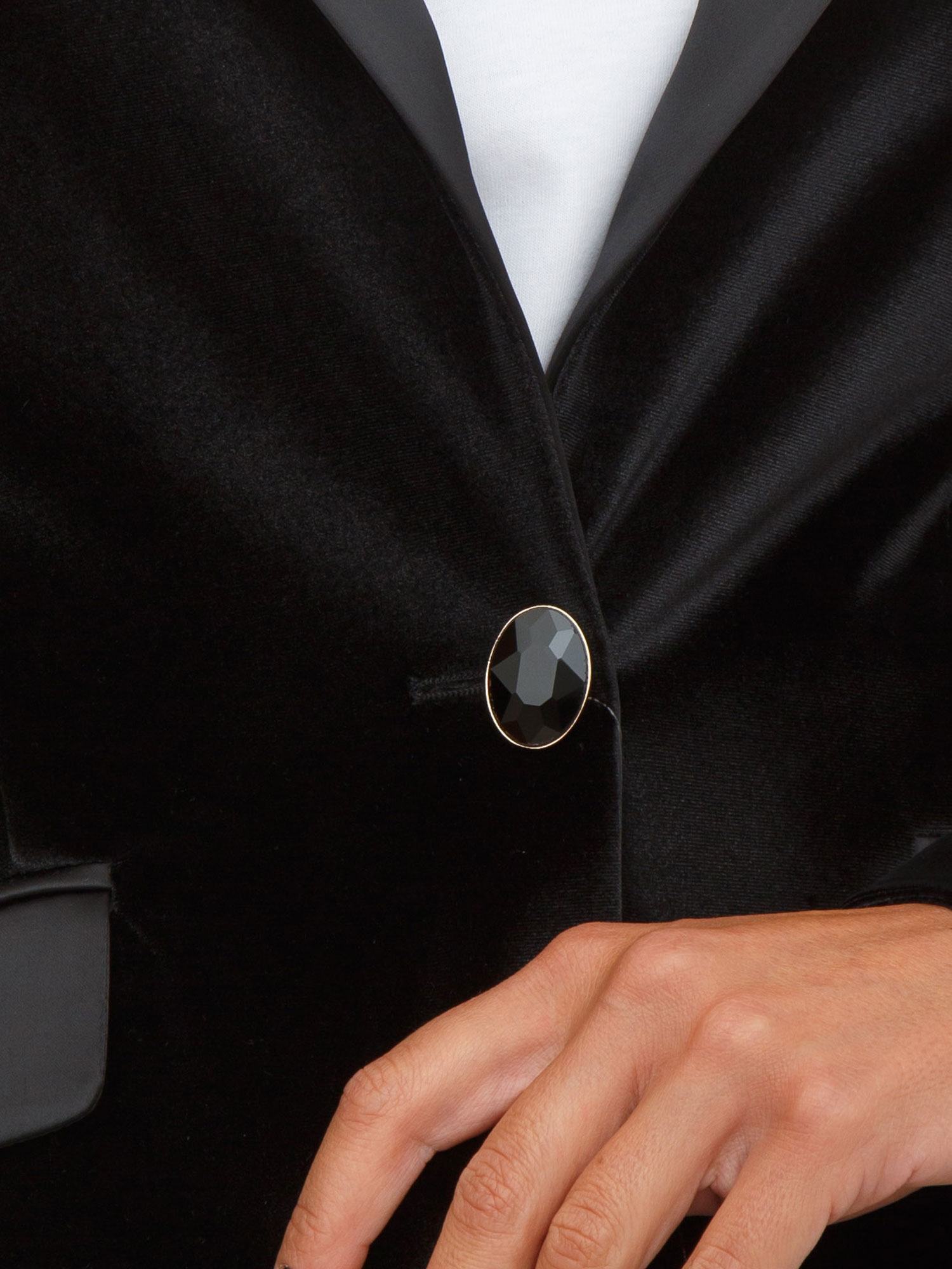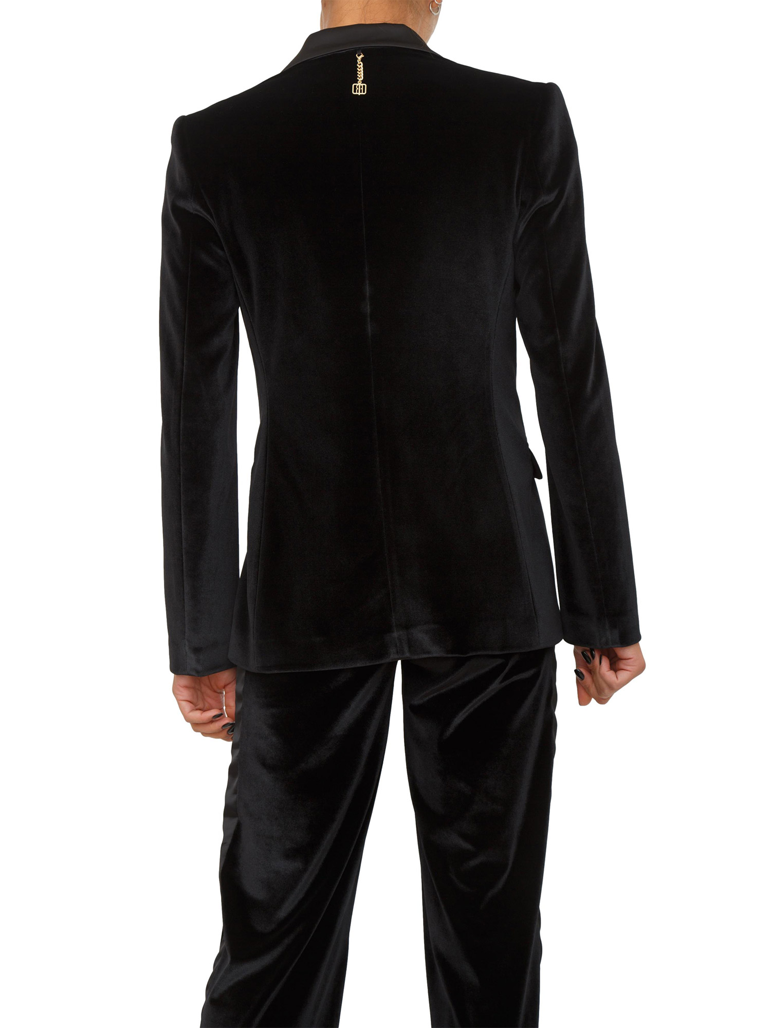 Giacca monopetto Fracomina realizzata in velluto con revers lucido e patta tasche lucido con bottone gioiello blu. Fit dritto ed elegante per sfoggiare la tua femminilità nelle occazioni importanti. La modella è alta 1.72 e indossa la taglia XS.