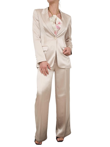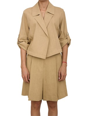 Giacca Marella in viscosa e lino stretch, realizzata con materiali provenienti da cellulosa di legno, rispettando il patrimonio forestale. Il capo presenta un elegante scollo con rever e dettagli in seta habotai lavata, per un tocco di raffinatezza. La vestibilità è dritta, leggermente svasata al fondo, mentre le maniche a tre quarti sono arricchite da un alamaro al polso.