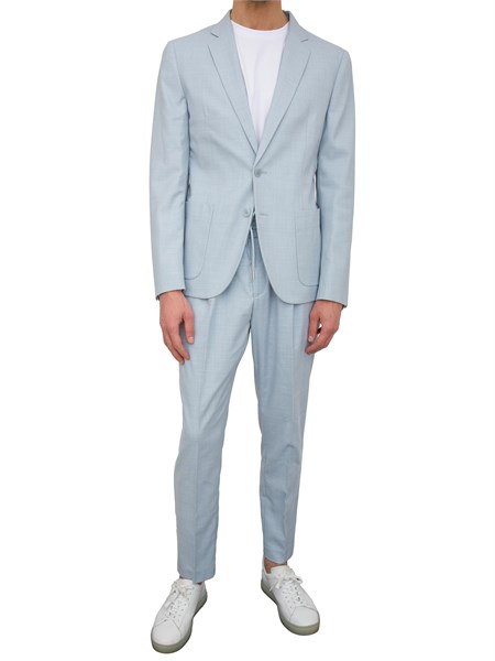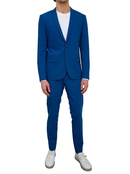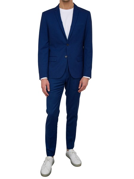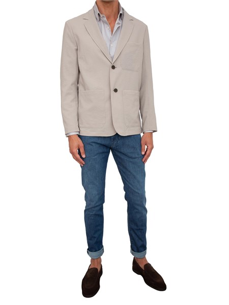 Giacca dal taglio slim realizzata in tessuto misto lino, questo modello monopetto a due bottoni è disegnata con due tasche laterali e quattro bottoni sul fondo manica.Il modello è alto 1.90m e indossa la taglia 48.