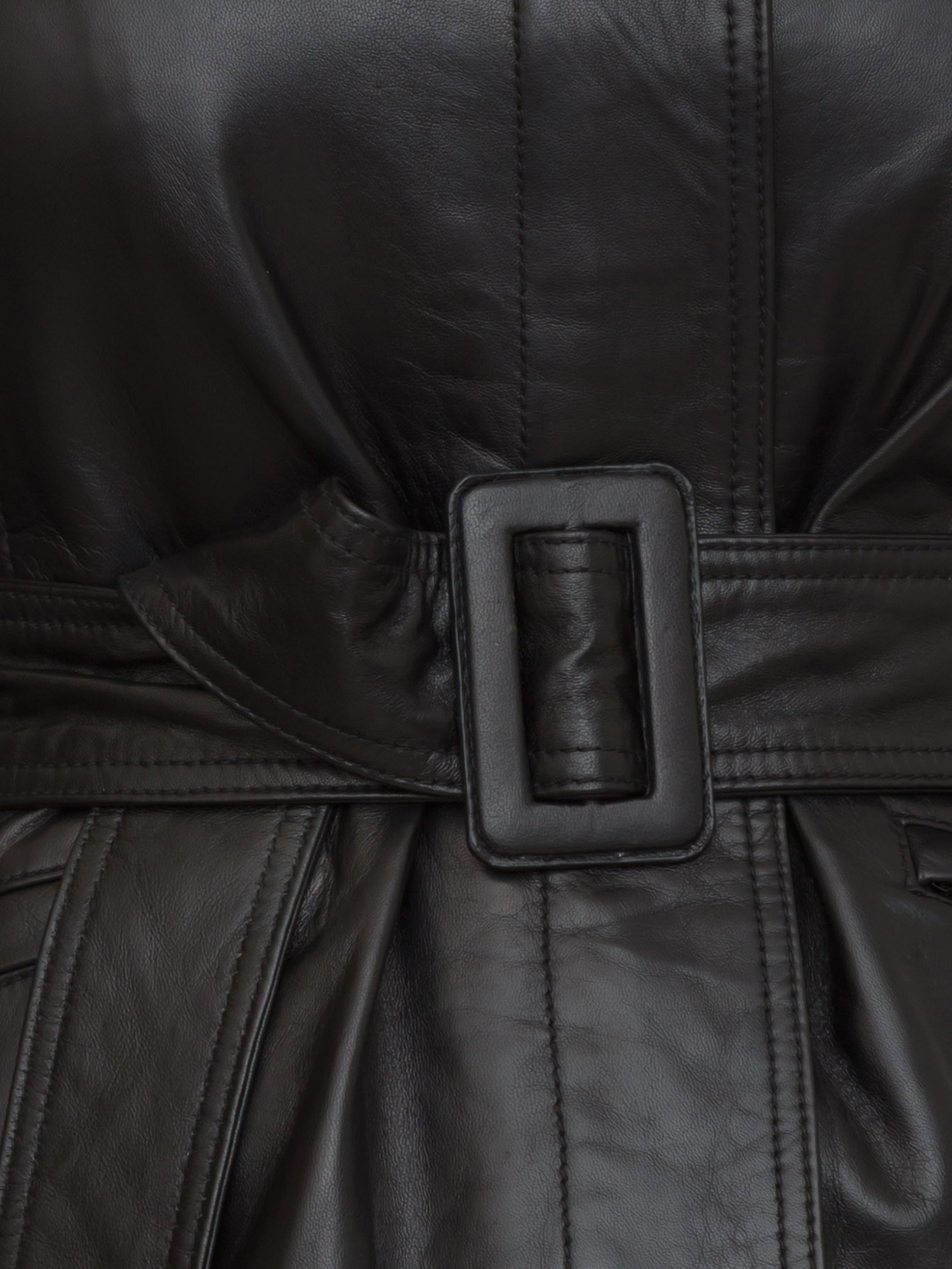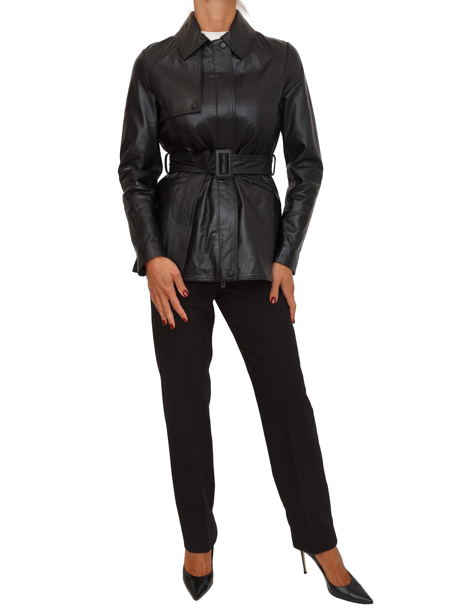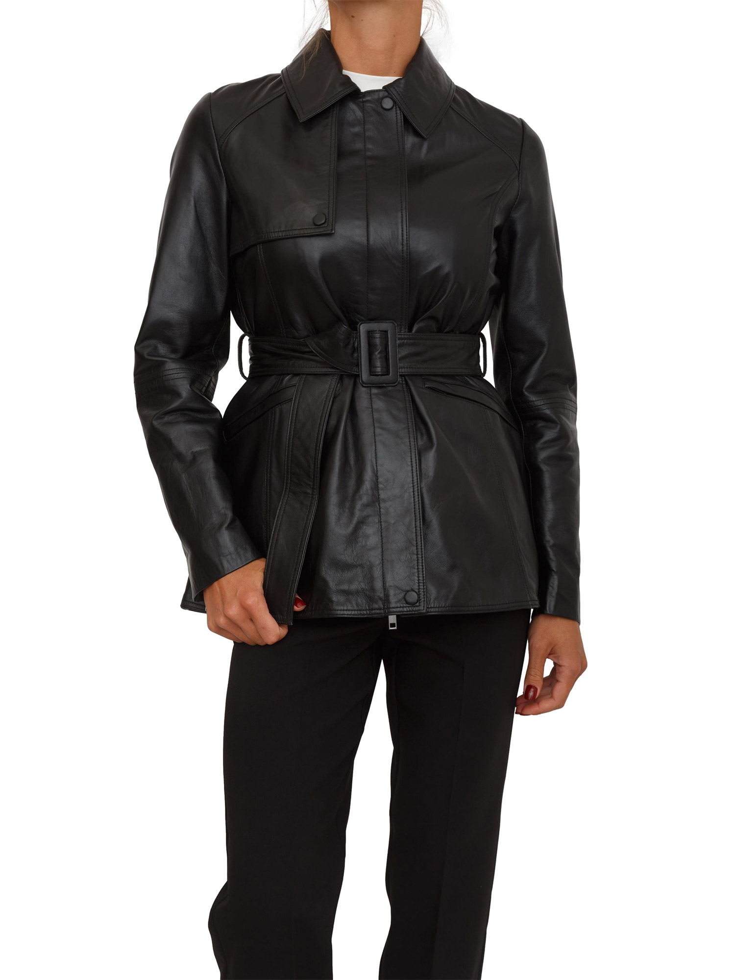 Attitude dichiaratamente metropolitana per la giacca in pelle Marella con collo a camicia e bavoletta sulla spalla. Da stringere in vita con la cintura coordinata in un gioco di volumi da personalizzare. Chiusura con zip nascosta. La modella è alta 1.72 e indossa la taglia 40.