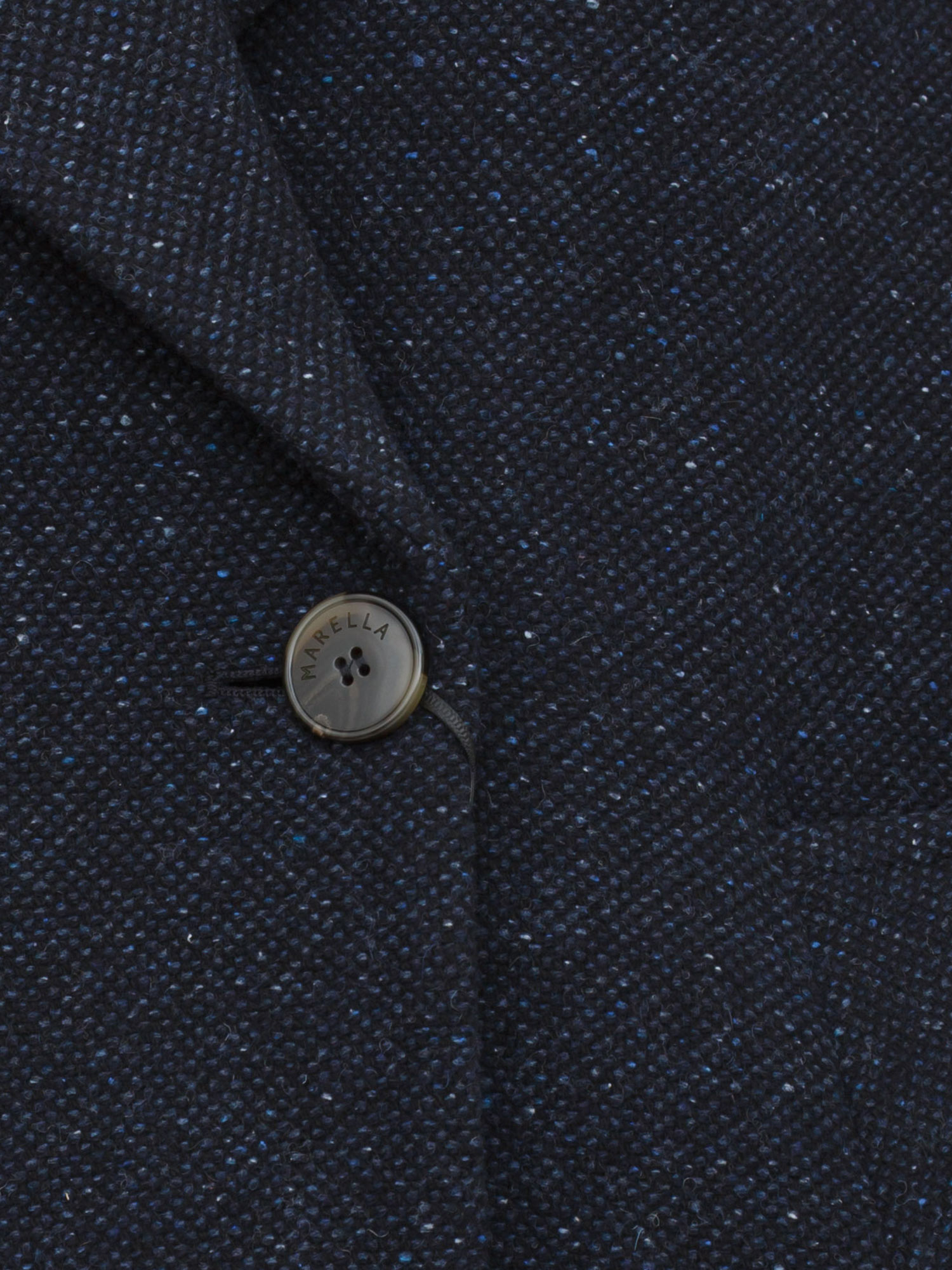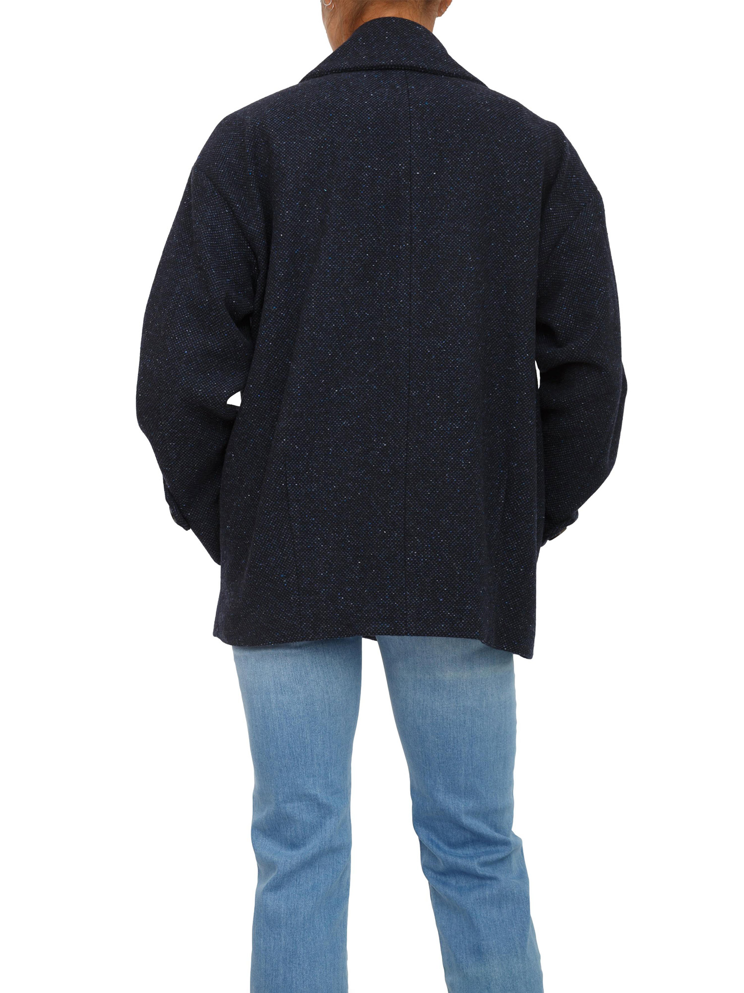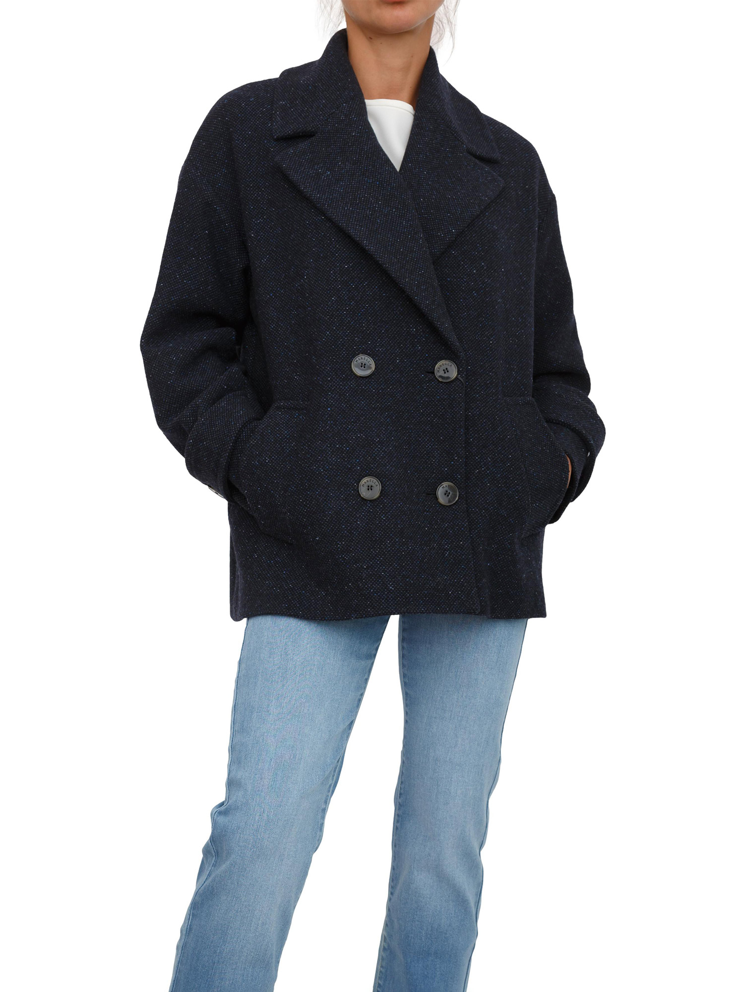 Giaccone in donegal bottonato di misto lana e seta con fodera interna, fit dritto, scollo con rever, chiusura a doppiopetto con bottoni e tasche laterali con patta. La modella è alta 1.72 e indossa la taglia 40.