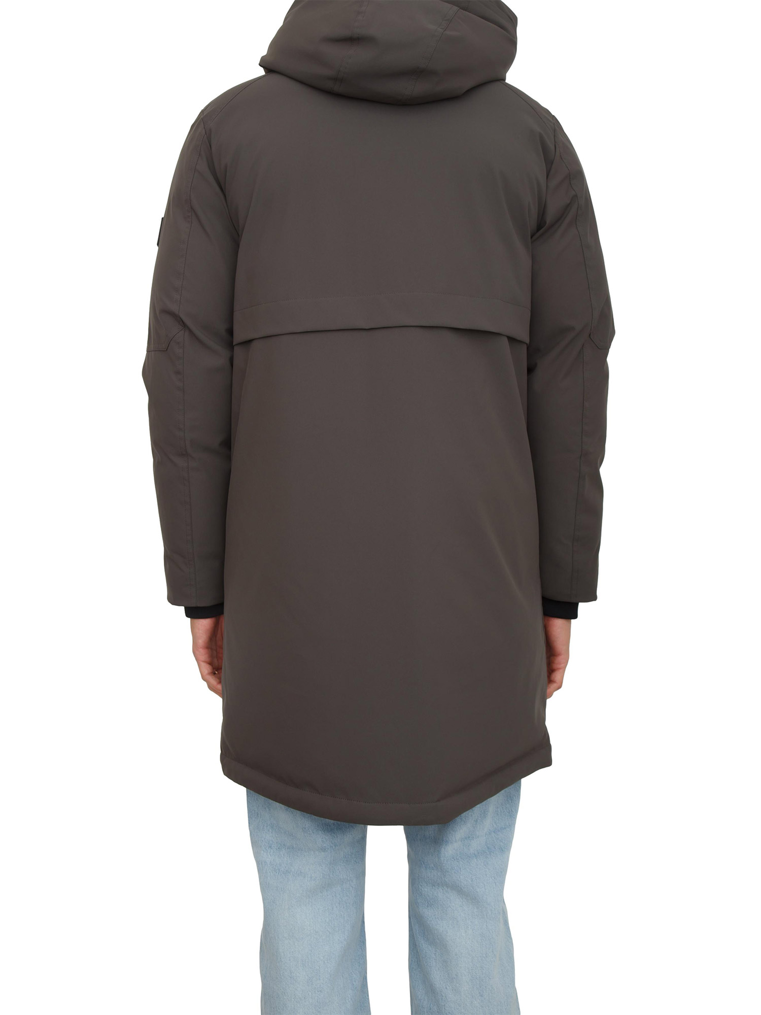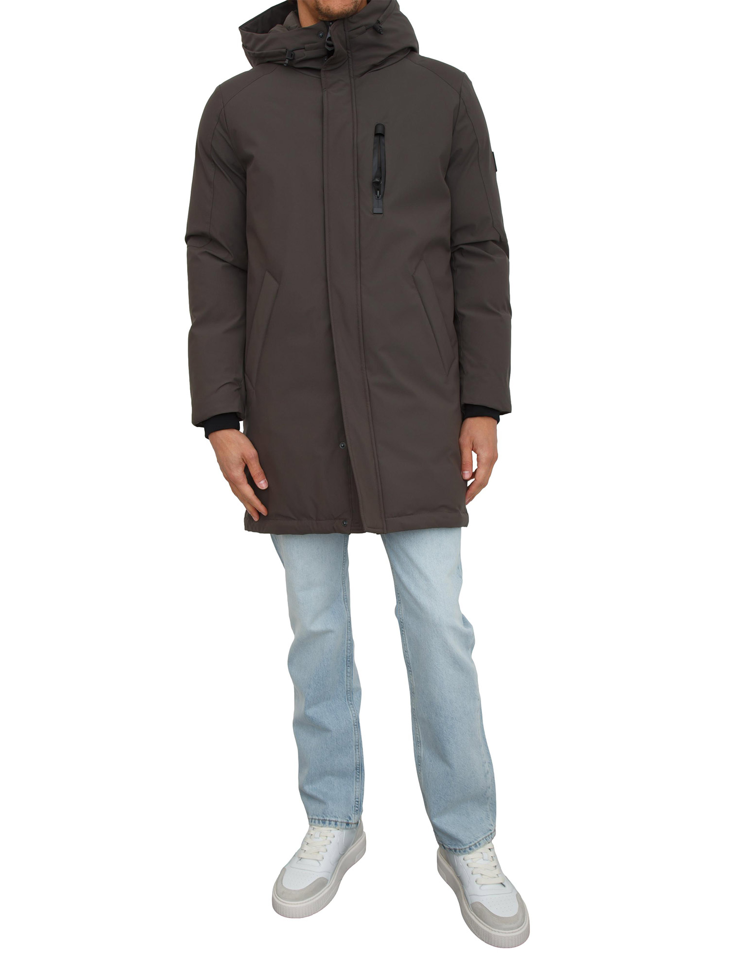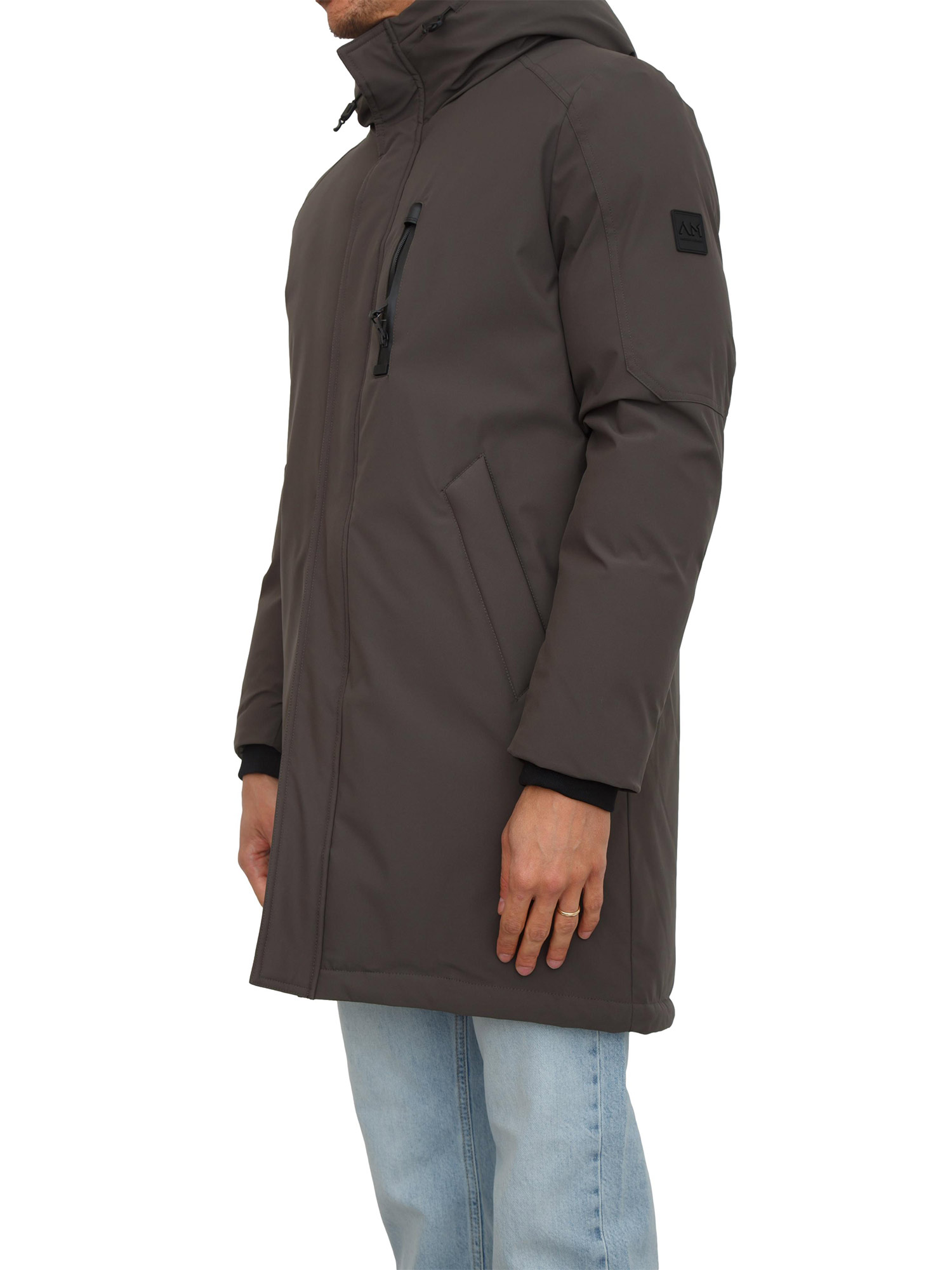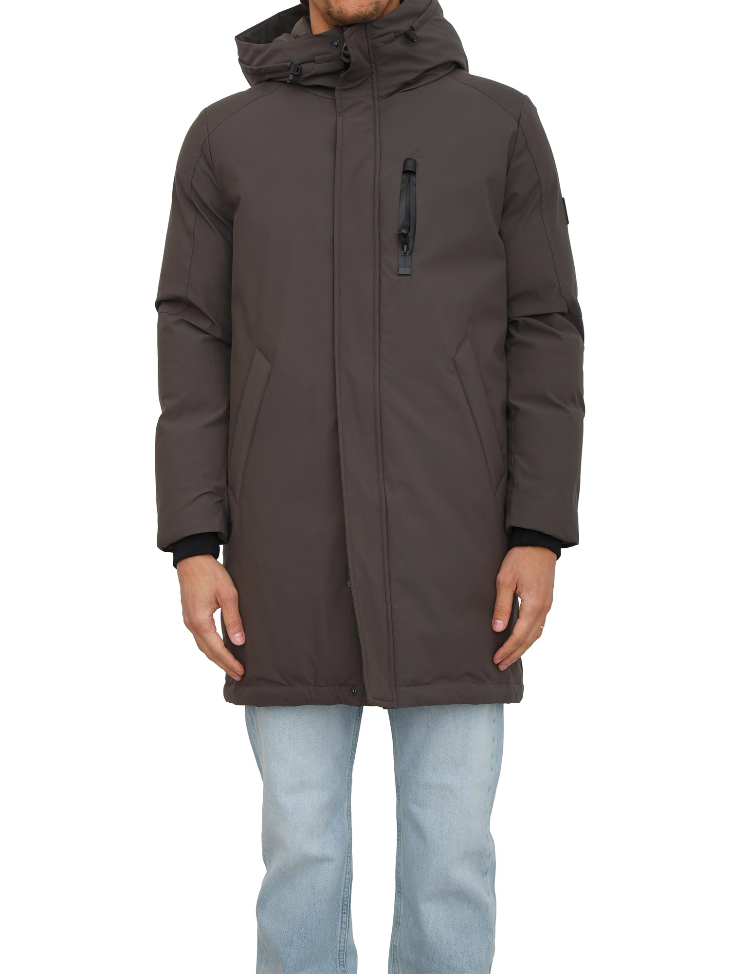 Giaccone parka Antony Morato in tessuto tecnico waterproof con vestibilità regular. Eco-imbottitura DuPont Sorona®, cappuccio non rimovibile, chiusura zip doppio cursore e bottoni. Tasche laterali e tasca con zip sul petto, polsini in maglia e piccola patch logata sulla manica. Il modello è alto 1.90m e indossa la taglia 48.