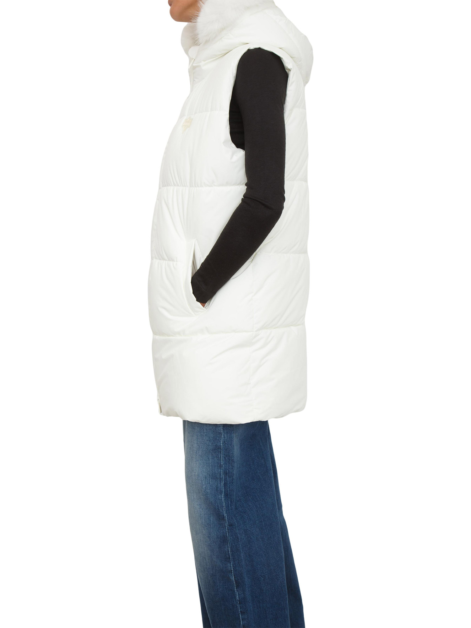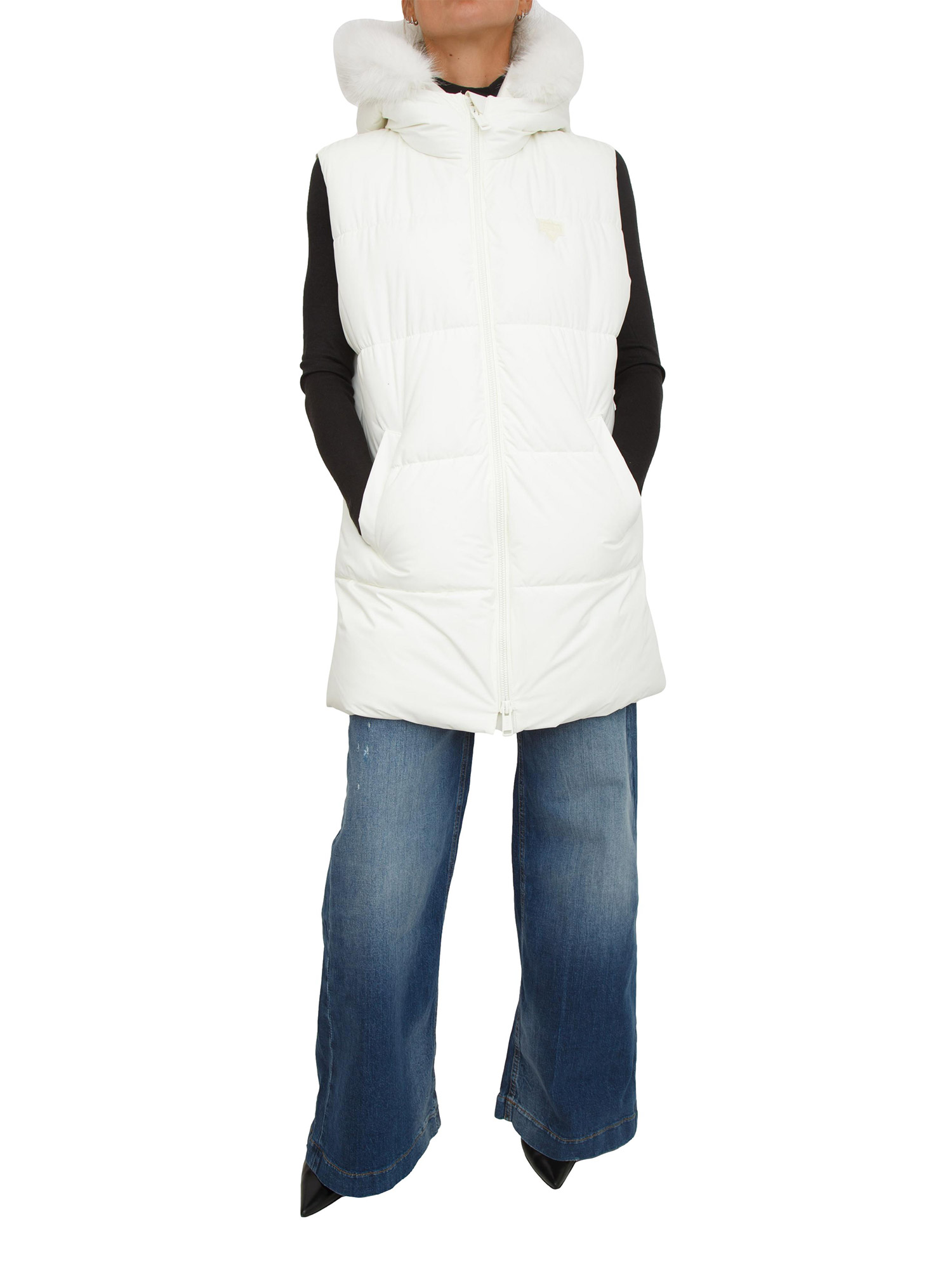 Gilet da sci Guess Jeans donna resistente all’acqua e antivento. Cappuccio con collo in pelliccia sintetica. Chiusura frontale con zip impermeabile. Imbottito, con vestibilità slim. La modella è alta 1.72 e indossa la taglia S.