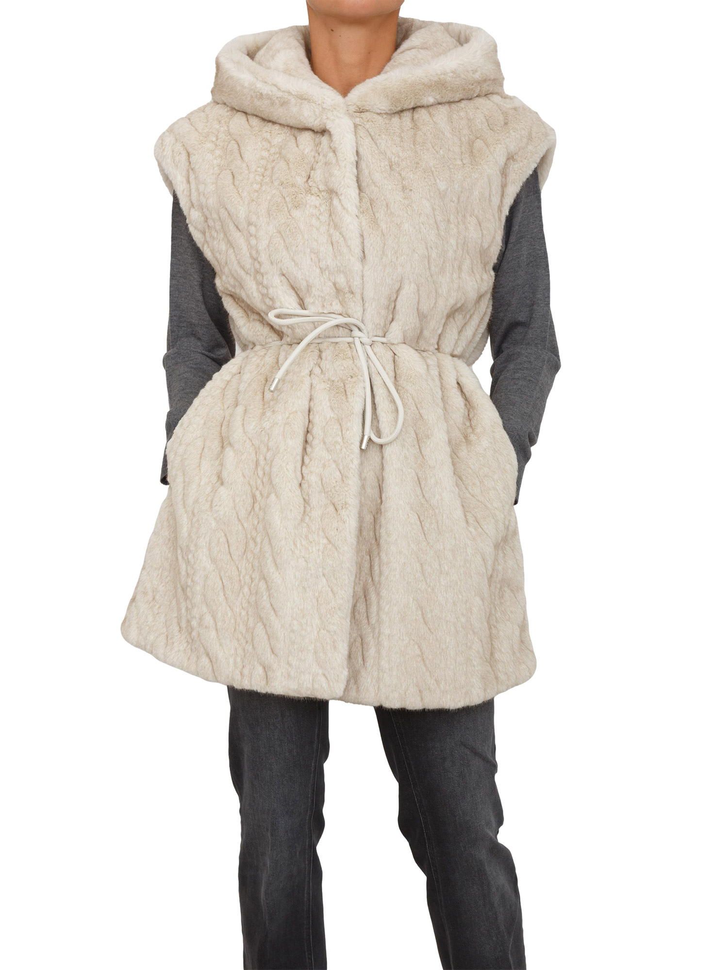 Morbido gilet Liu Jo realizzato in pelliccia sintetica con cappuccio e trecce sul davanti. Design con chiusura bottoni a pressione, cintura in abbinamento e comode tasche. La modella è alta 1.72 e indossa la taglia 42.